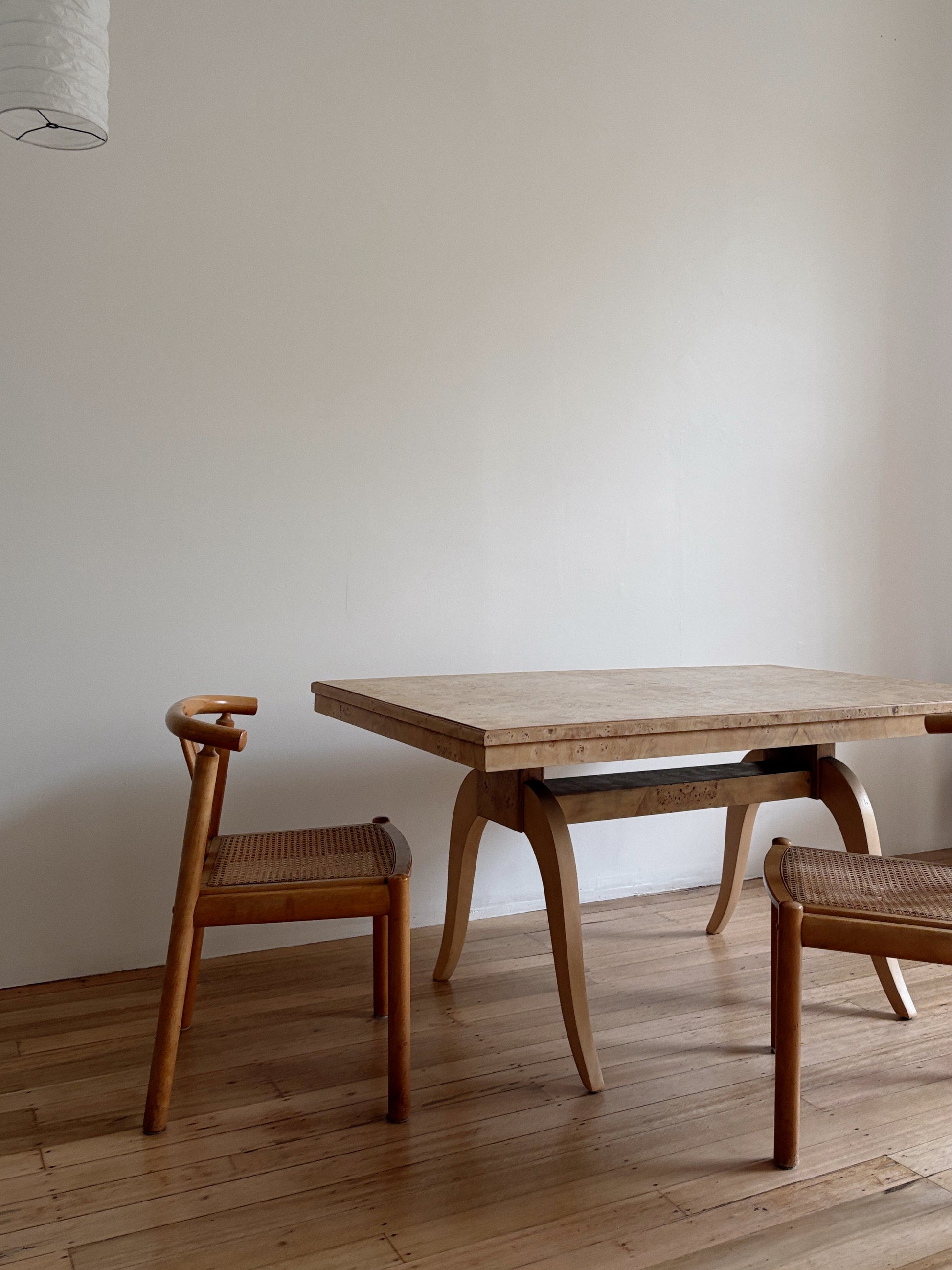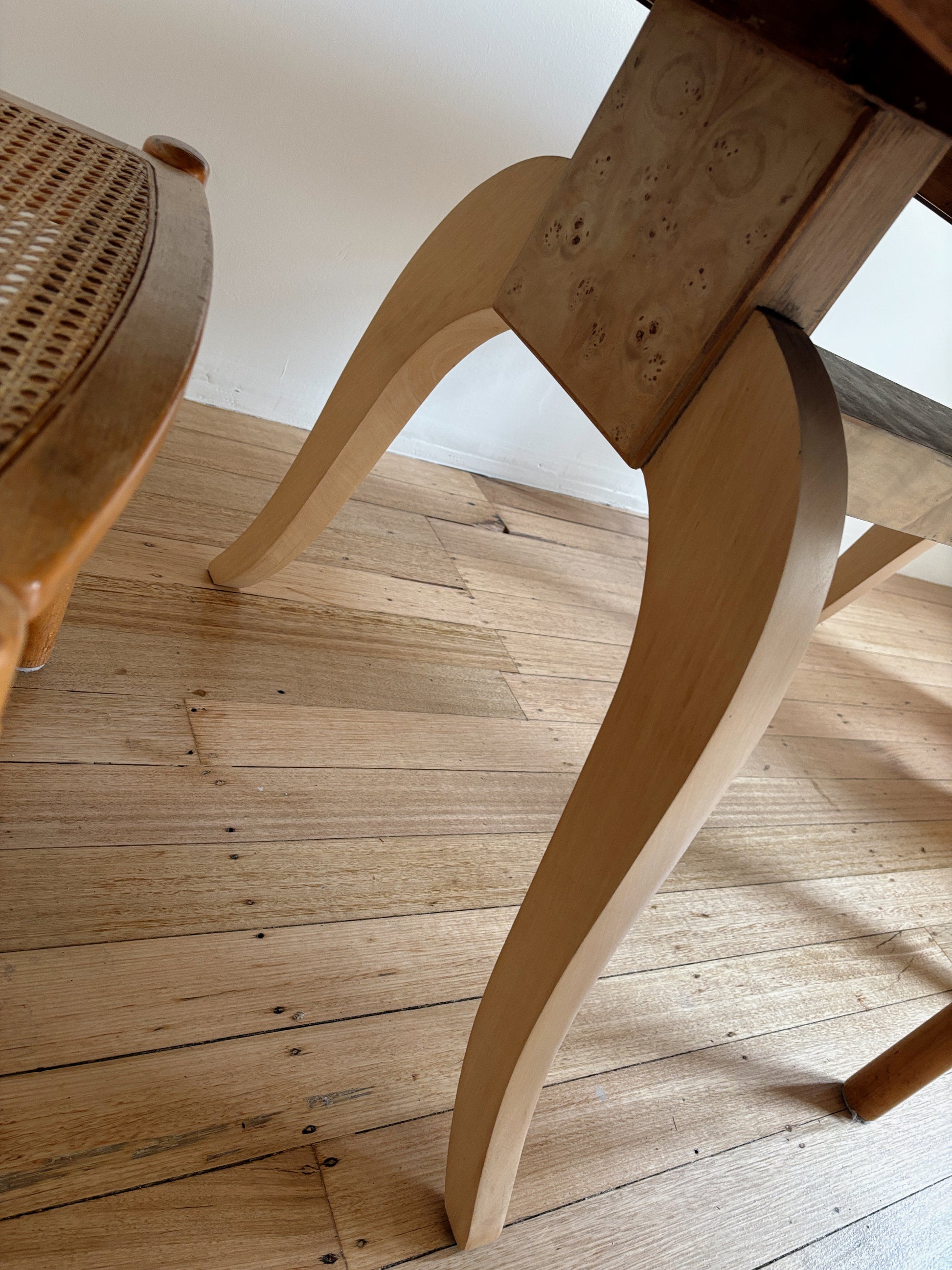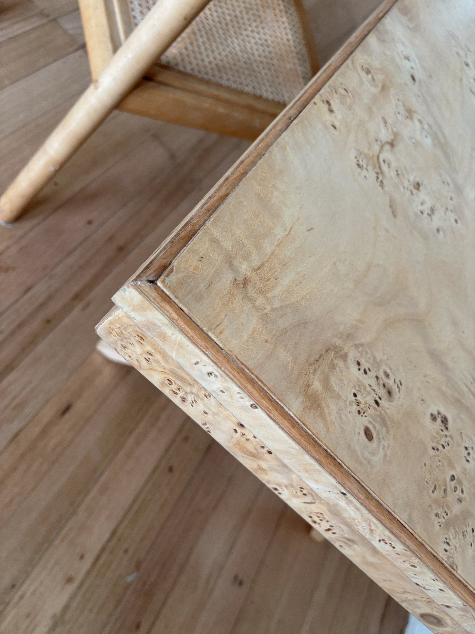 Absolutely lovely 1960s 4-6 seat burl dining table in great vintage condition. Incredible pale maple burl top floats atop combined burl/oak curved legs, old lacquer and paint has been stripped back to reveal the detailed burl. Finished with a matt sealer to protect, we're completely obsessed with letting the colour of the original timber and burl pattern shine through. Some small signs of wear and tear still present, please see pics.