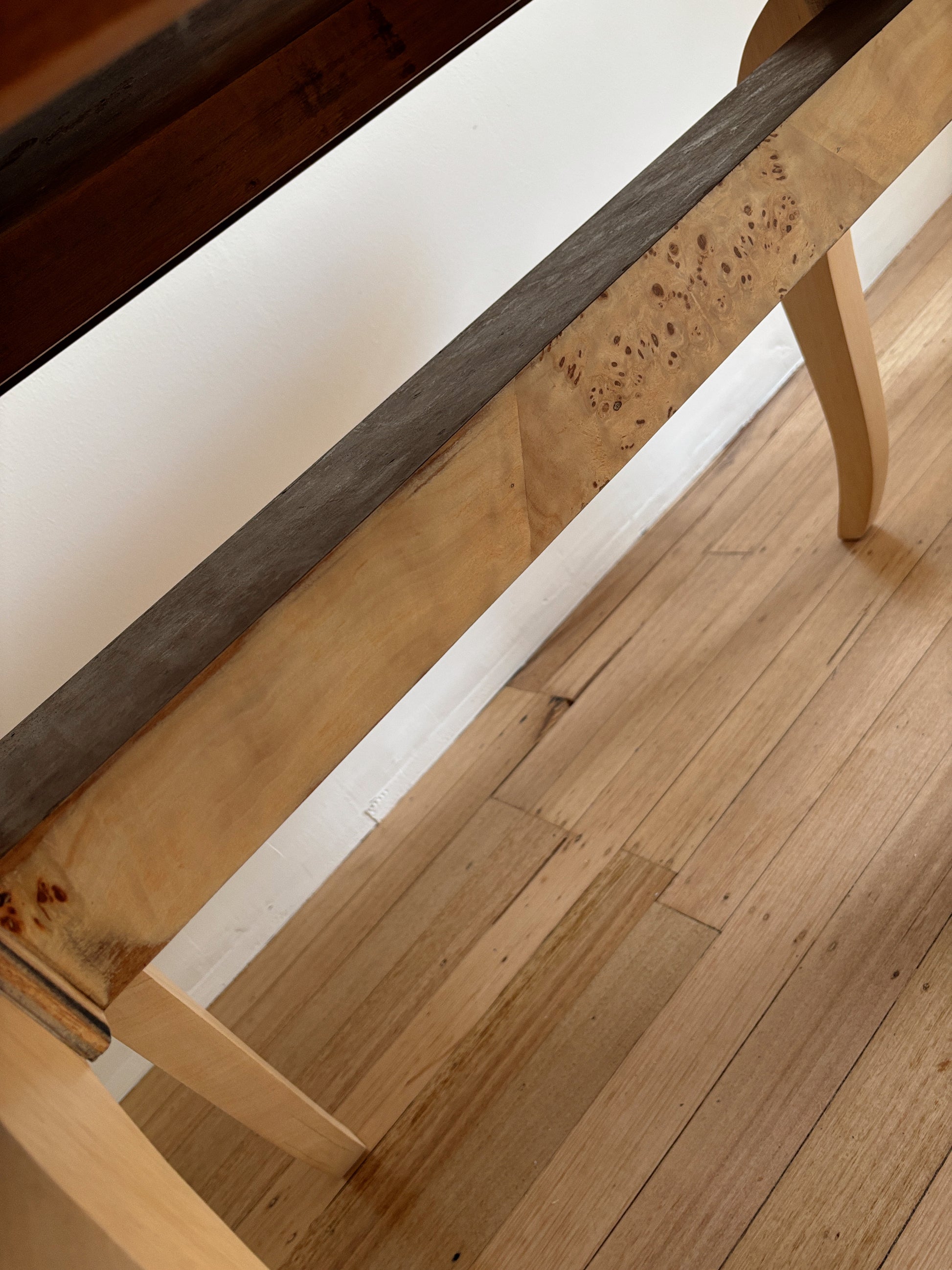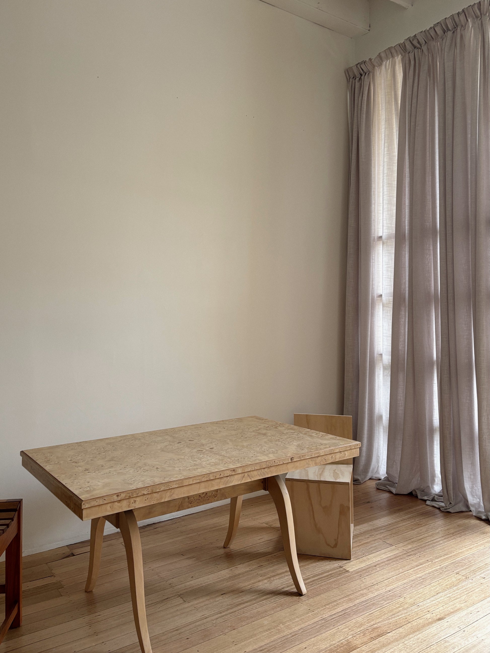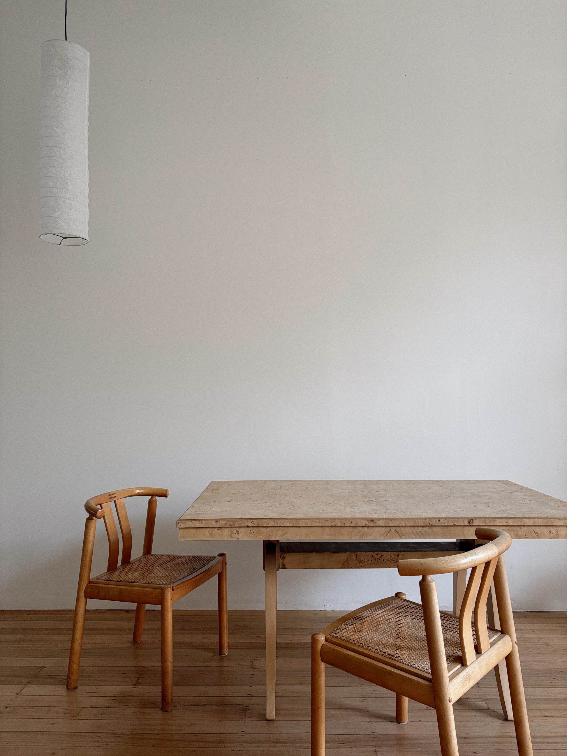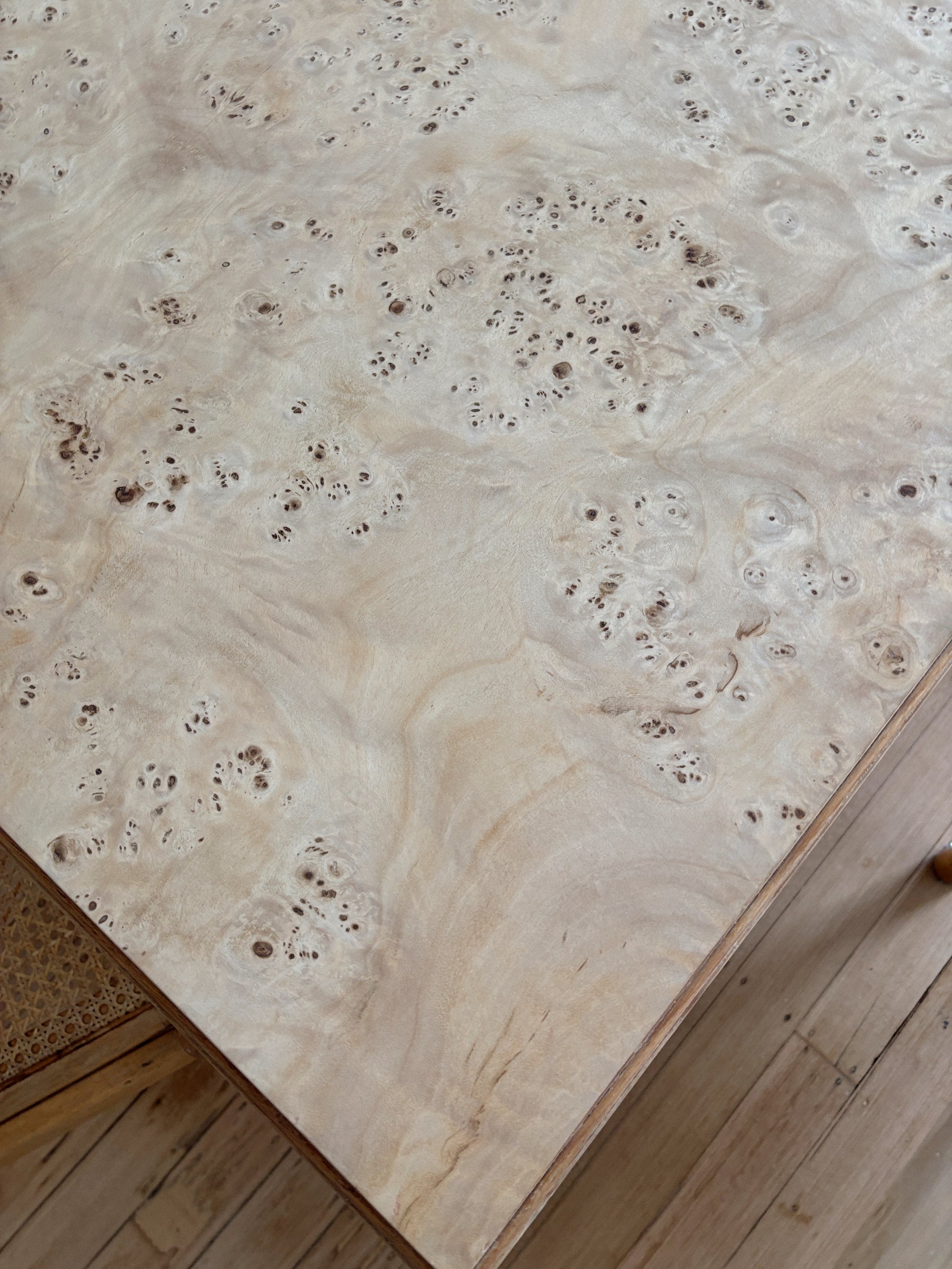 Absolutely lovely 1960s 4-6 seat burl dining table in great vintage condition. Incredible pale maple burl top floats atop combined burl/oak curved legs, old lacquer and paint has been stripped back to reveal the detailed burl. Finished with a matt sealer to protect, we're completely obsessed with letting the colour of the original timber and burl pattern shine through. Some small signs of wear and tear still present, please see pics.