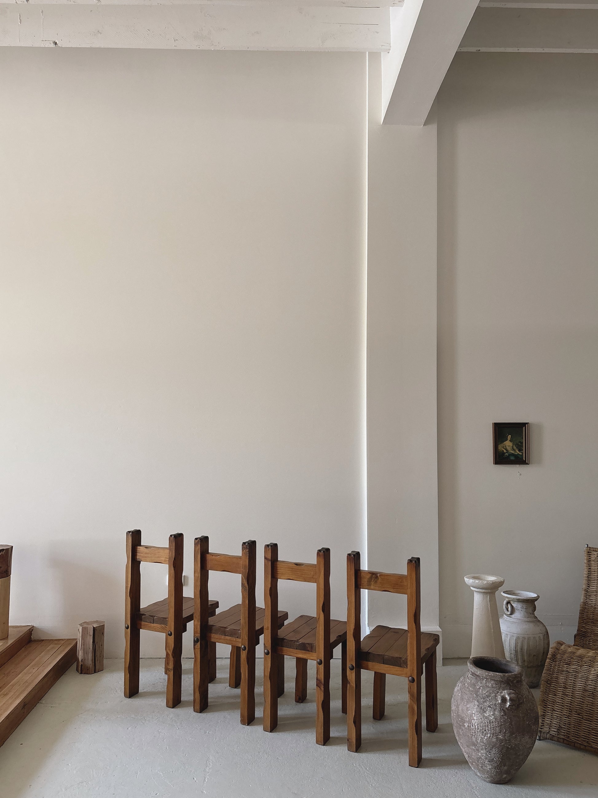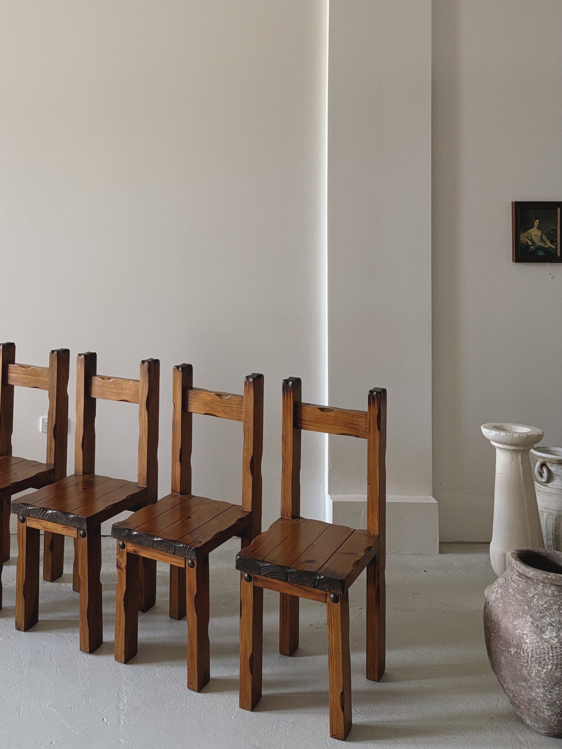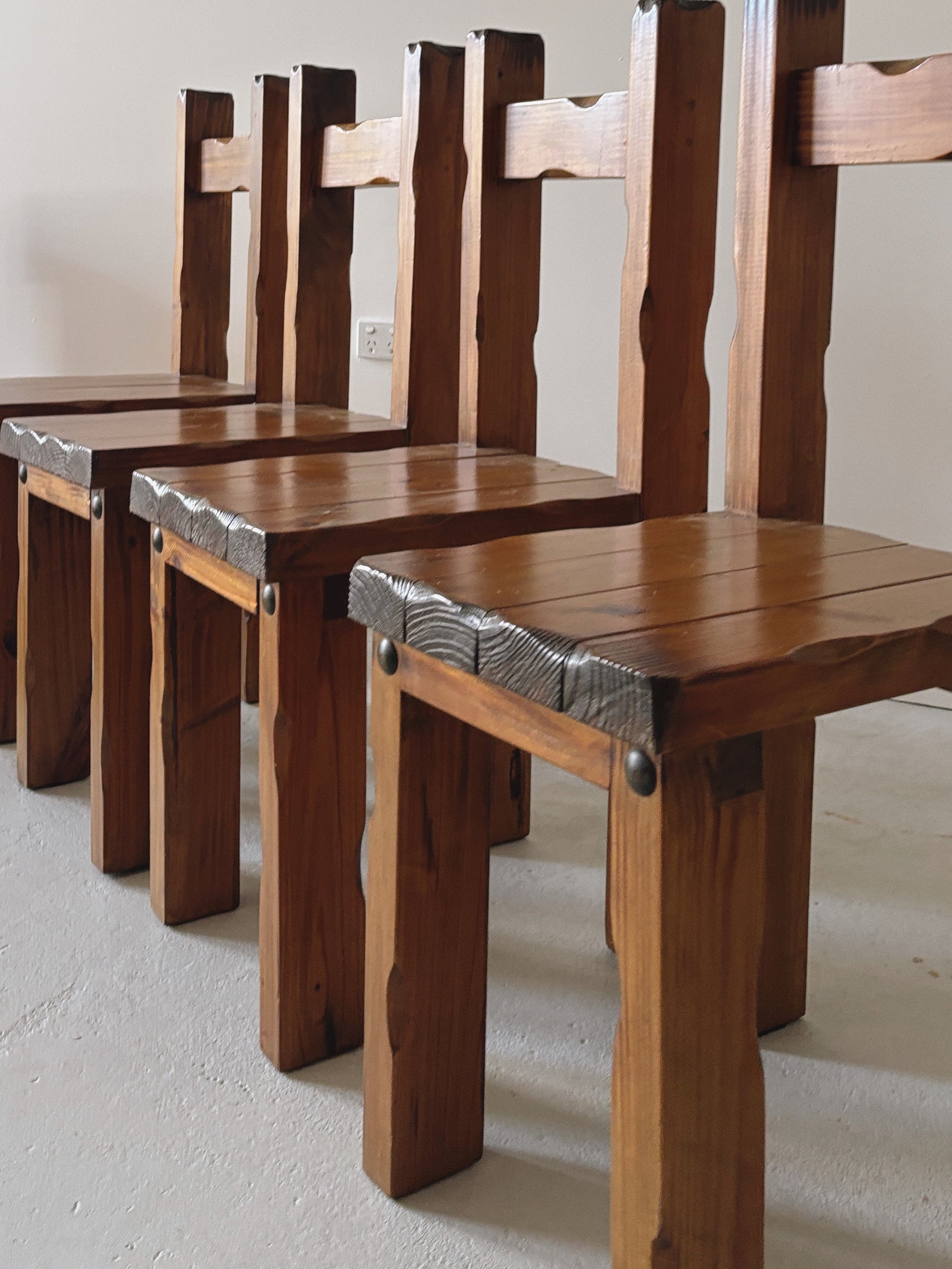 1970s brutalist chairs in great vintage condition. No words for these babies! Solid, chunky, with each edge carved into wavy detail, timber plugs, the character on these is off the charts. Originally part of a dining set, we have decided to sell these separately as I think they would also make a brilliant statement chair. We have 8 chairs in total. Comfortable, and heavy!