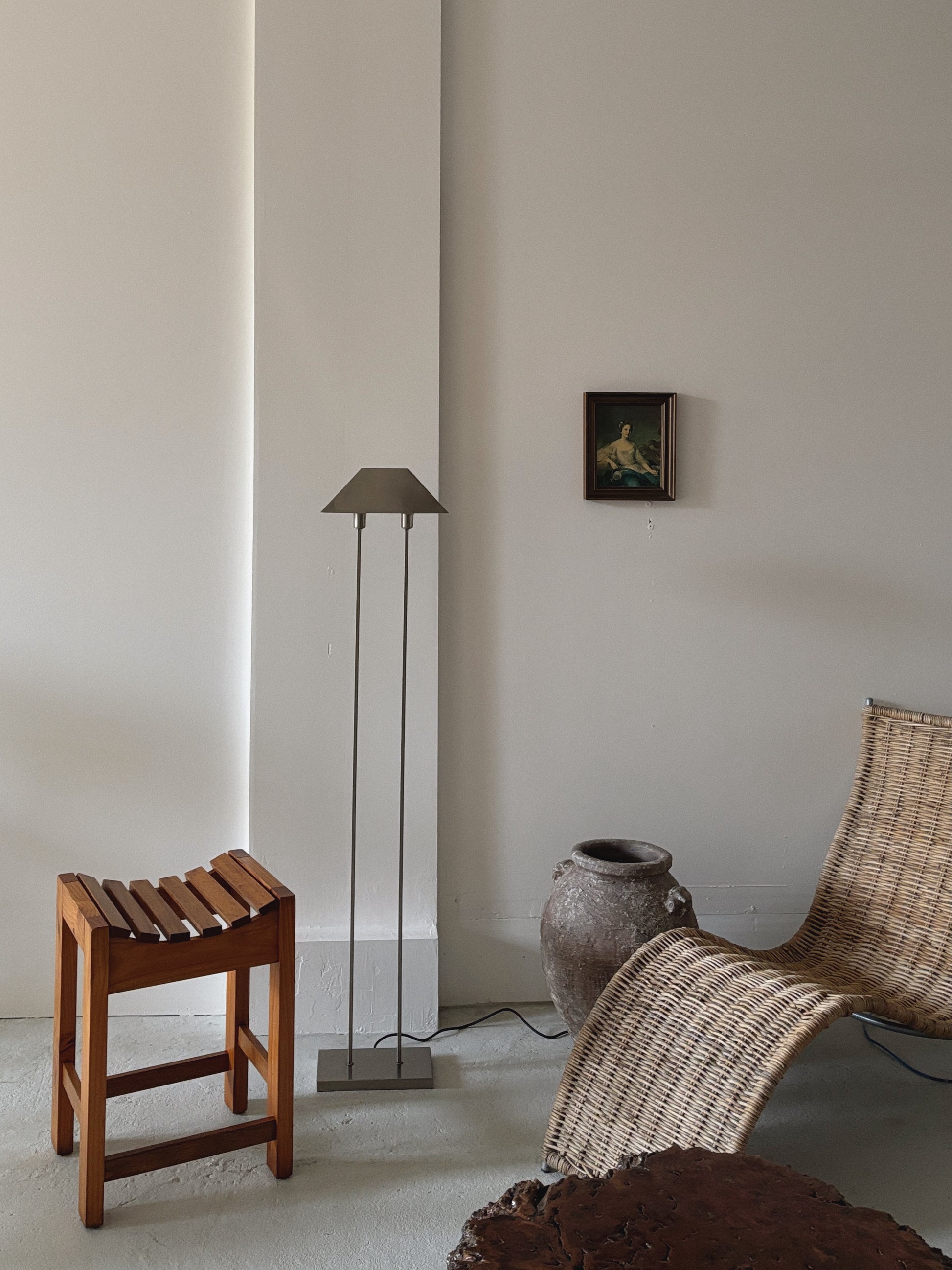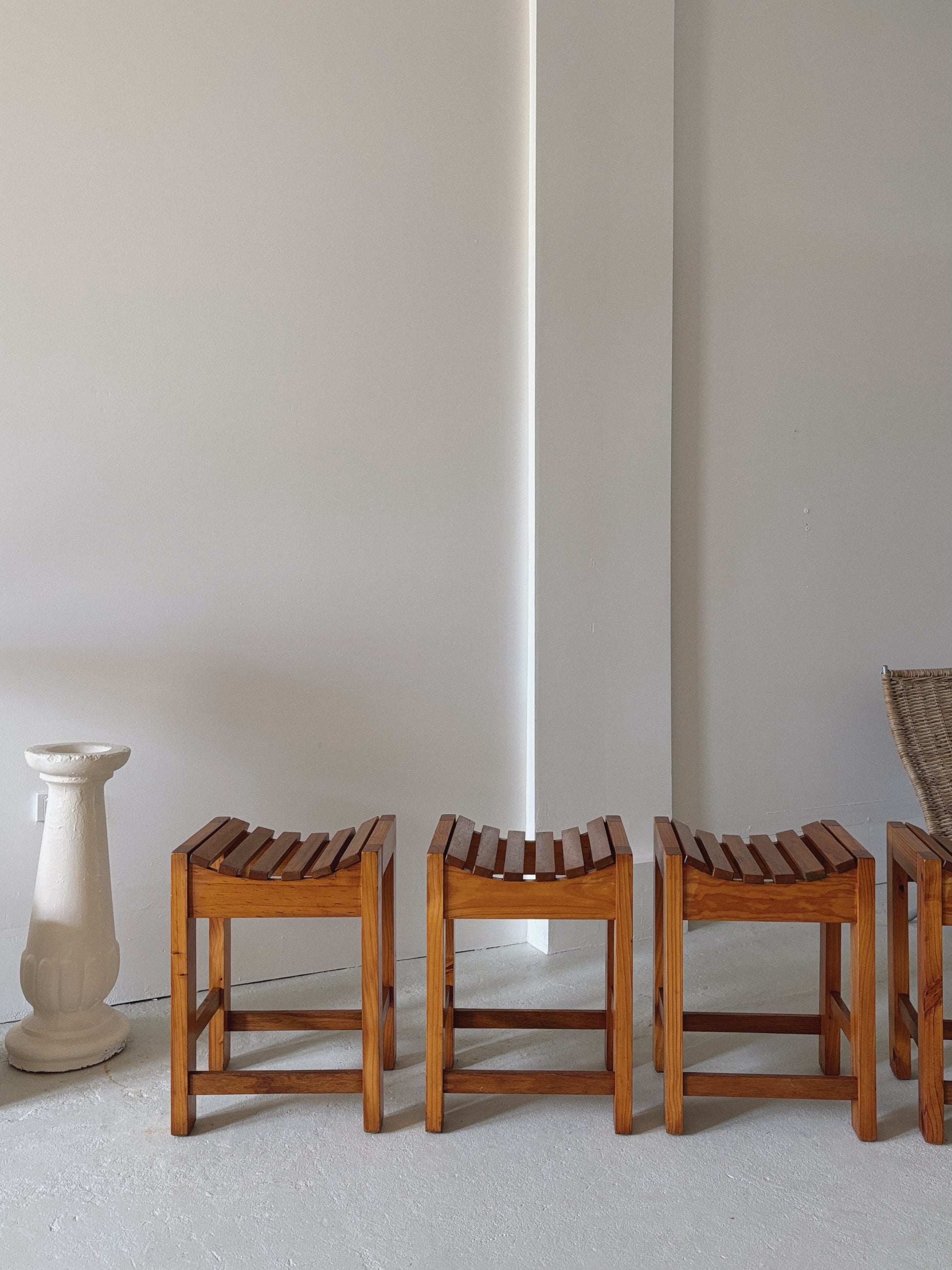 1970s bespoke brutalist stools in great vintage condition. Curved slatted seats, these are sooo gorgeous. Seat height sits in between a counter stool and a dining chair, and can actually work for either (we did quite a bit of testing at different height tables and benches!). Or equally lovely on their own in a bedroom or bathroom. For this reason we have listed the price for a single stool, although we have 3 in total. Please add 4 to cart if you'd like all 3! Some wear and tear consistent with age and use, a general patina has developed over the years, please see pics.