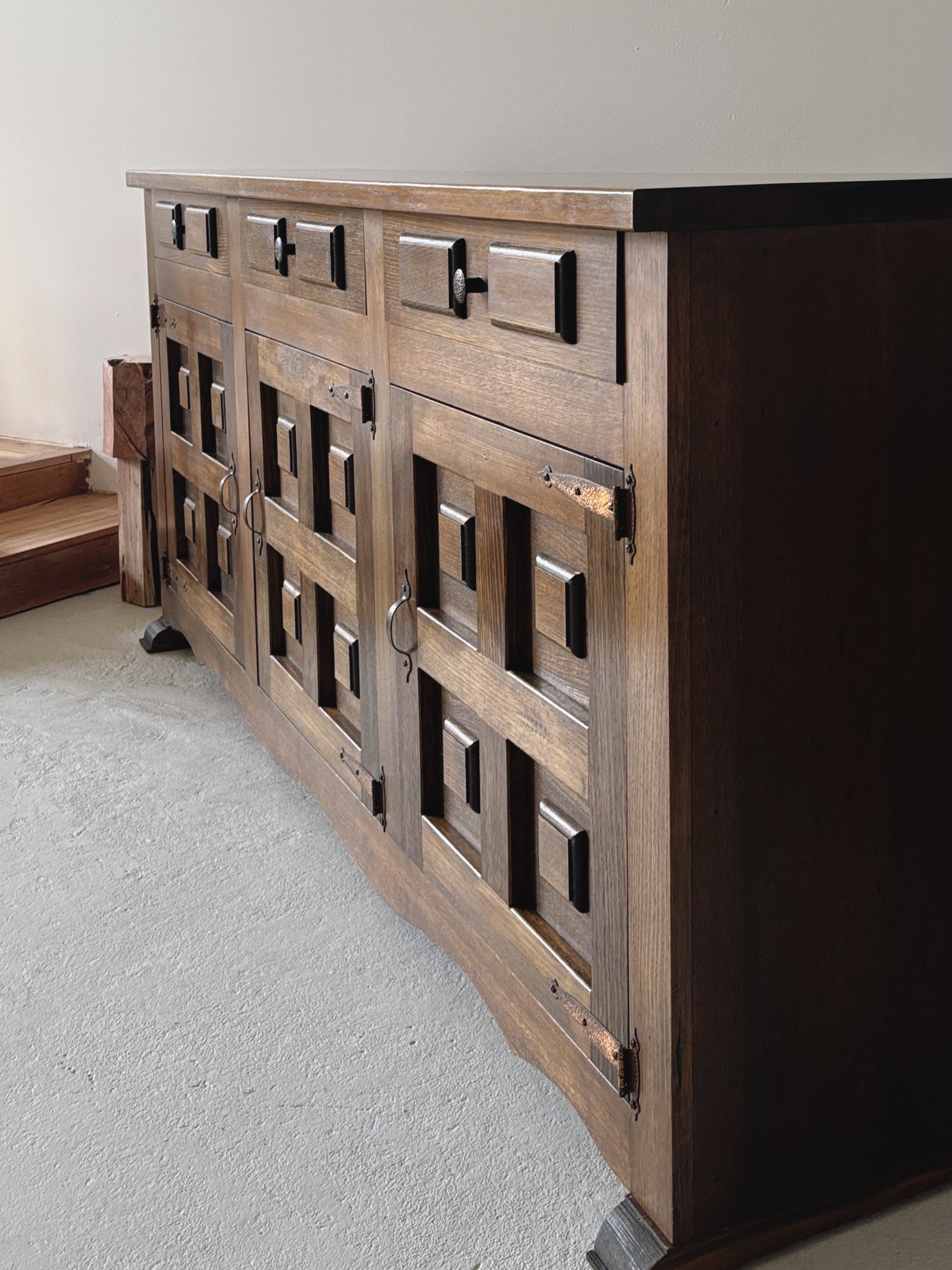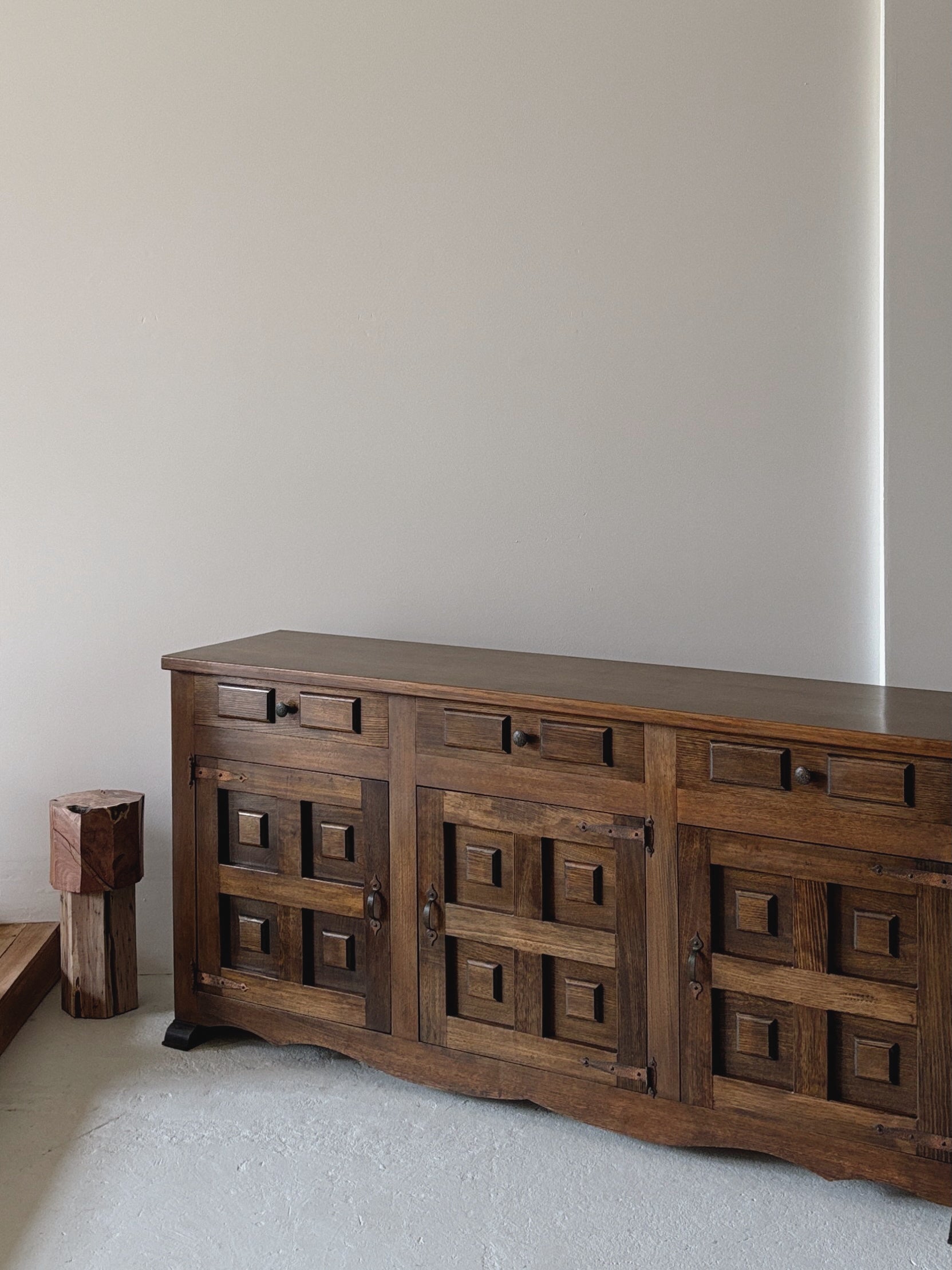 1970s Brutalist Walnut Sideboard in excellent vintage condition. Made by Davis Furniture in Australia, the details on this are incredible. Solid walnut construction, this is a very heavy, dramatic and beautiful piece, in strikingly good condition considering for its age! Original copper hardware, including hammered hinges, the 3 drawers open well and each cupboard has a removable shelf. A stunning piece!