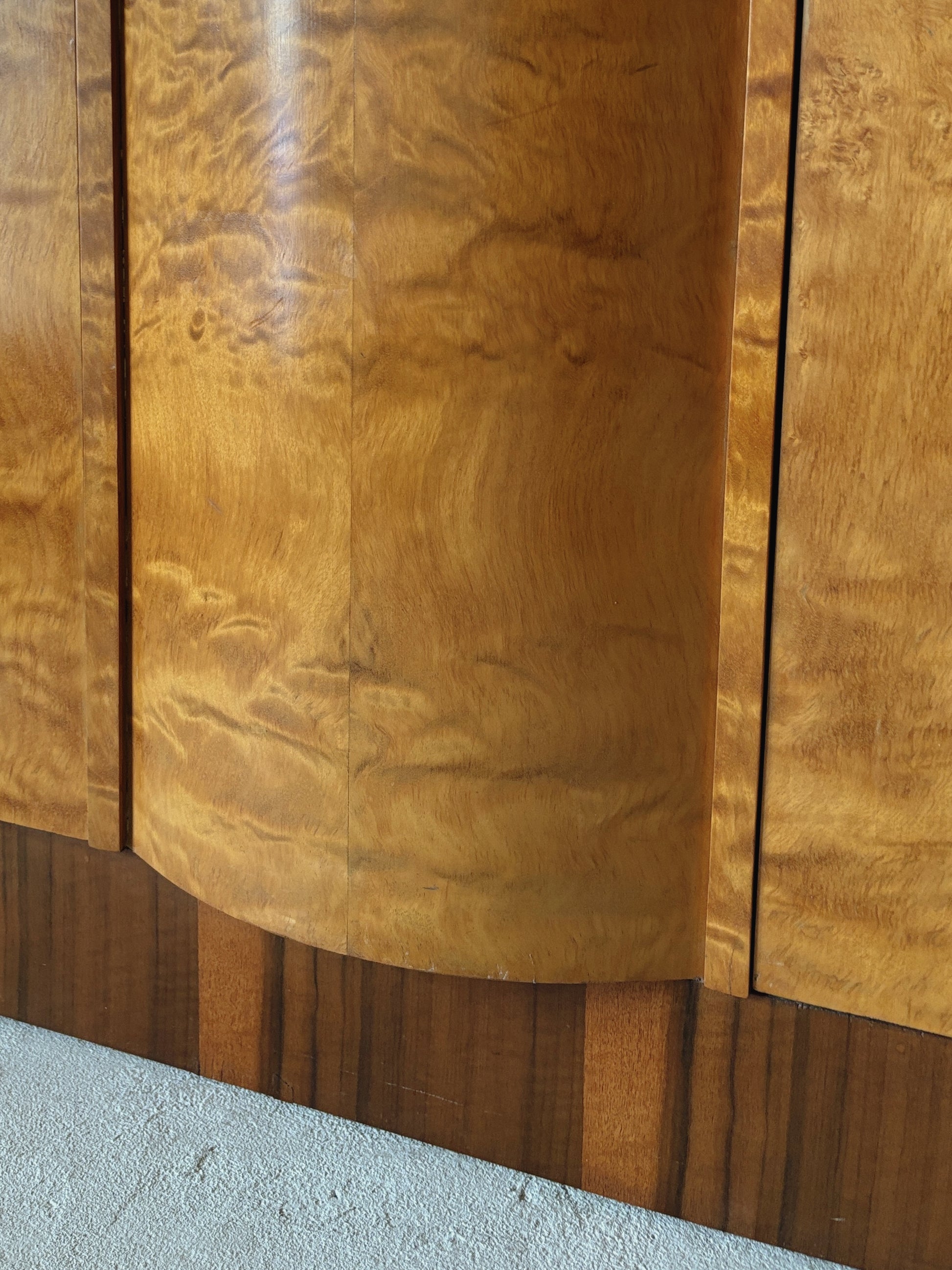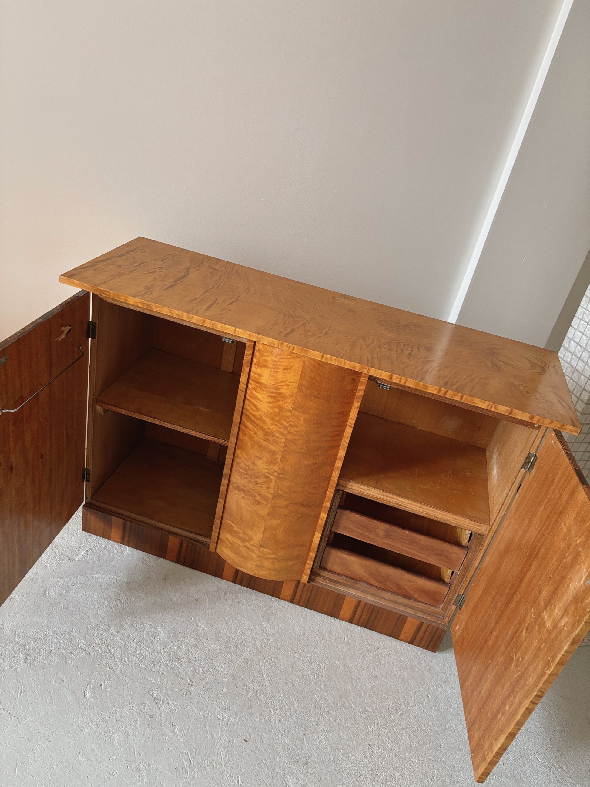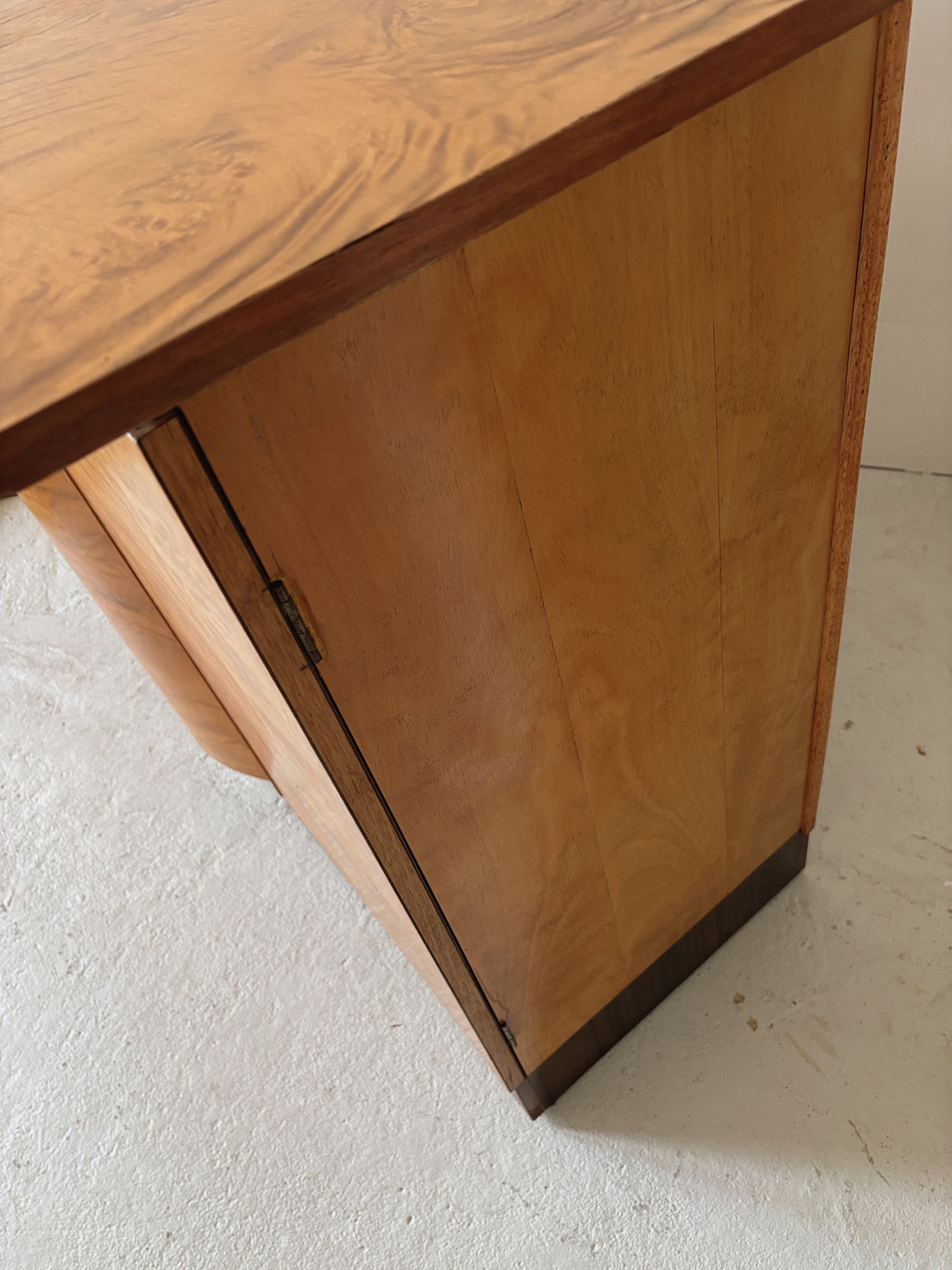 Delightful custom made art deco burr sideboard circa 1960s in great vintage condition. The curve at the front - stunning! This piece was reconfigured by the previous owner from his mother's bedroom set, and it's really special. A lovely slimline size, one cupboard has drawers and the other shelves, the curved section in the middle is fixed and doesn't open. Incredible patterning, some little quirks and signs of the custom build, we have detailed in pics.