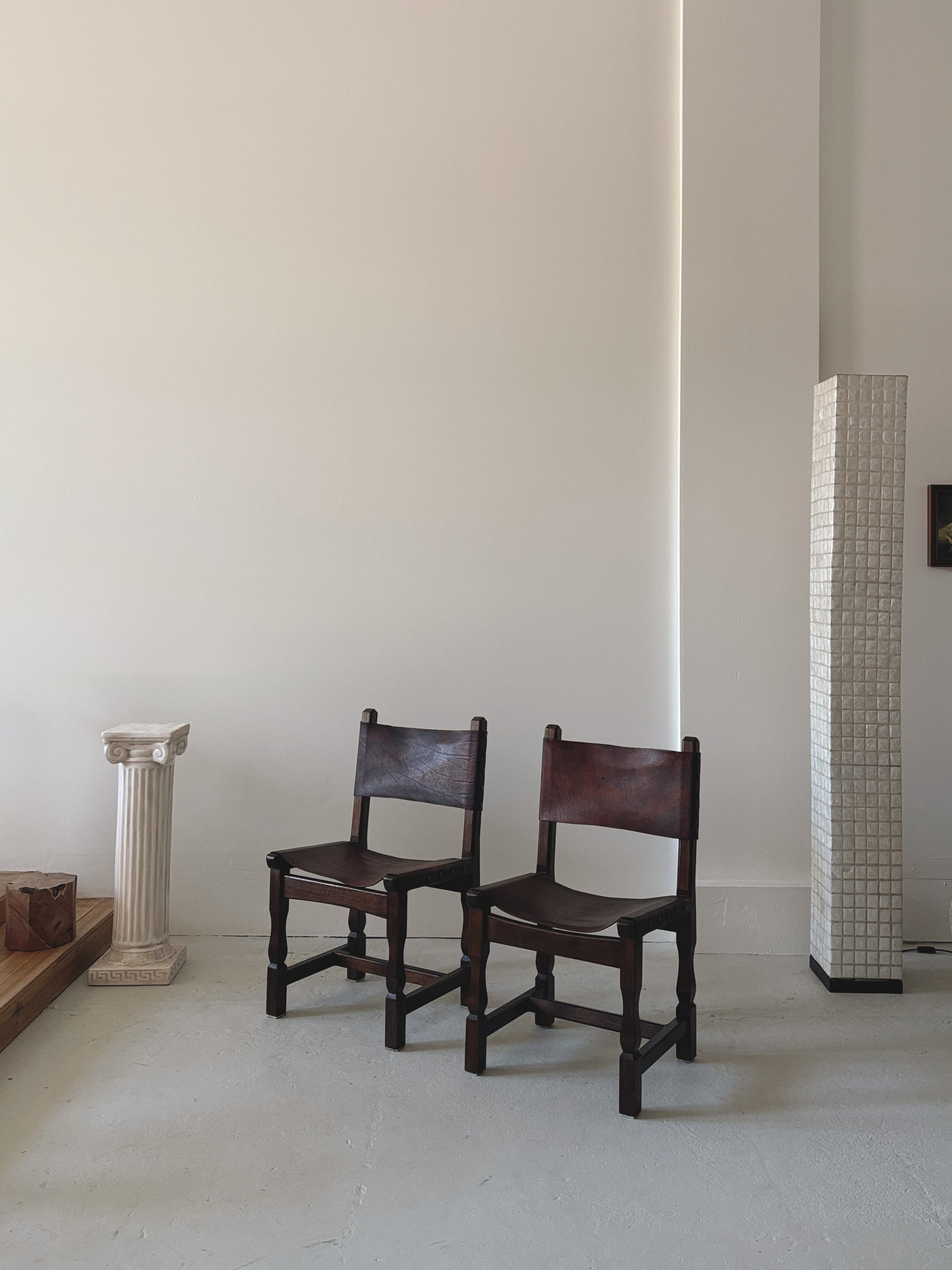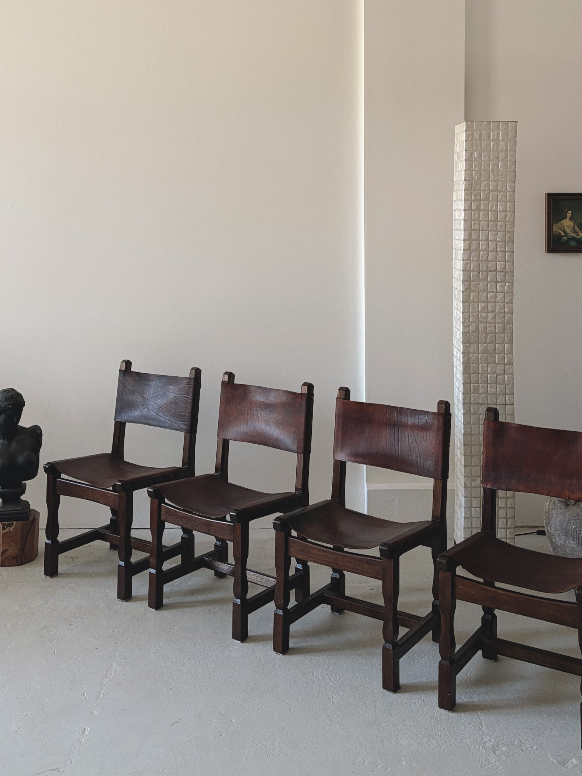 1970s Spanish style leather chairs in very good vintage condition. Brutalist beauties. Extremely strong leather, steel detailing, these would be incredible around a dark timber dining table. Each chair has a wonderful carved makers mark which unfortunately we (google) have been unable to decipher, but it shows the care, precision and bespoke nature of this lovely set. They have been loved for decades, but the leather has developed an even patina, with no major marks, sagging or defects (we have taken photos of each seat for you!) they are structurally sound, freshly conditioned, and one of the steel fasteners replaced.
