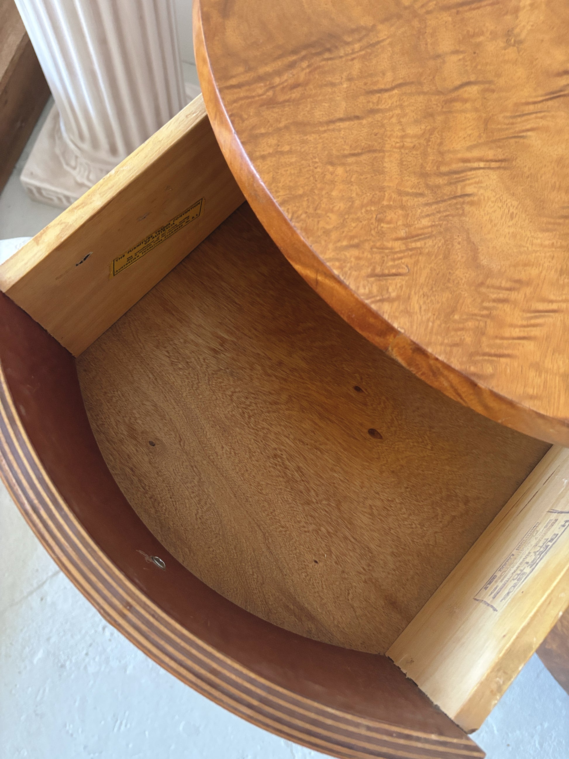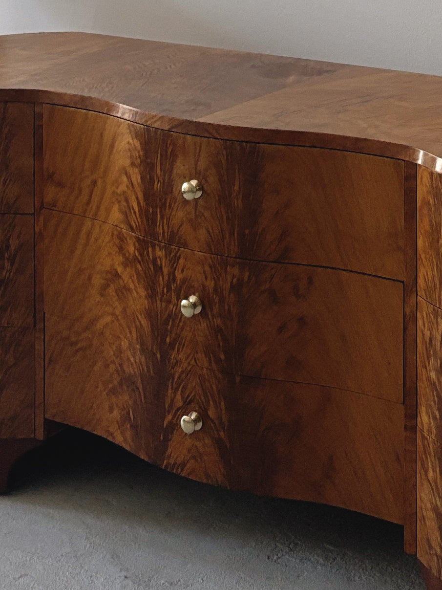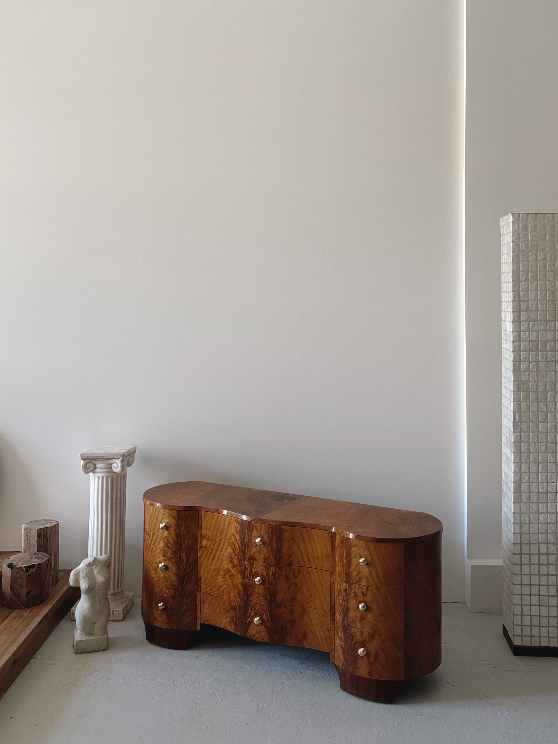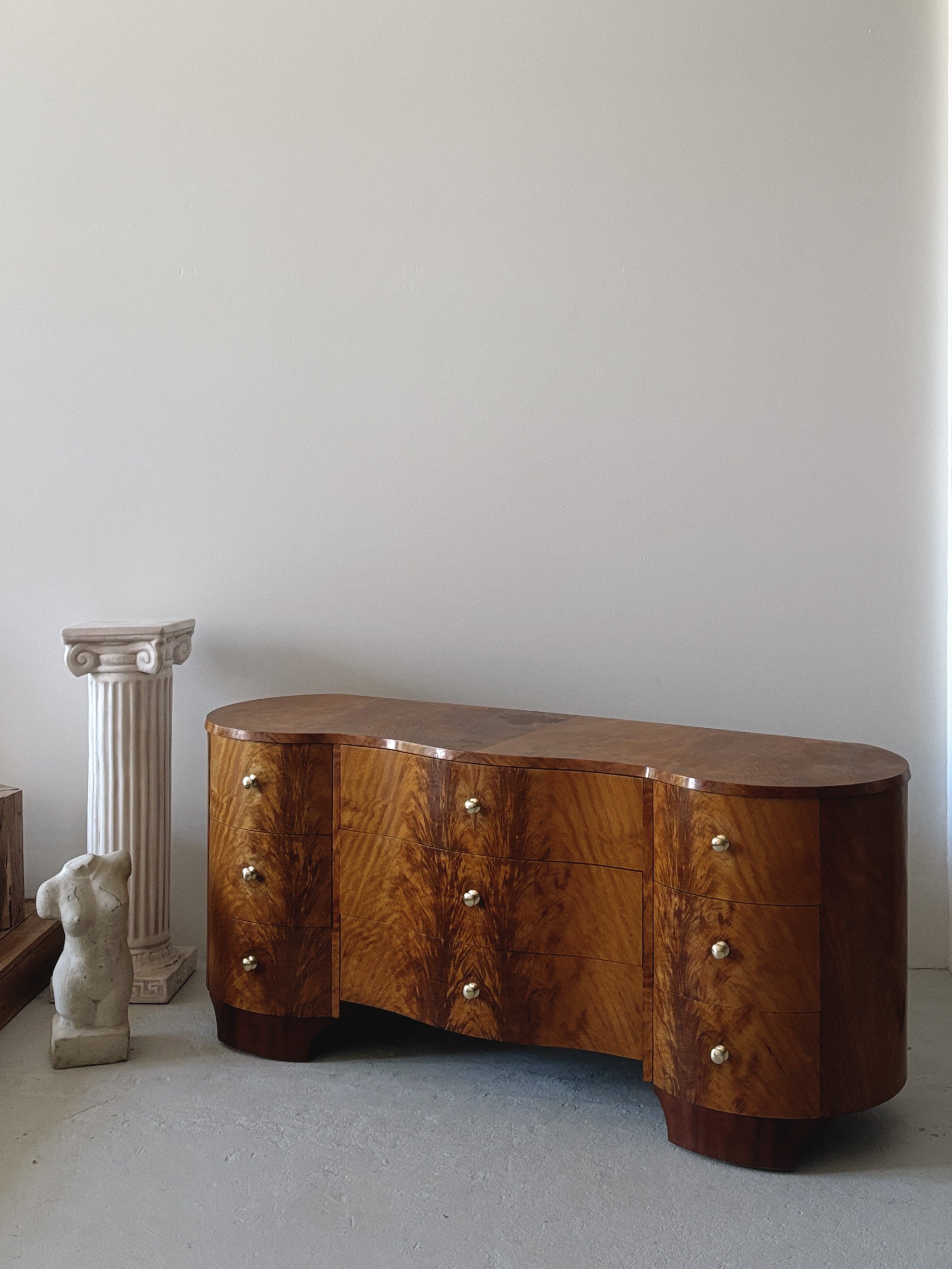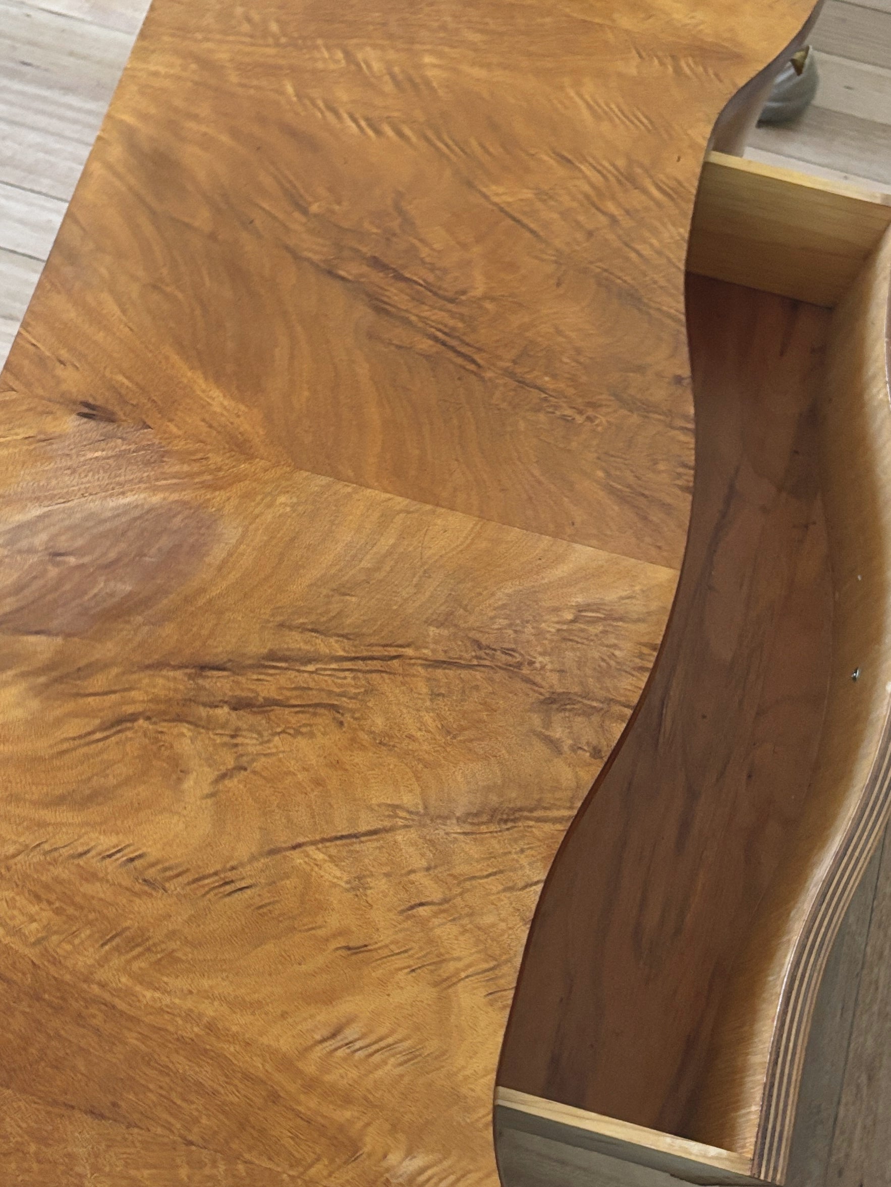 Vintage low curved drawers circa 1960s in very good original vintage condition. WOWSA we are suckers for curvy front pieces with interested details, and this is no exception! Custom made in Australia, the pattern and rounded lines are incredible! We have given this a little refresh, there is some wear consistent with age still present, namely unevenness in the finish on the top, and where the old damaged handles sat. Inside the drawers are unfinished timber, as they liked to do in those days, but they are clean and smooth. Please see pics!