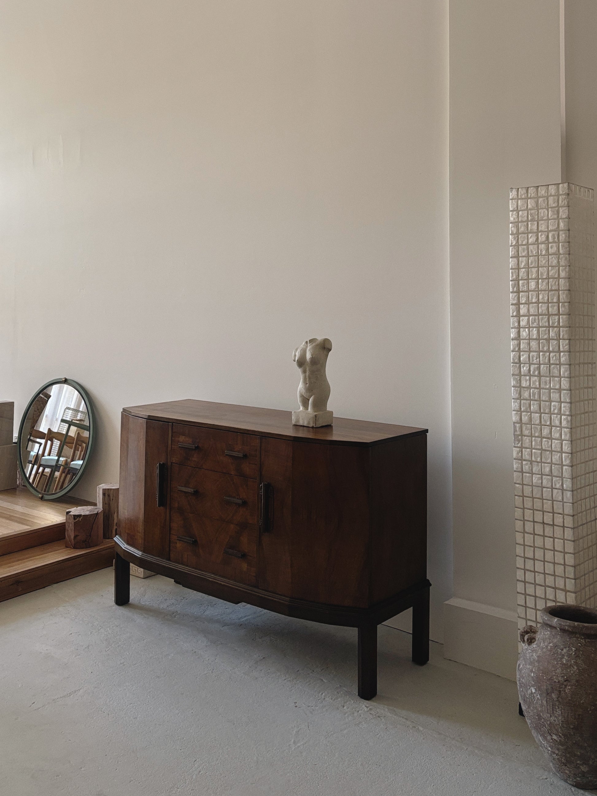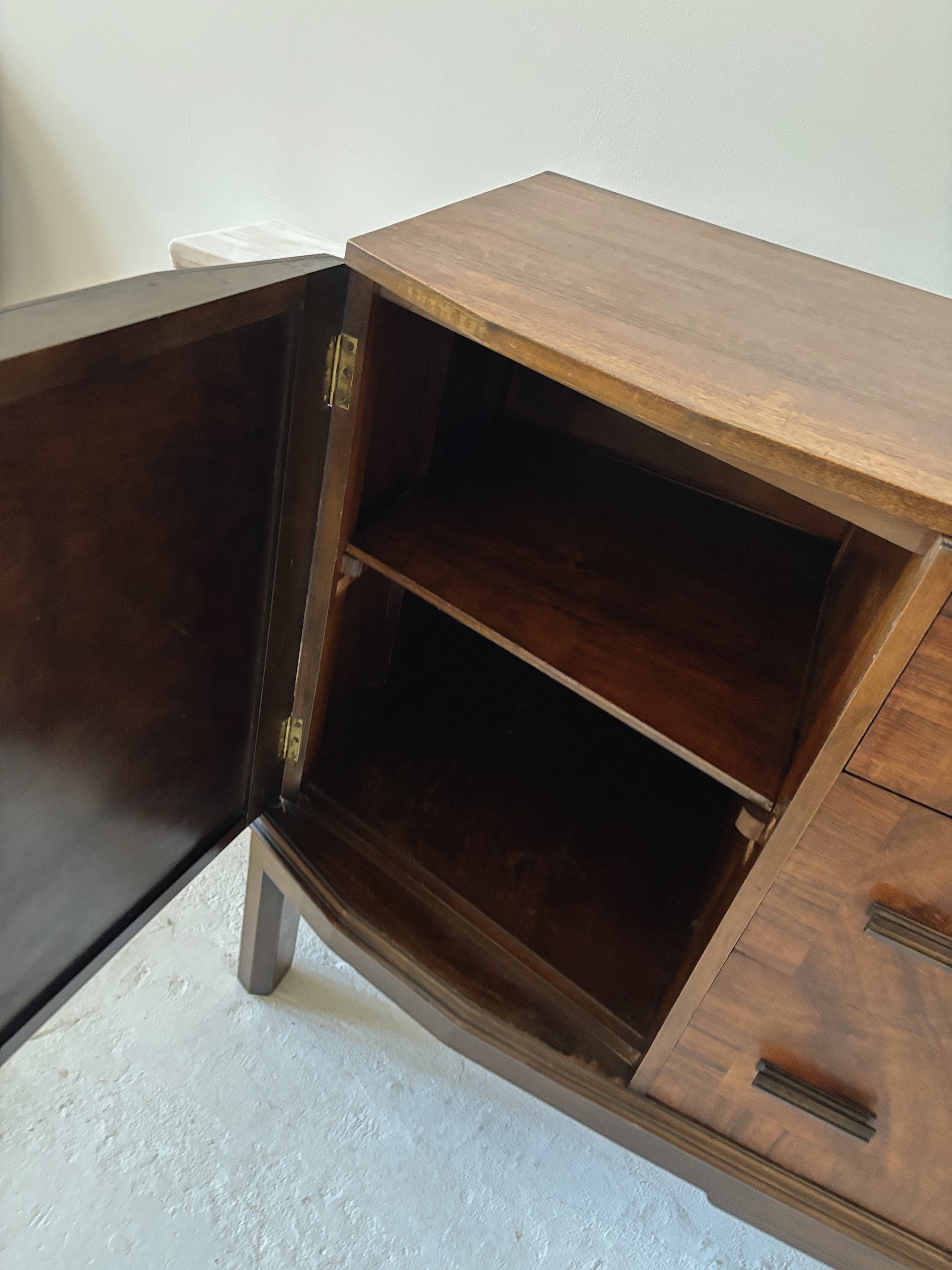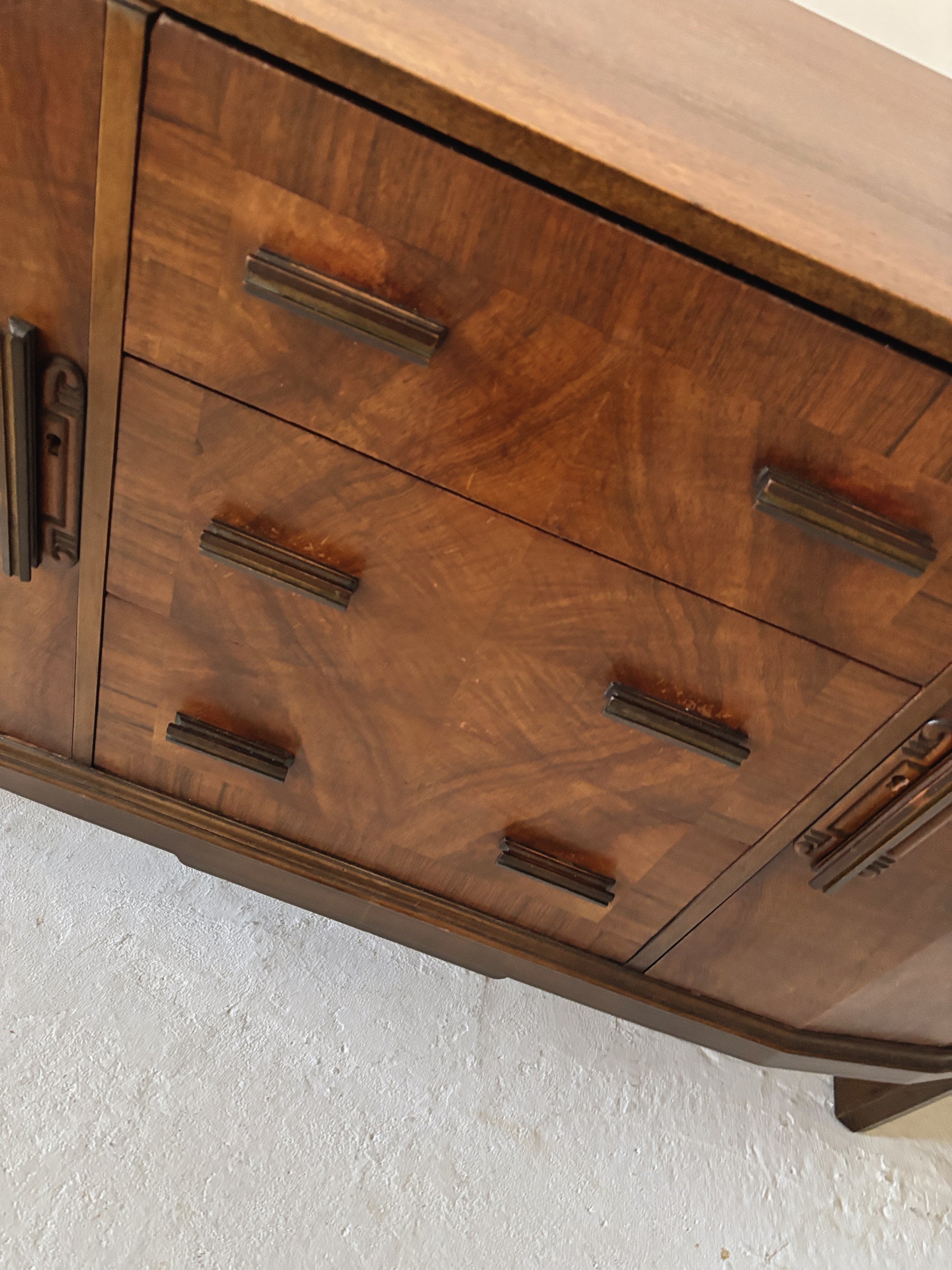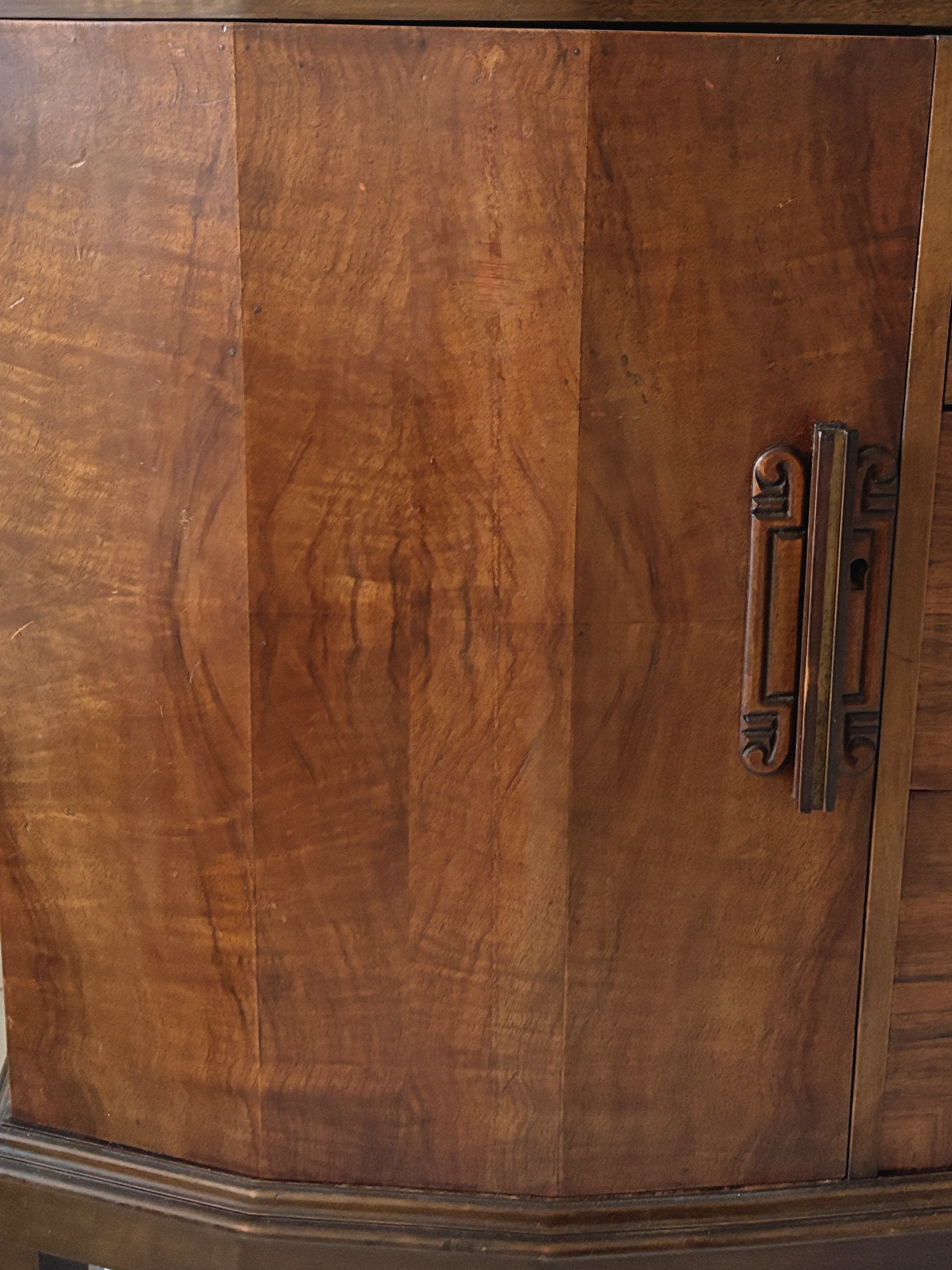 Art Deco solid timber sideboard circa approx 1930s in good vintage condition. Made by Beard & Watson in Sydney, this is a gorgeous example, with exquisite inlay detailing and intricate handles! We couldn't pass this one up with its slightly curved front and taller profile - and it's in good original condition, with some wear expected for a piece that's nearing 100 years old, which we've detailed in the images.