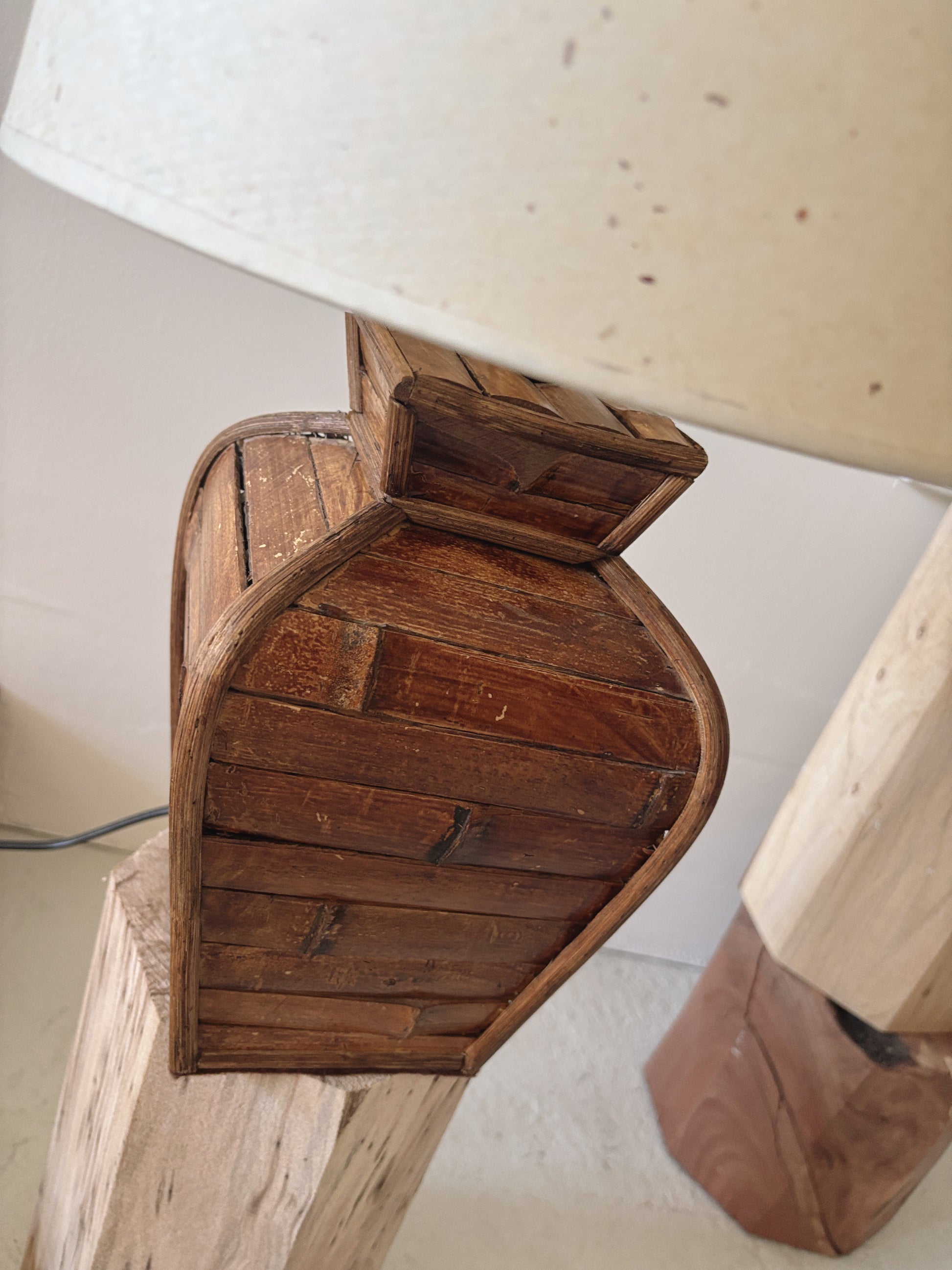 Gorgeous vintage bamboo table lamp in great vintage condition. Curved base, amazing original speckled paper lampshades, these are stunning! We have two, selling separately, please add 2 to cart. Some wear on the bamboo base/patina consistent with age and use, please let us know once purchased if you'd prefer the tapered white shade or the original!