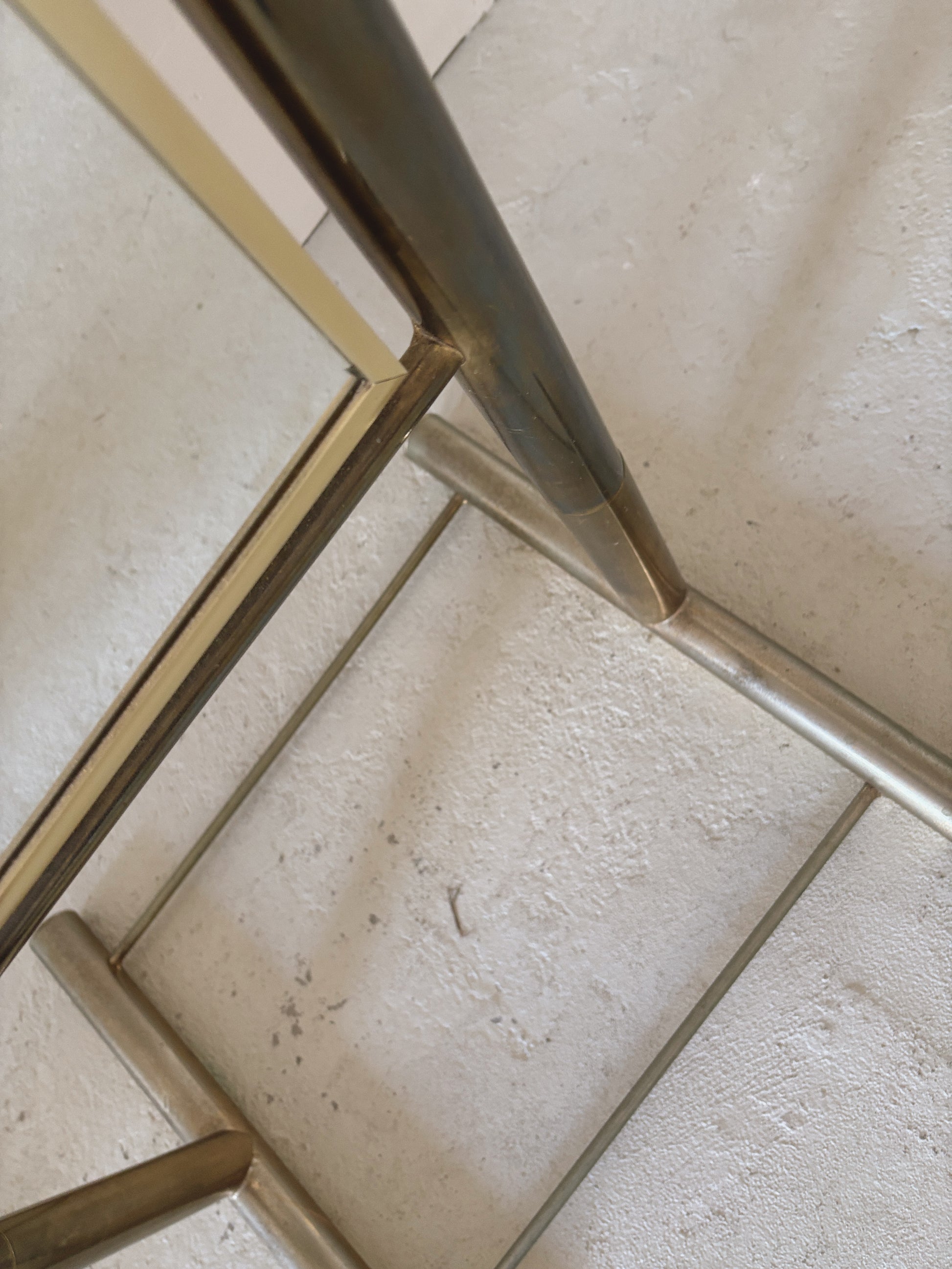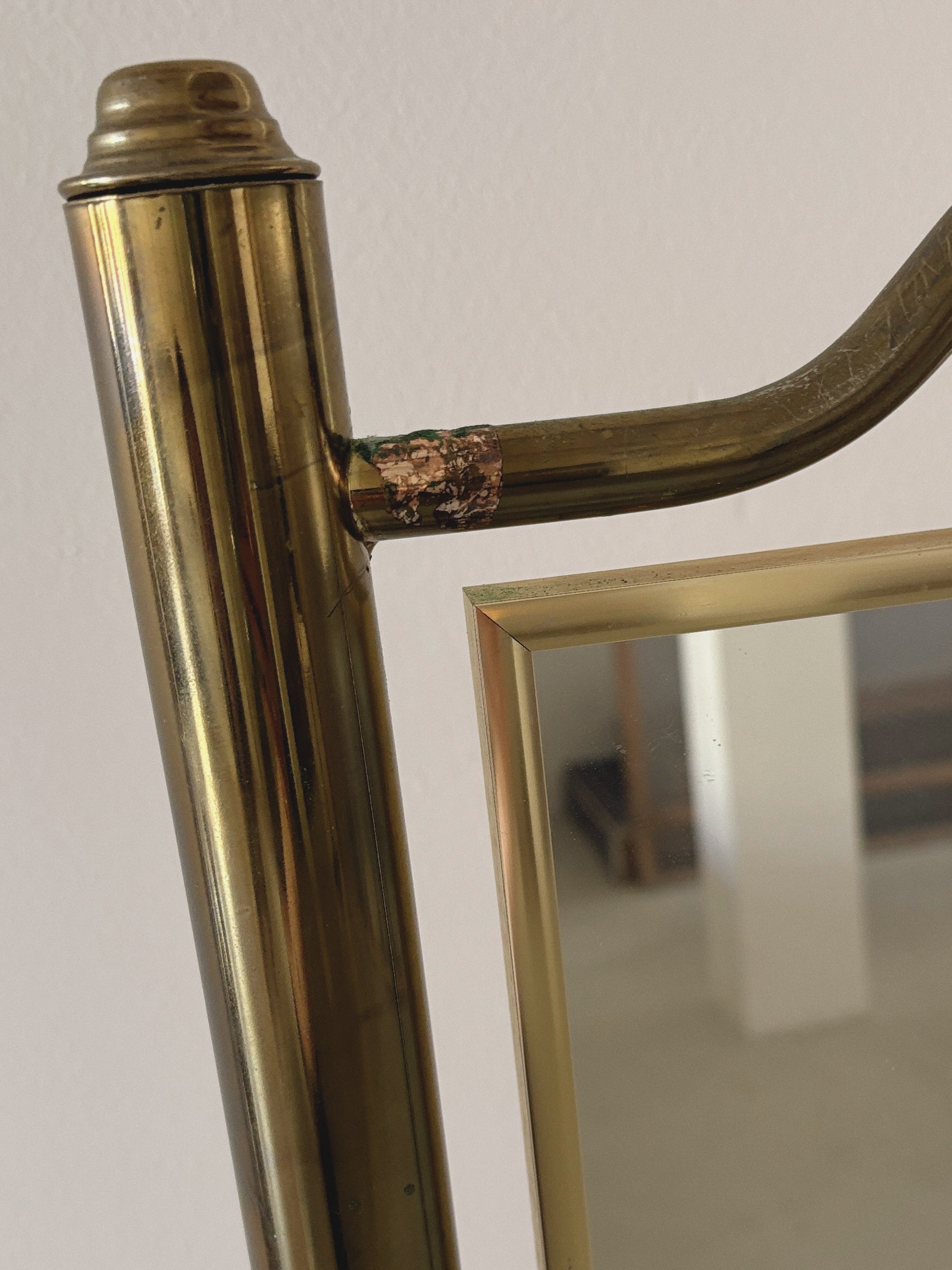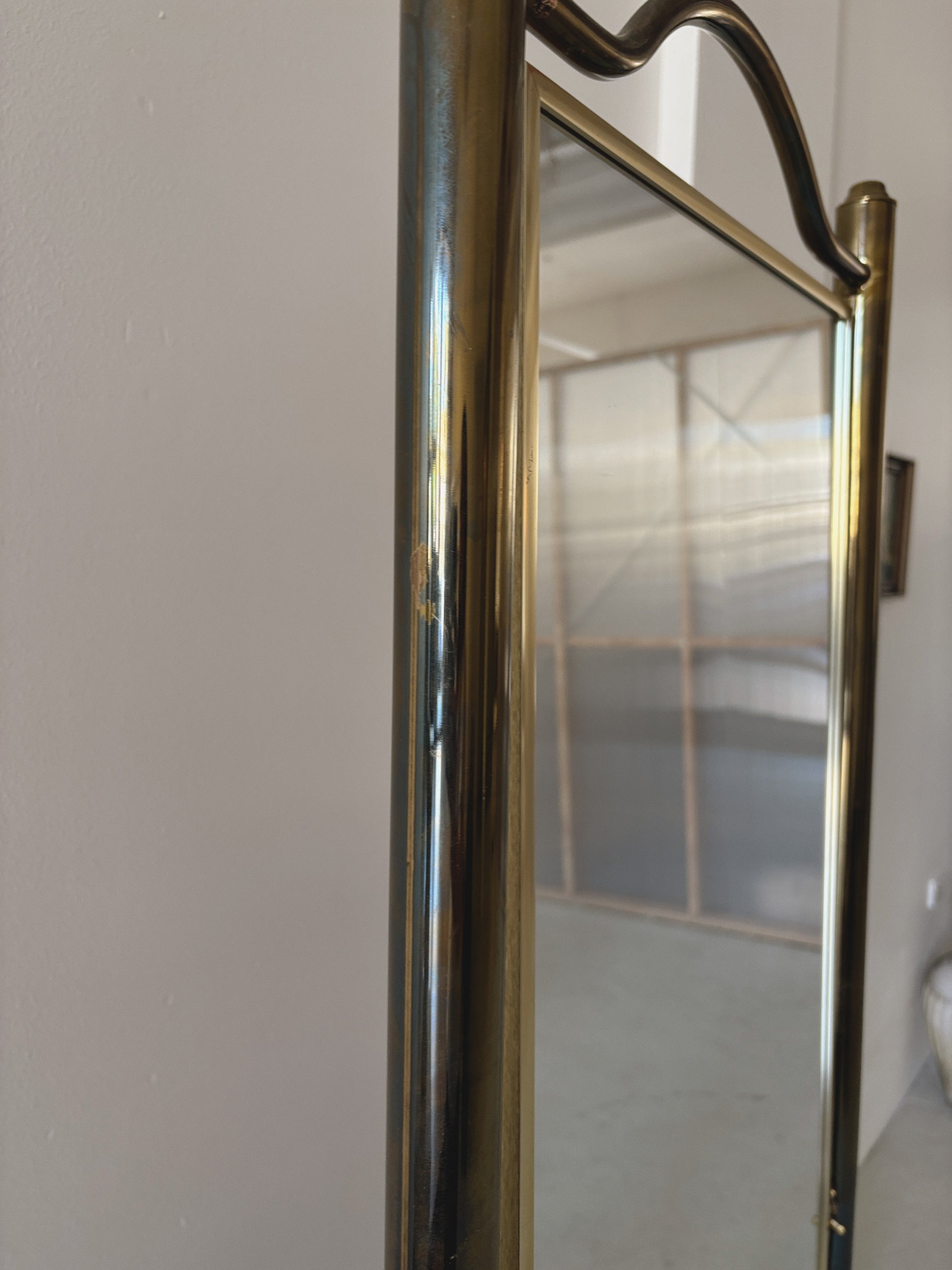 Brass standing mirror in good vintage condition. Made in the 1980s in Victoria, this is a stunning piece with incredible curves. Adjustable mirror hangs in a tubular brass frame, very sturdy. The mirror is in excellent condition, the brass frame has some wear and patina that has developed over the years, including some areas where the brass has discoloured. This adds to the vintage beauty in our opinion! Please see pics.