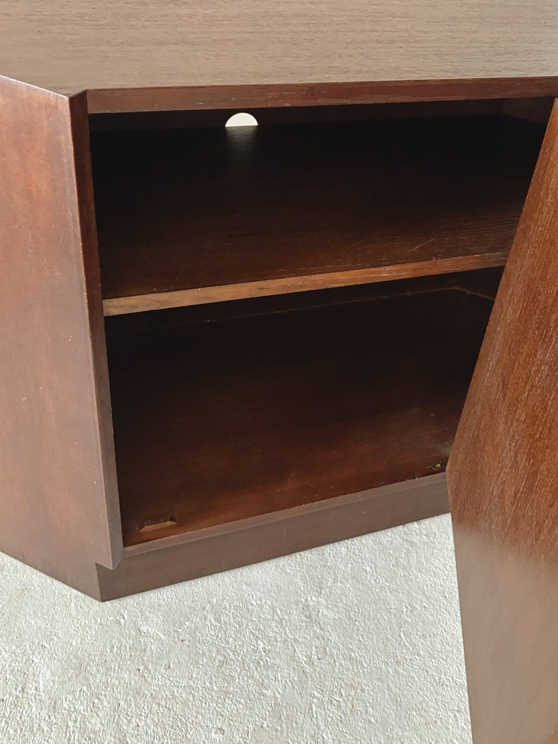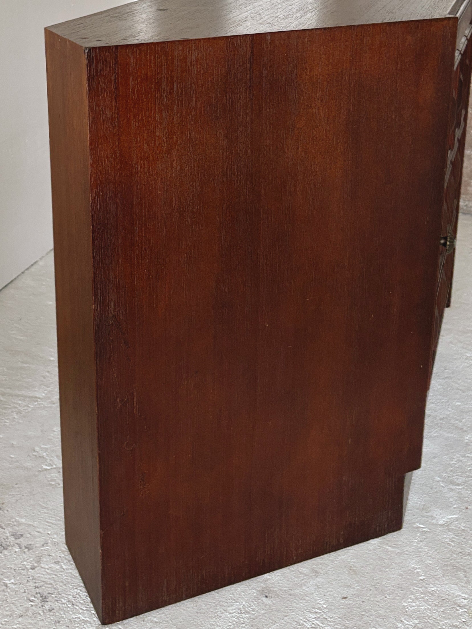Brutalist cabinet circa 1970s in very good vintage condition. This is the sweetest cabinet with the most gorgeous detailing - really interesting shape and the perfect size for a record player or small storage. Original hardware, a hole cut out of the back for electrical if required, the inner shelf is adjustable, and on the highest setting allows standard records to be stored underneath, although on a slight angle, please see pics. We love this one!