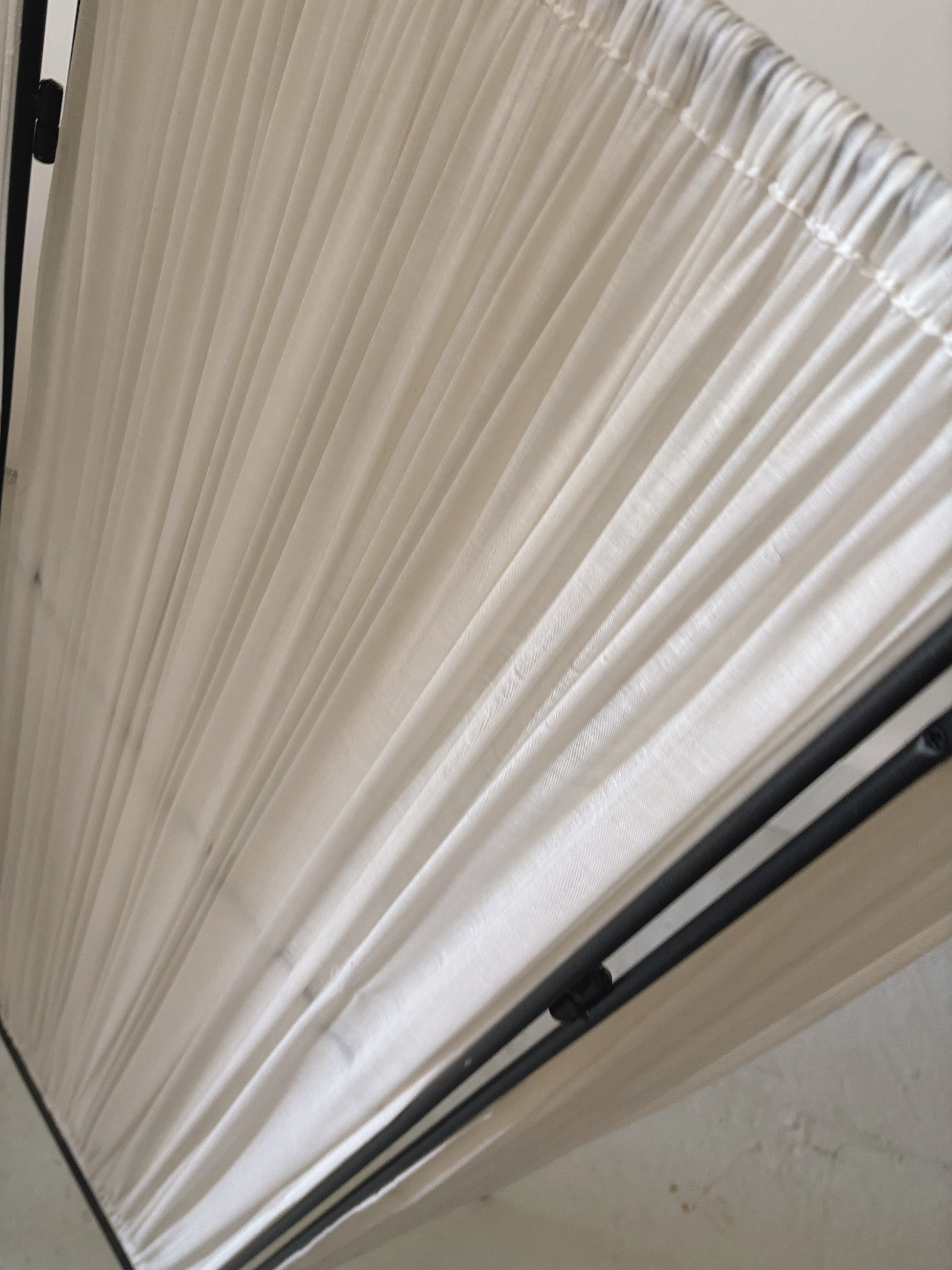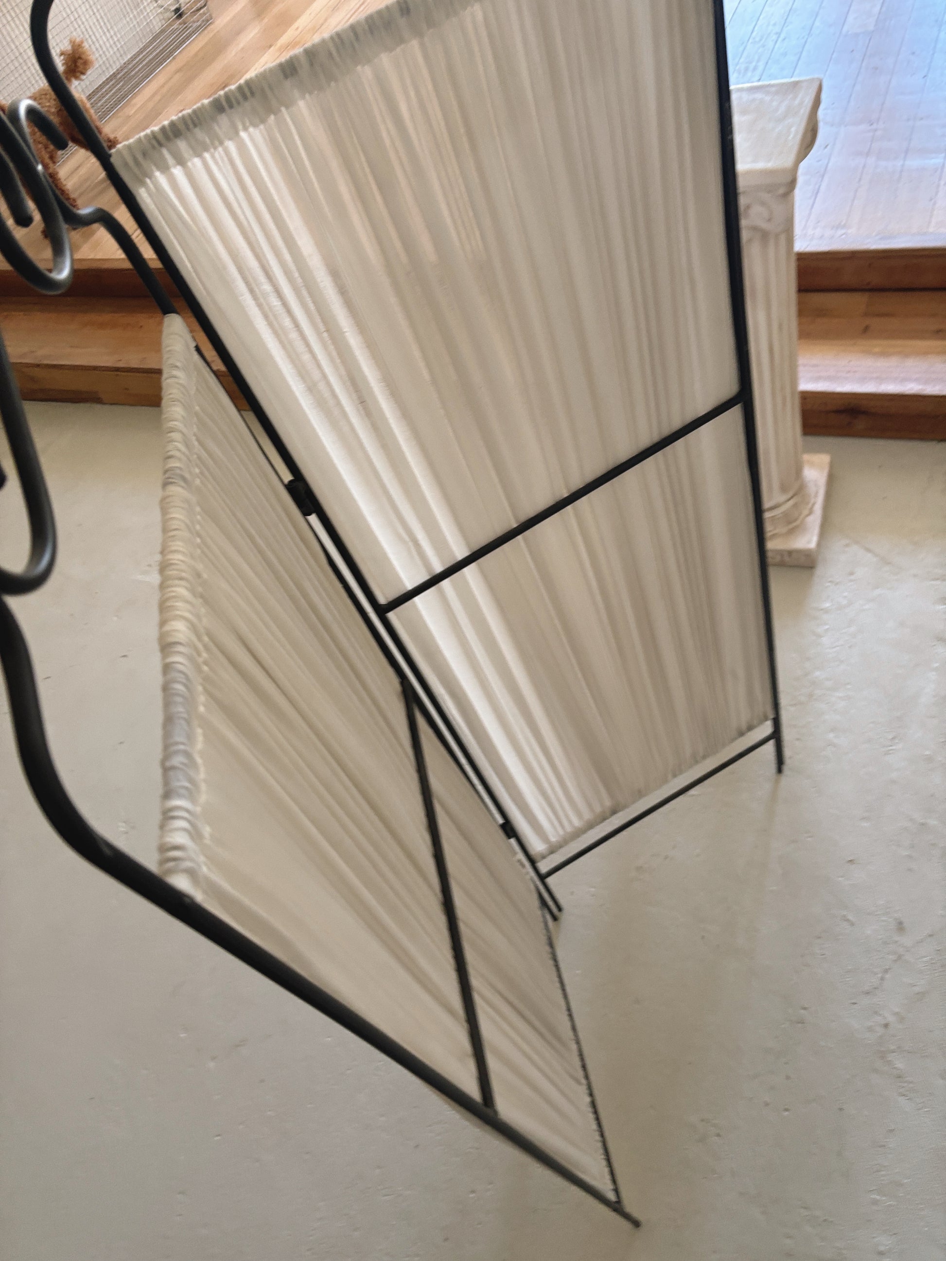 Incredible curly steel + fabric folding room divider/screen in excellent pre loved condition. An absolutely stunning piece, powder coated steel frame with the loveliest details! Reasonably easy to move around, no real wear to note.