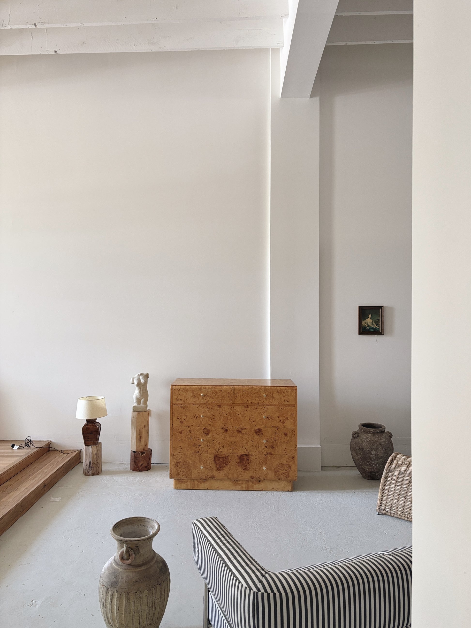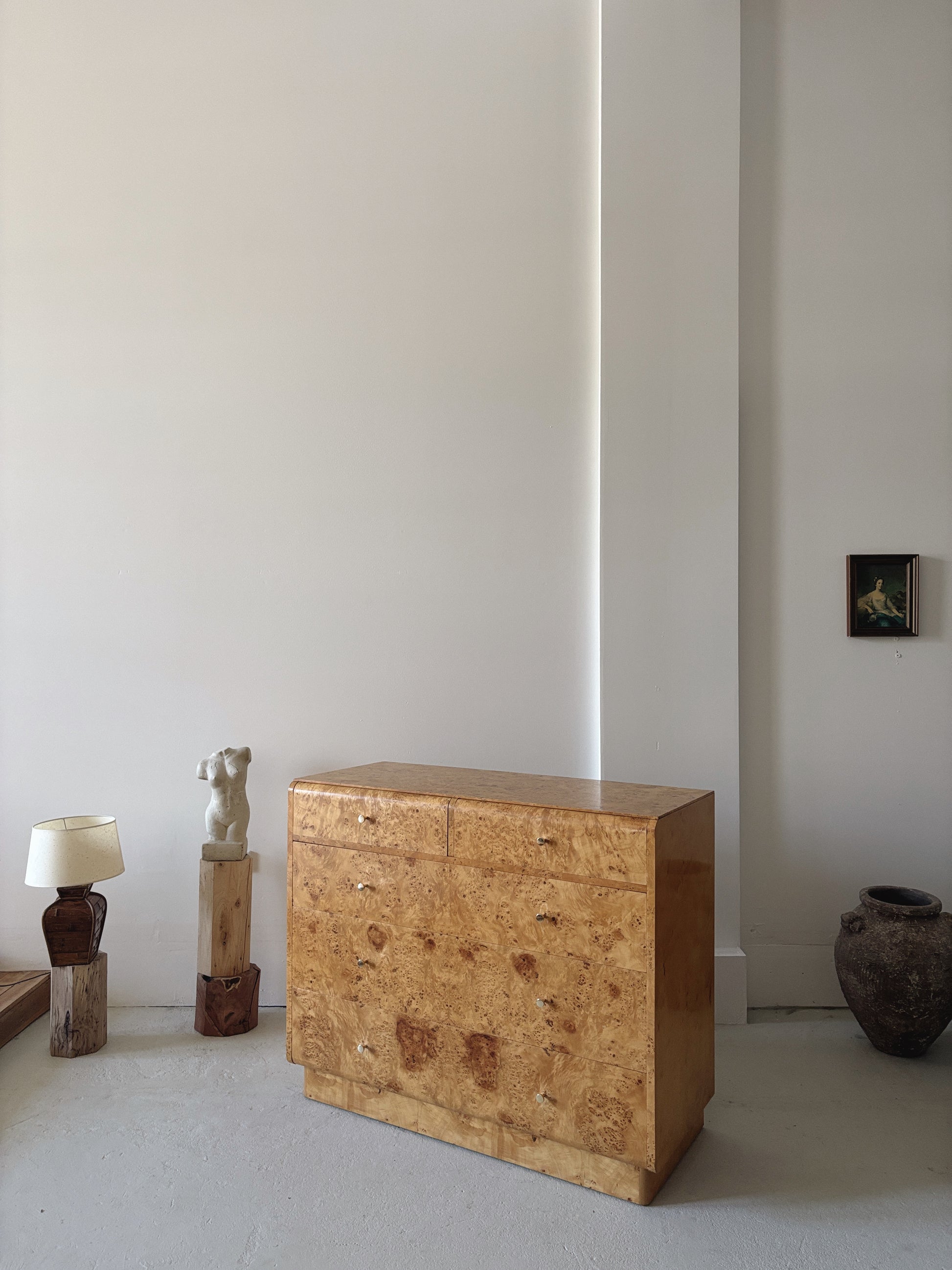 Divine maple burl drawers with curved front by Trask Furniture circa 1960s in great vintage condition. Stunning intricate burl pattern, updated steel handles - this is a very special treasure, has been gently refreshed, some signs of wear consistent with age still present, most notably some scratches on the top and slight fading where the previous damaged handles used to rest. Drawers open and close well.