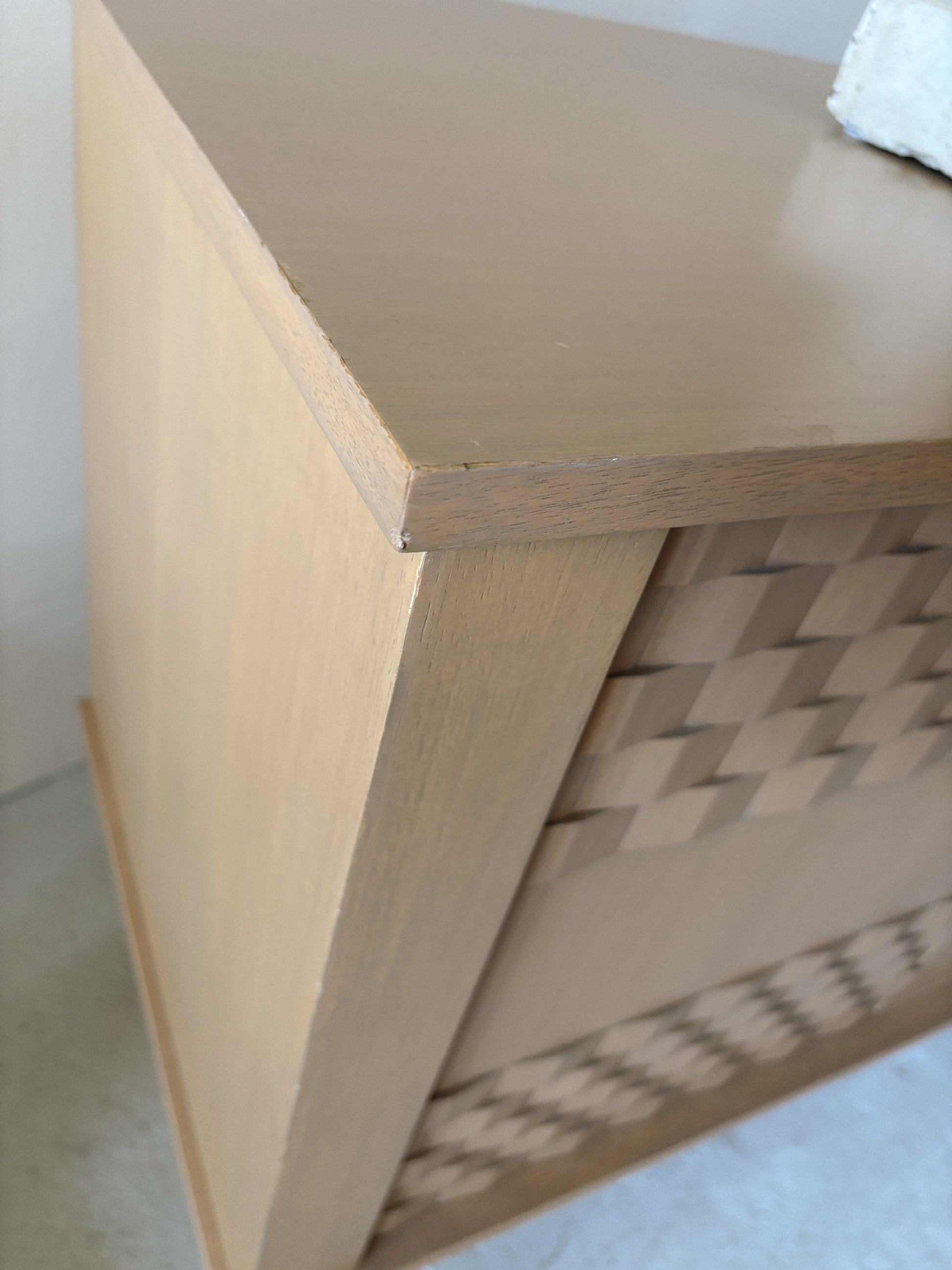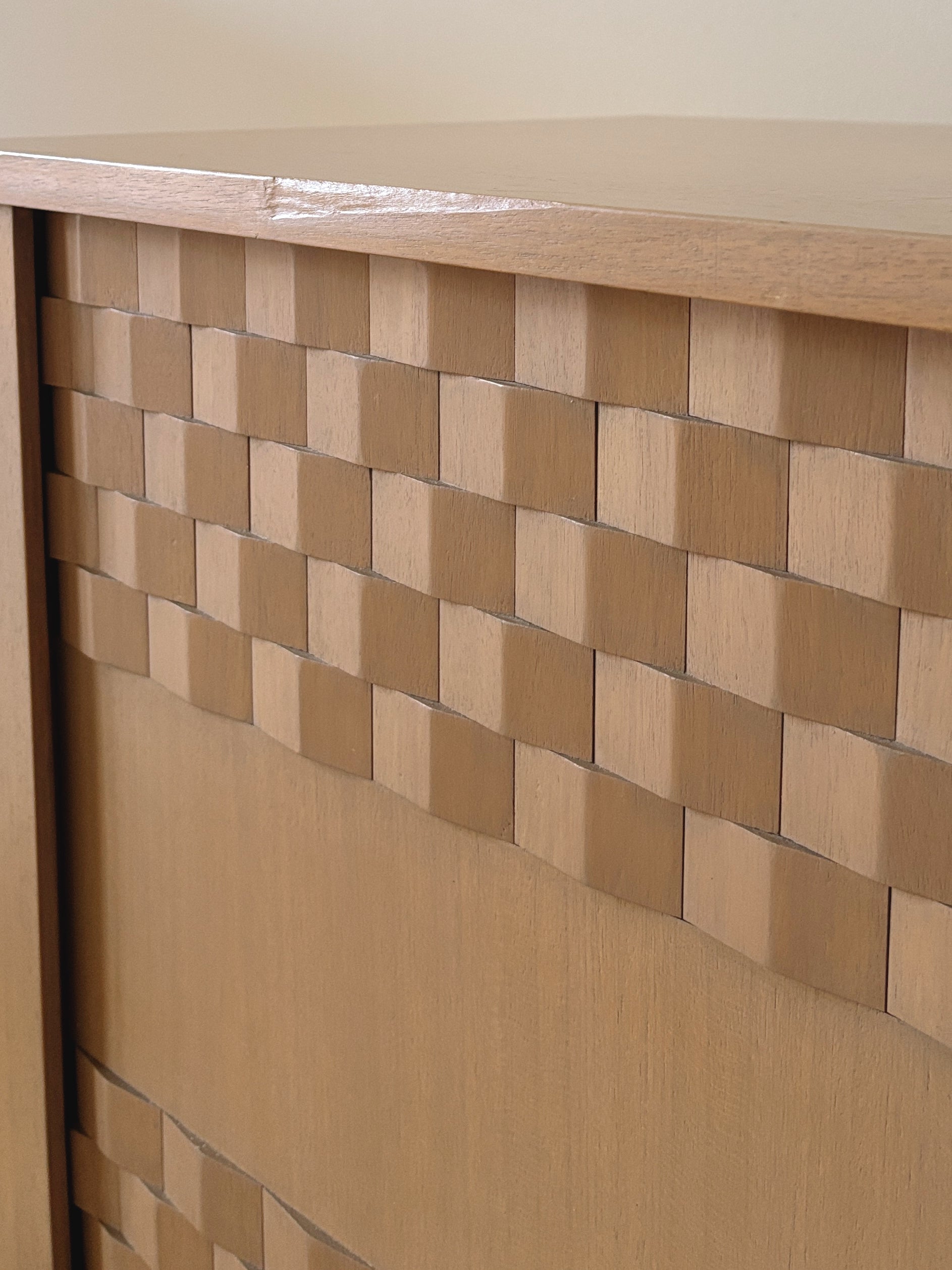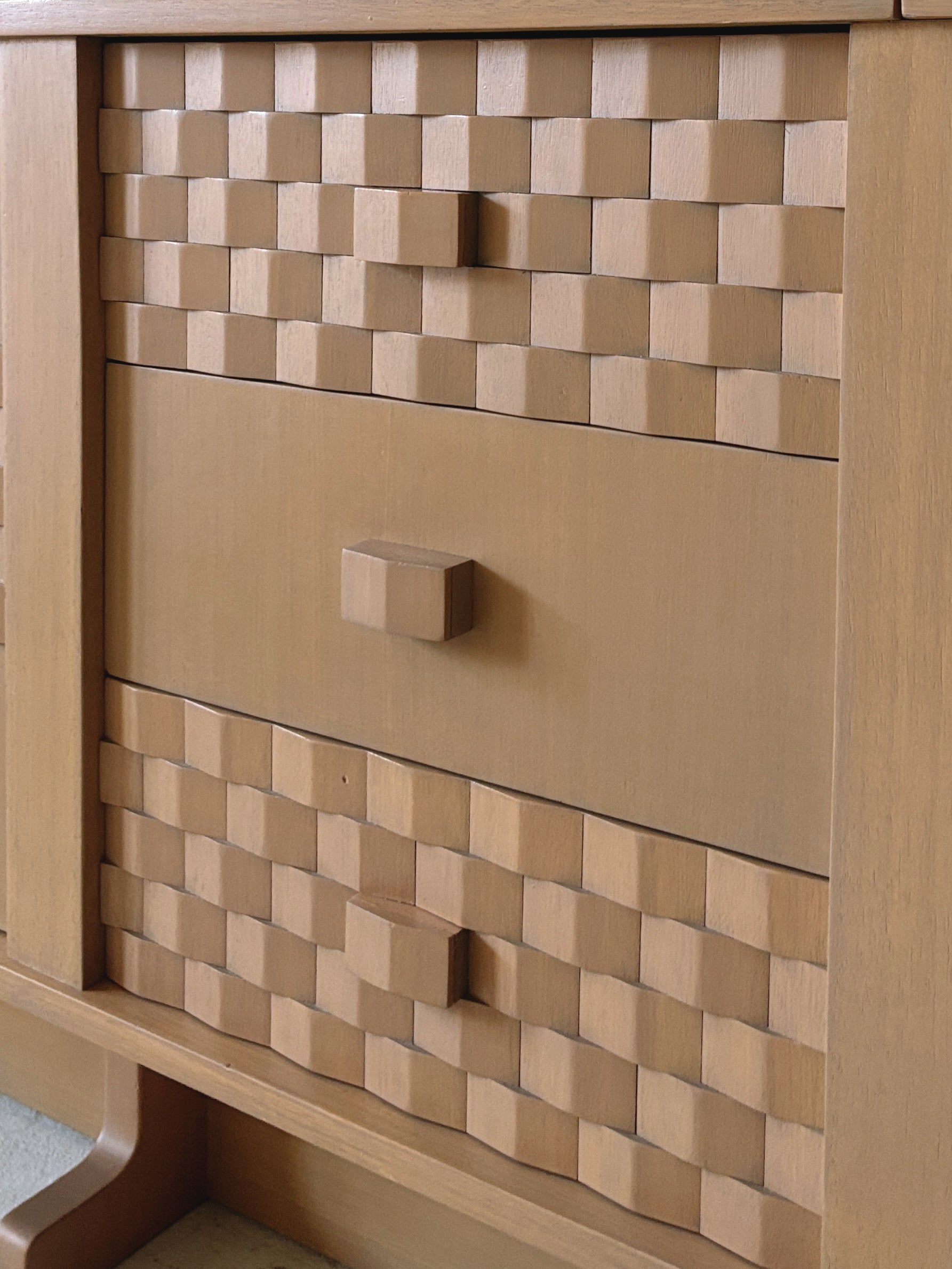 Custom built 1980s textured sideboard in great vintage condition. It’s incredible! Sourced from a fantastic house in Melbourne's south east as part of a larger collection late last year, this beauty was hand made to match with inbuilt curved oak joinery when the property was built, and is incredibly well crafted and unique. A statuesque piece - it features the most incredible textured fronts, each composed with a number of hand cut solid oak pieces to create an almost faceted effect. It offers one double door cupboard with adjustable shelf, 3 drawers and a top opening compartment for extra storage. As it was custom made to suit the house and fit along a skirting board, the base is slightly different on one side (please see pics). It shows some wear consistent with age, namely some marks on the top, a veneer repair and small spot of unevenness on one of the cupboard fronts - please see pics.