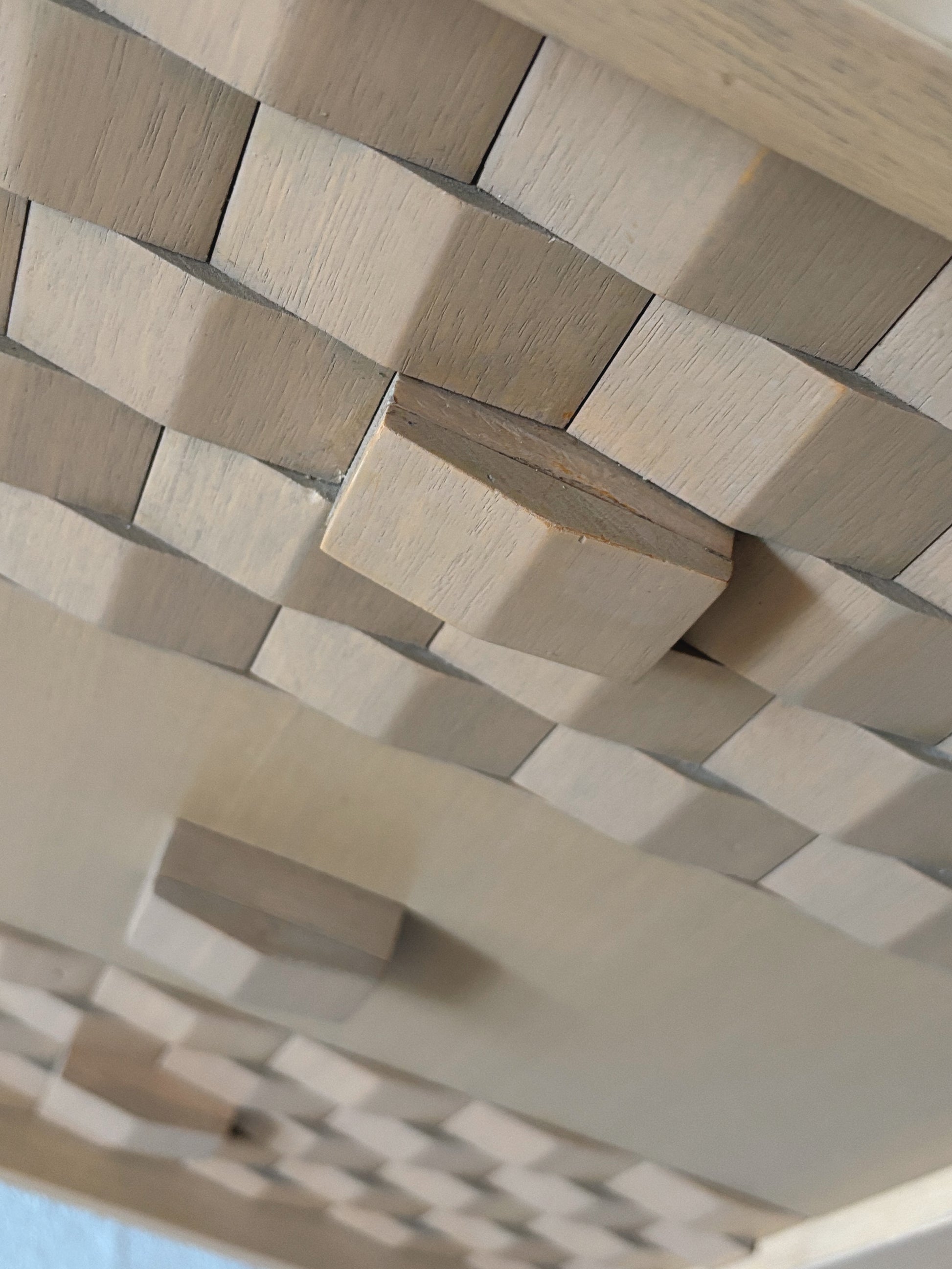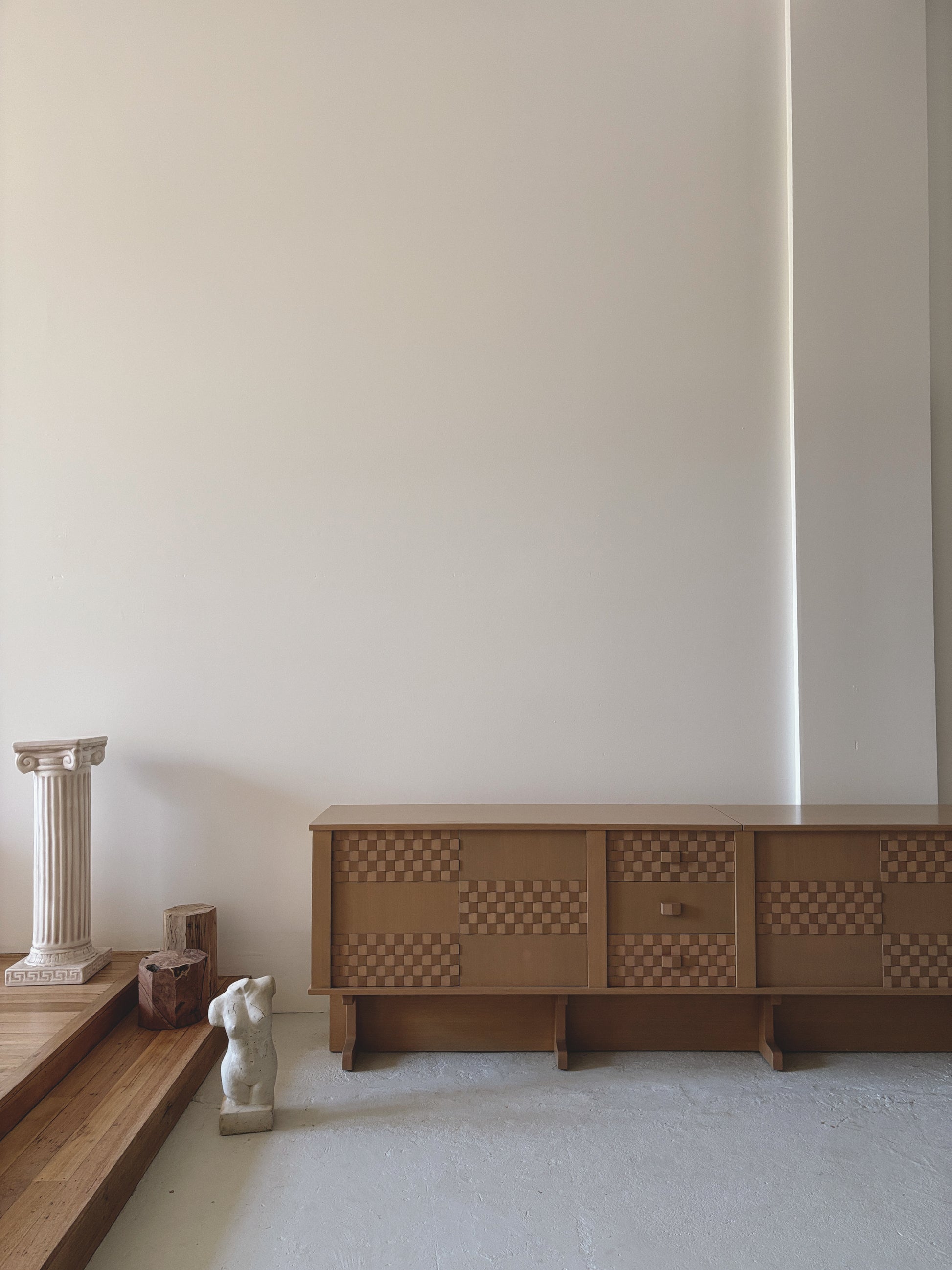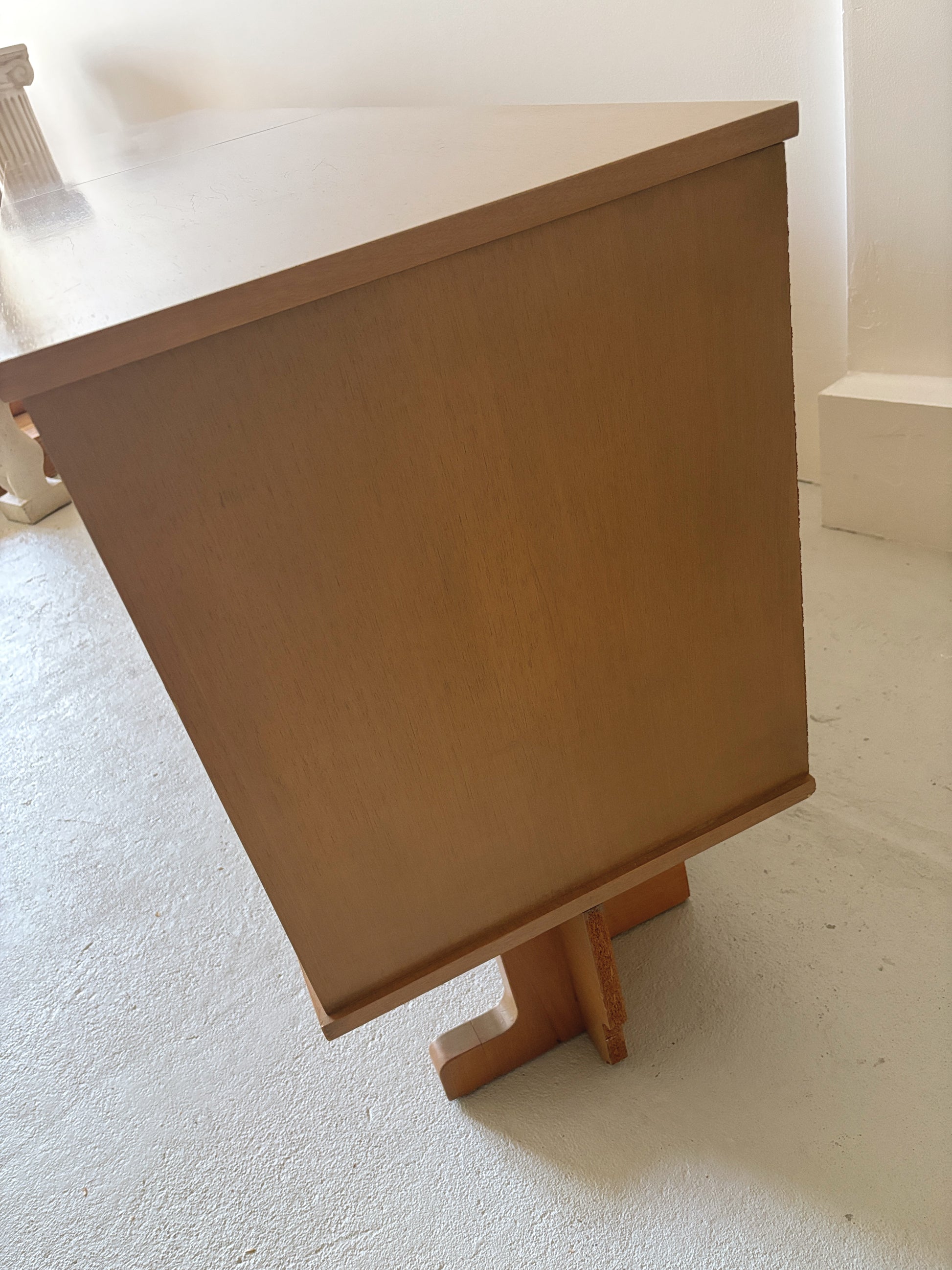 Custom built 1980s textured sideboard in great vintage condition. It’s incredible! Sourced from a fantastic house in Melbourne's south east as part of a larger collection late last year, this beauty was hand made to match with inbuilt curved oak joinery when the property was built, and is incredibly well crafted and unique. A statuesque piece - it features the most incredible textured fronts, each composed with a number of hand cut solid oak pieces to create an almost faceted effect. It offers one double door cupboard with adjustable shelf, 3 drawers and a top opening compartment for extra storage. As it was custom made to suit the house and fit along a skirting board, the base is slightly different on one side (please see pics). It shows some wear consistent with age, namely some marks on the top, a veneer repair and small spot of unevenness on one of the cupboard fronts - please see pics.