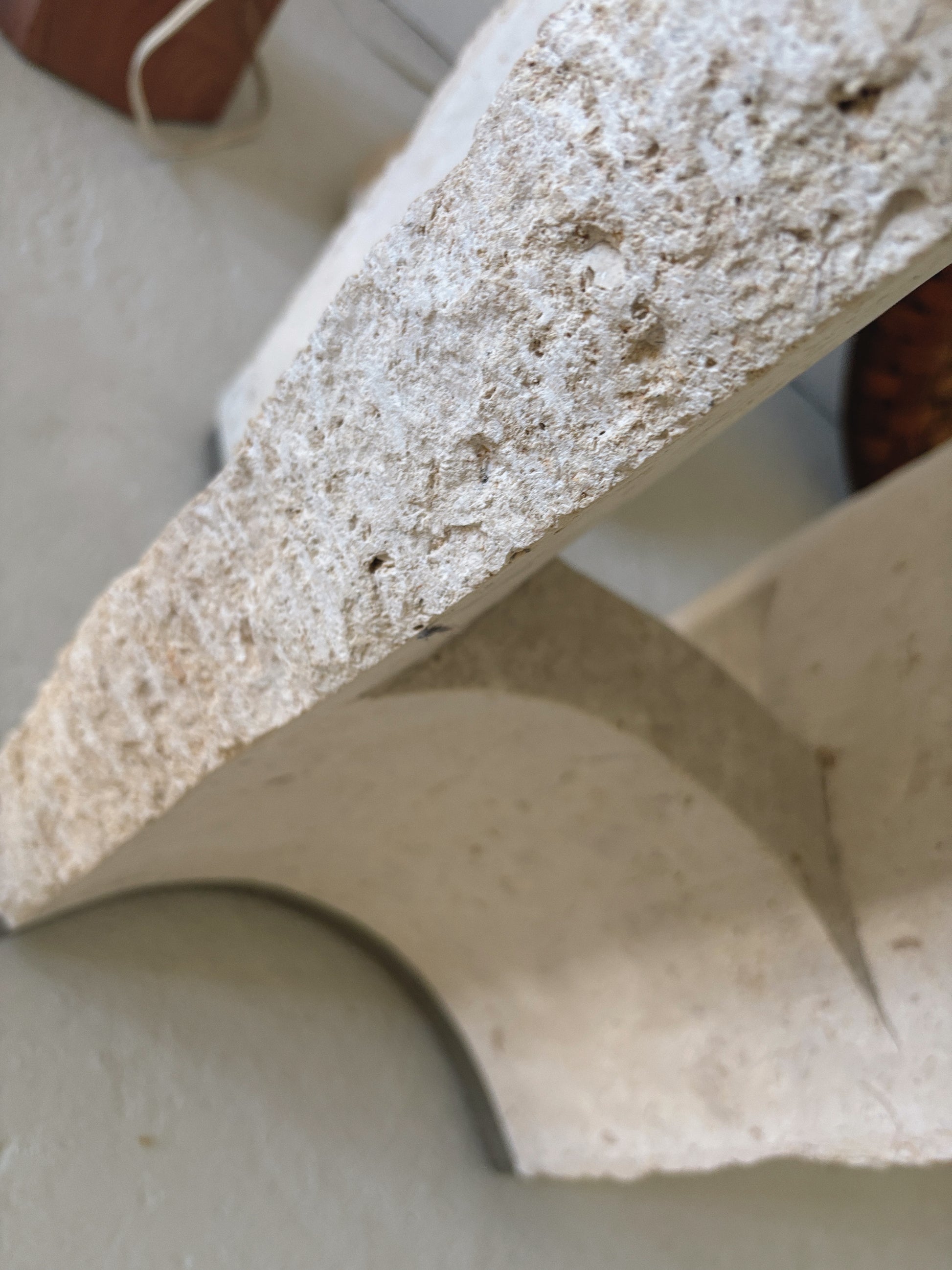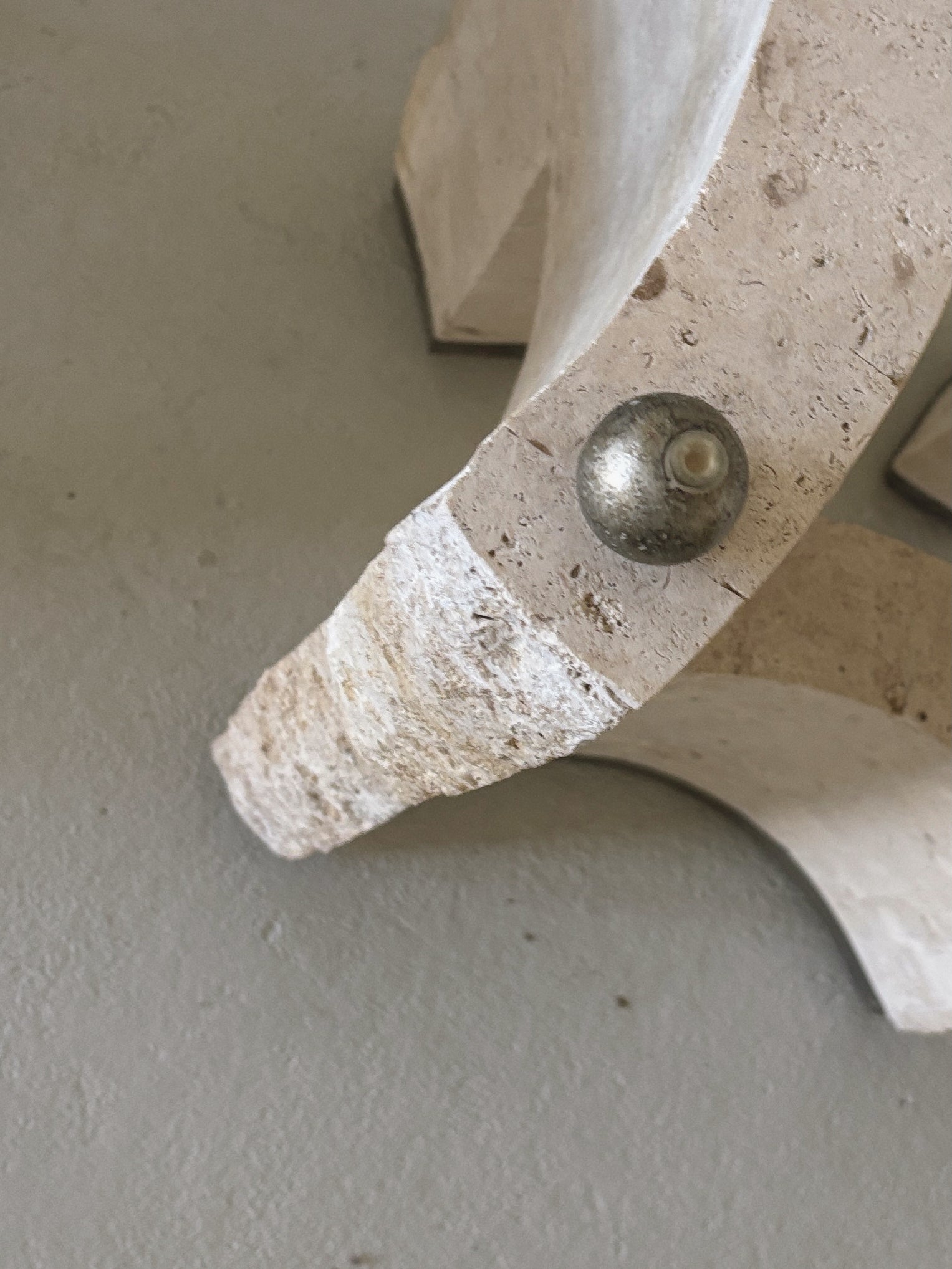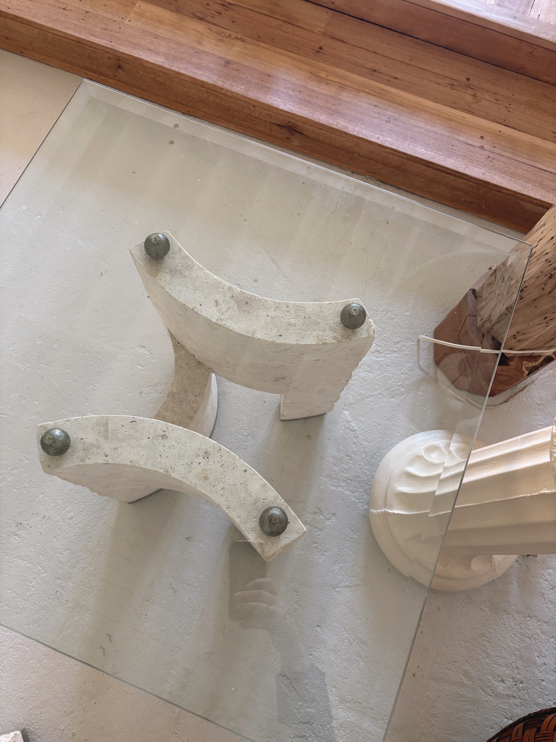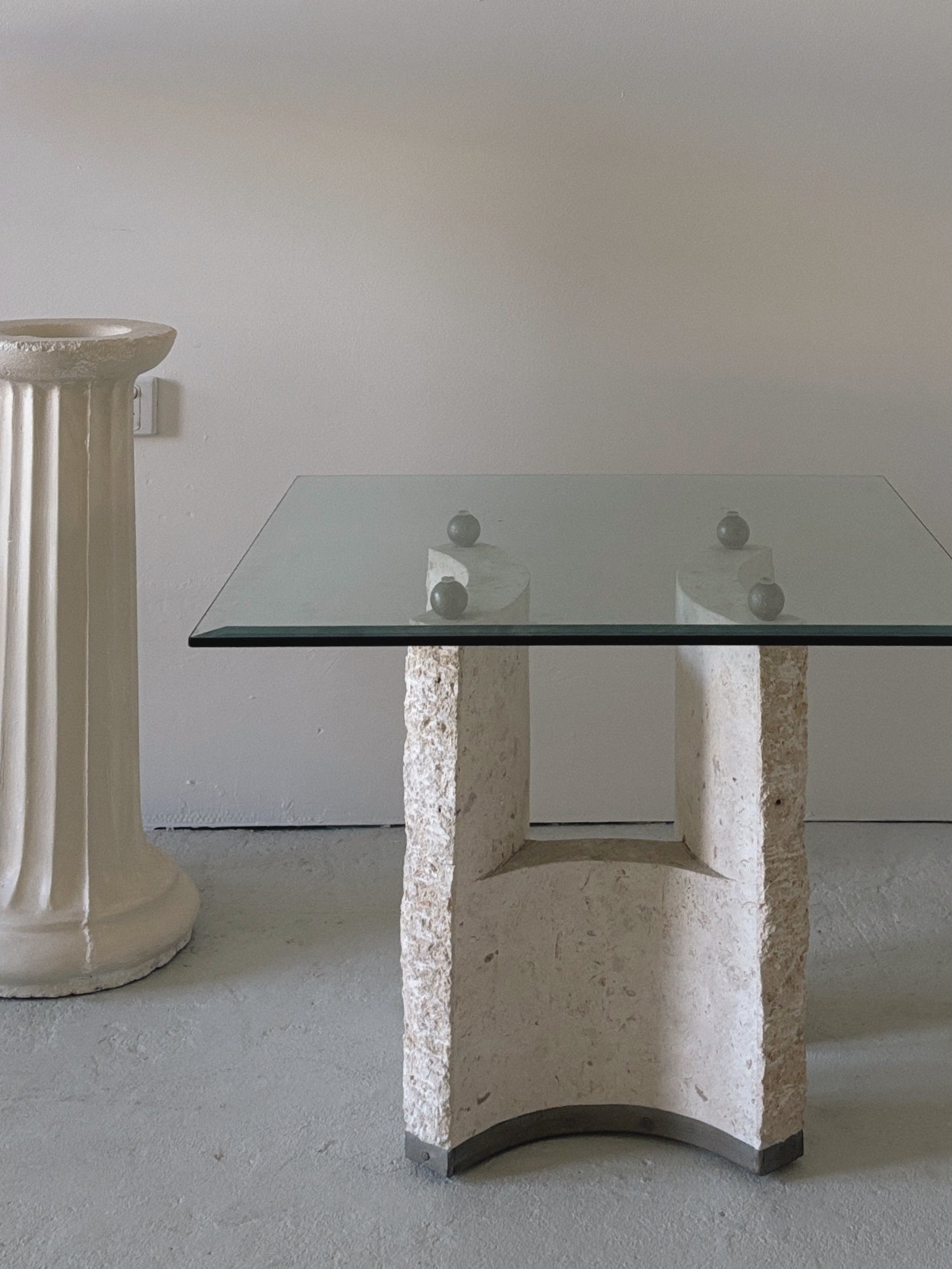 A unique detailed fossil stone side table circa 1980s in great vintage condition. There's something about stone textures that really works for us at the moment, and the ball detailing is soooo cool. Glass is intact with minimal signs of wear, please see pics. Base is timber frame coated as they used to do in the fossil stone. Really lovely for a bedside table or in a living area.