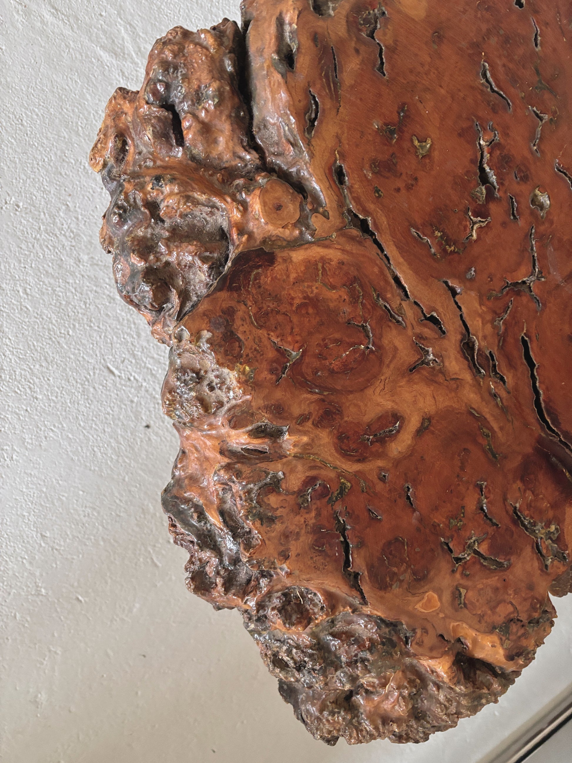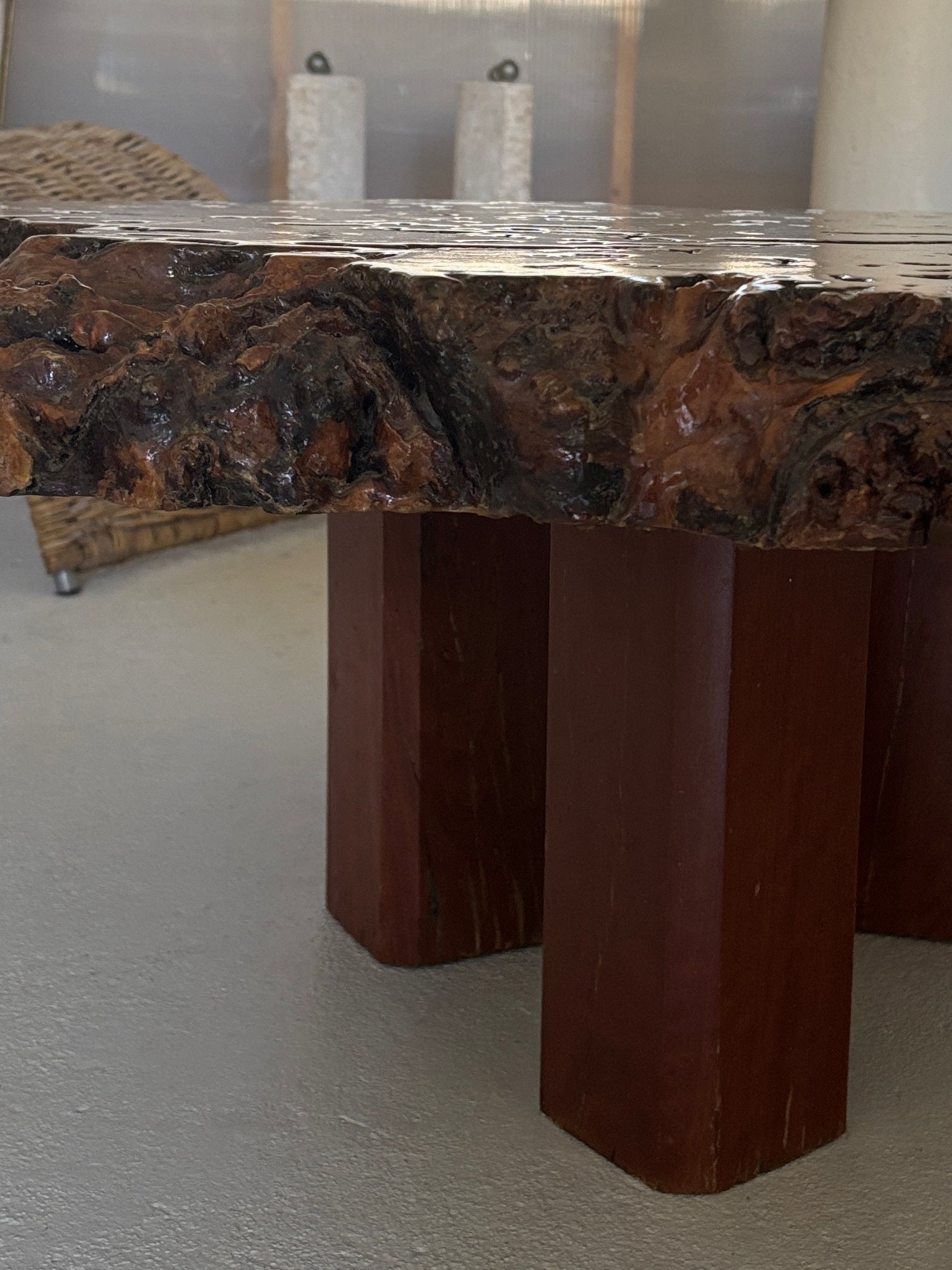 Dreamy organic shaped burl coffee table in great vintage condition. A lovely irregular shaped piece of solid redgum burl floats atop 3 chunky legs. The organic shape means it fits in beautifully amongst a living area or even as a larger side table. We've always wanted a piece like this and were so excited to find it! It's a bespoke piece, custom made, some wear consistent with age but presents beautifully. She's a heavy piece!