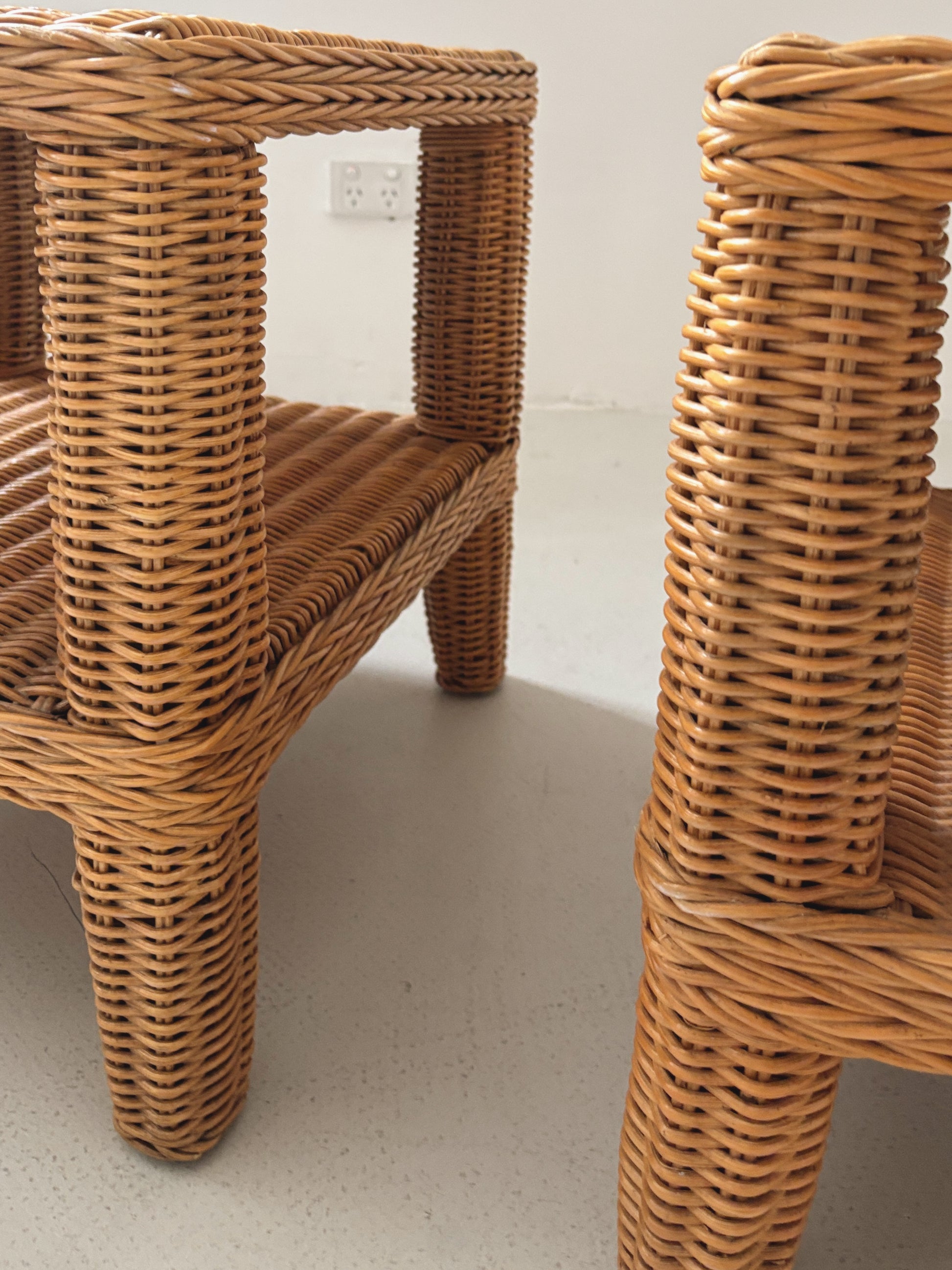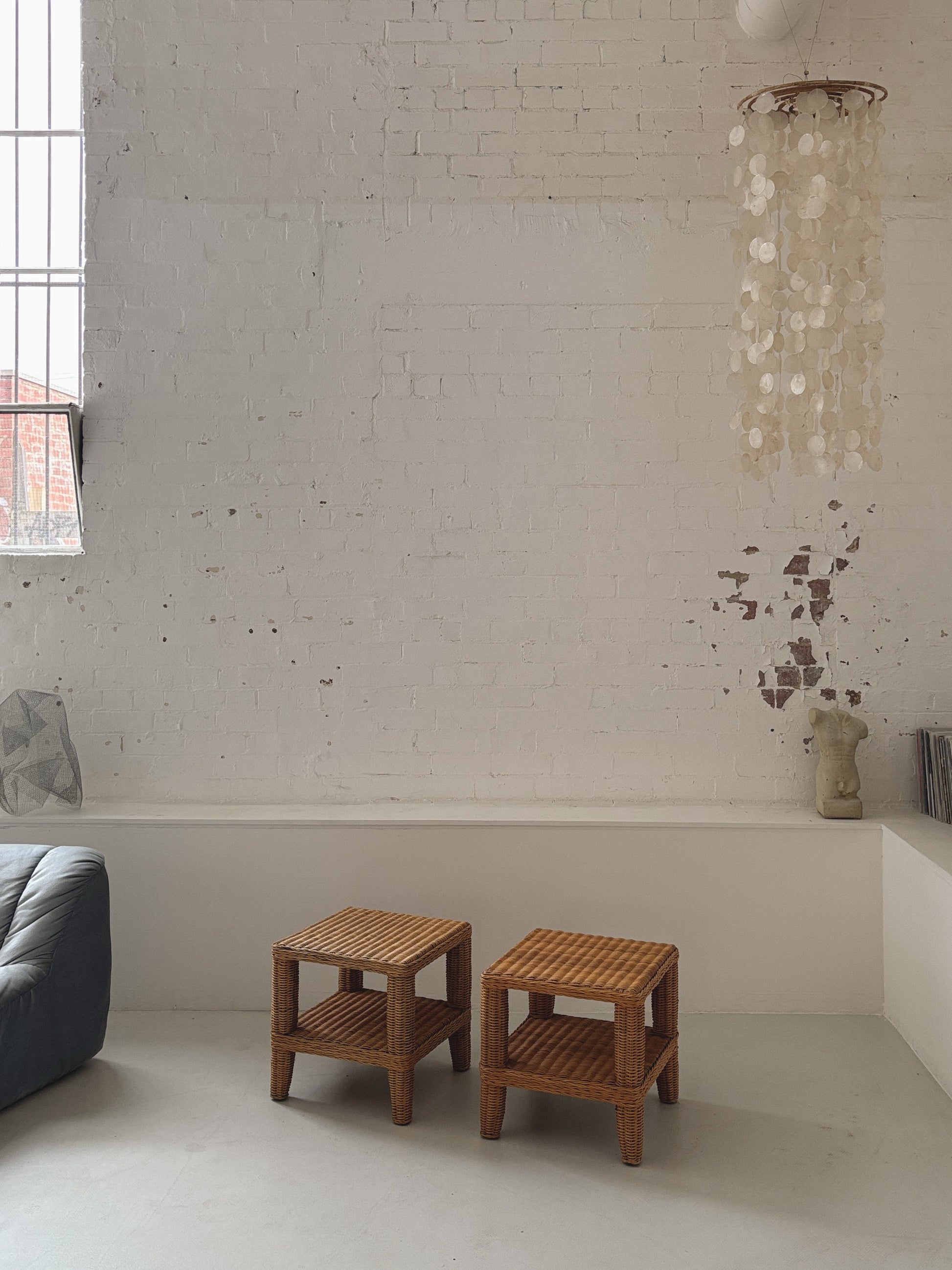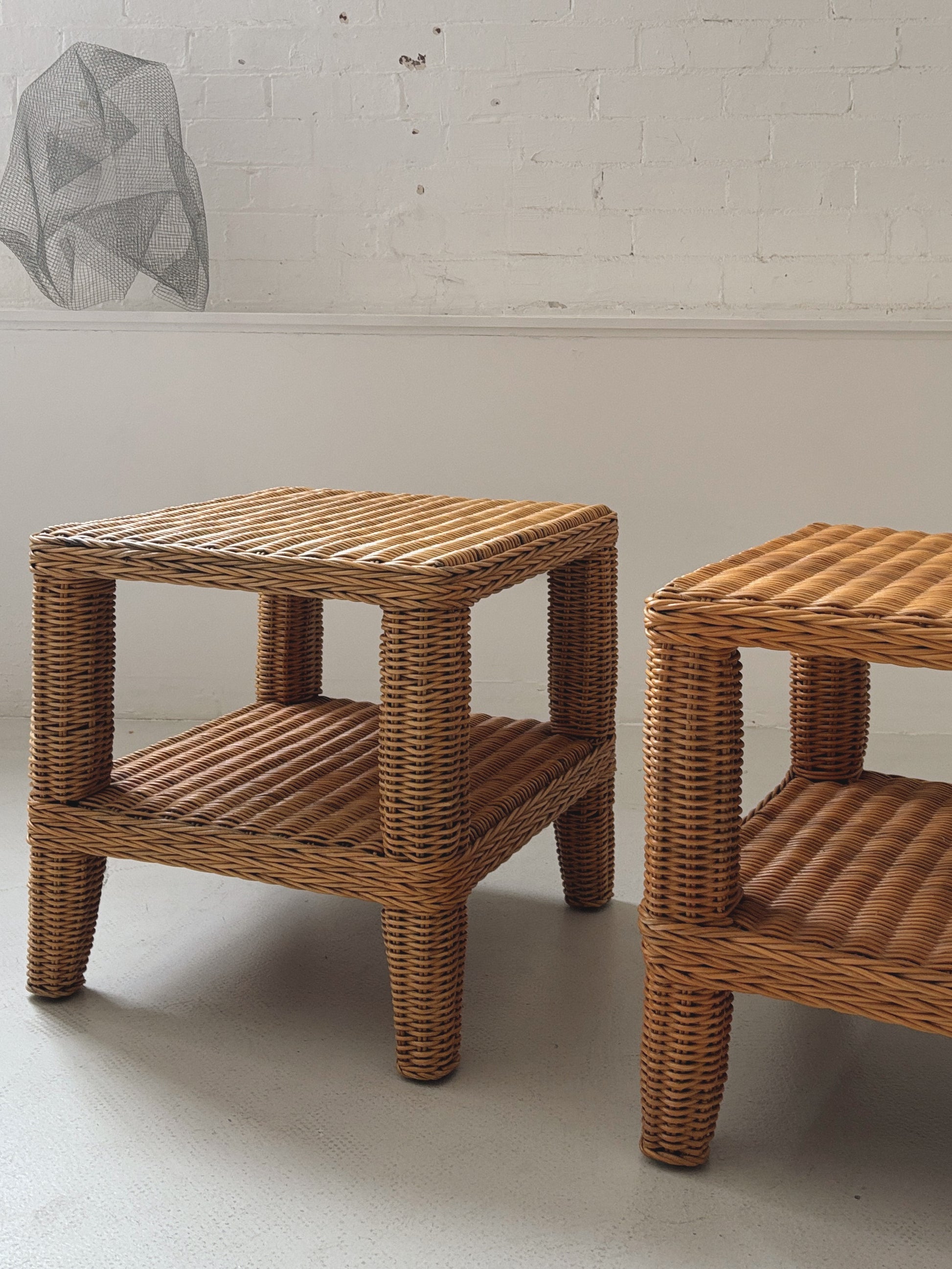 A pair of rattan bedside tables in great vintage condition. Circa 1990s, these are beautifully built, with minimalist lines and slightly flared feet. Very minimal signs of wear consistent with age, one is slightly lighter in colour than the other, not noticeable when placed either side of a bed! Some other small signs of wear but rattan is intact, please see pics.