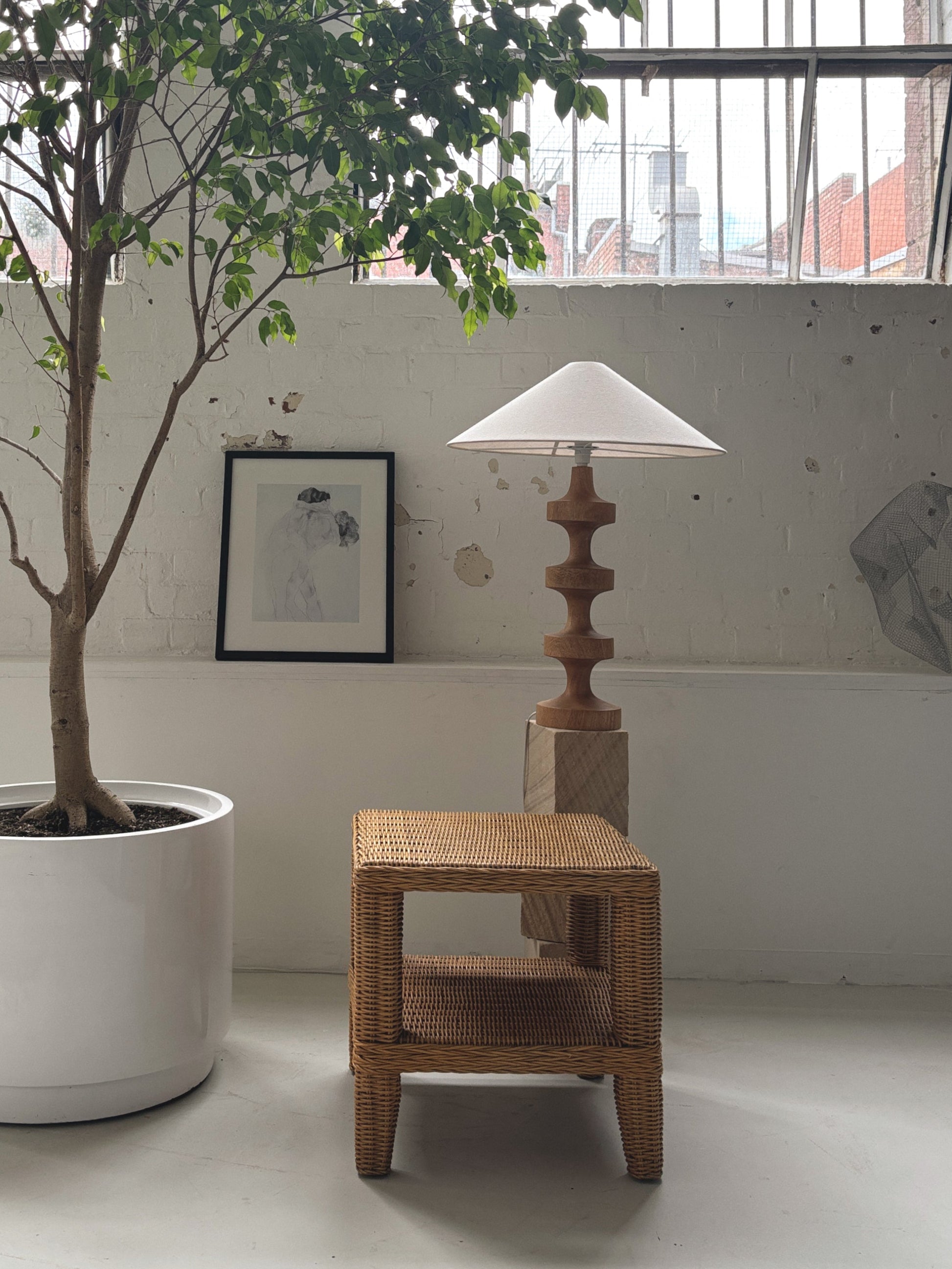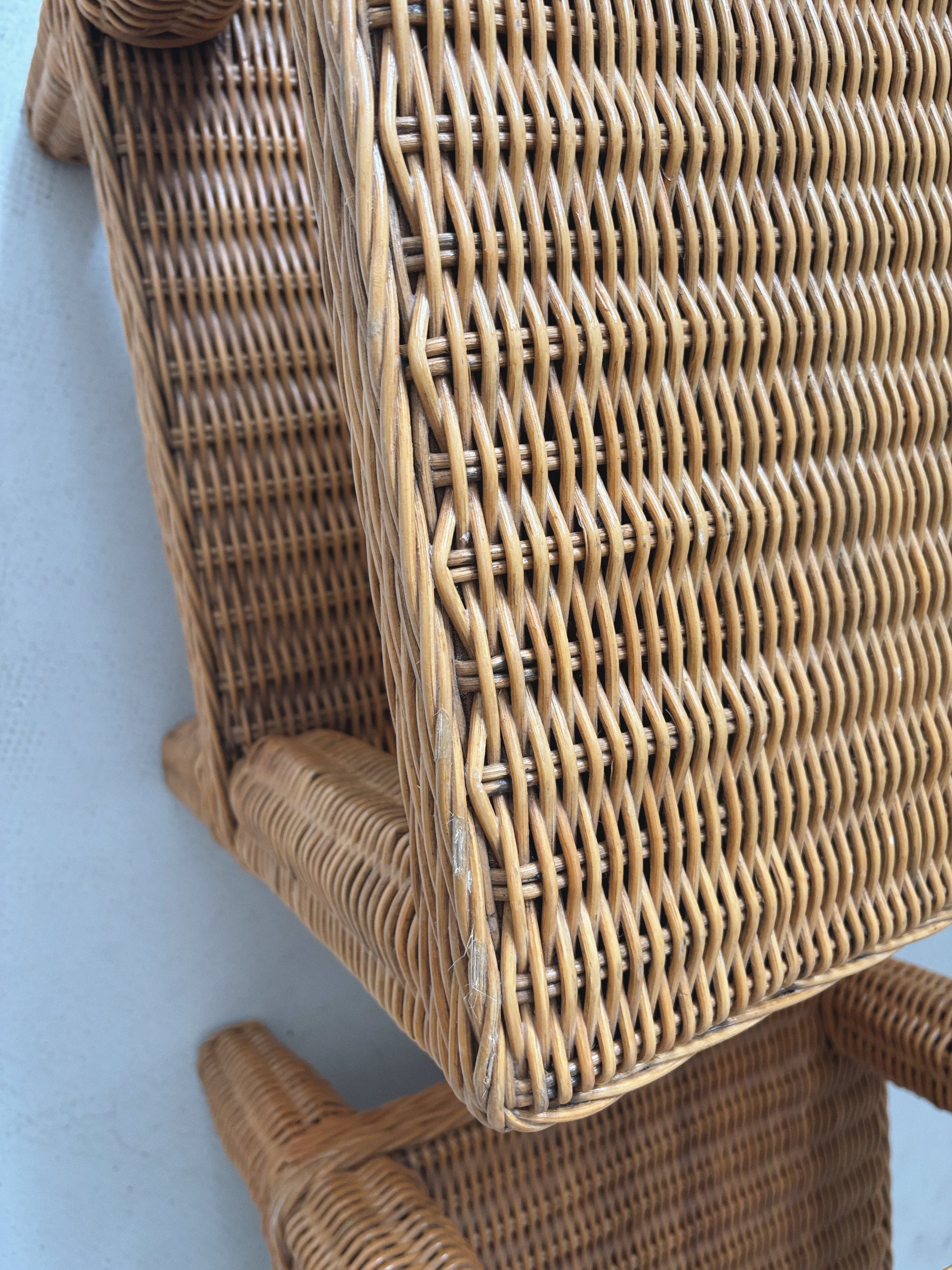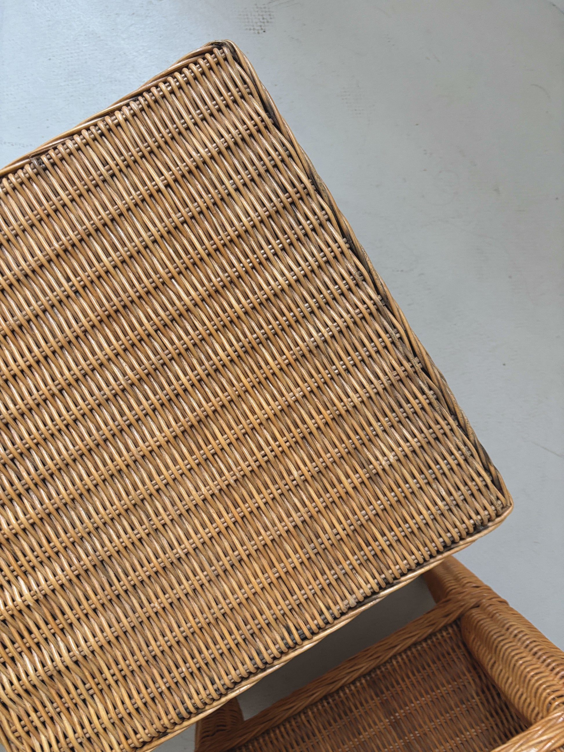 A pair of rattan bedside tables in great vintage condition. Circa 1990s, these are beautifully built, with minimalist lines and slightly flared feet. Very minimal signs of wear consistent with age, one is slightly lighter in colour than the other, not noticeable when placed either side of a bed! Some other small signs of wear but rattan is intact, please see pics.