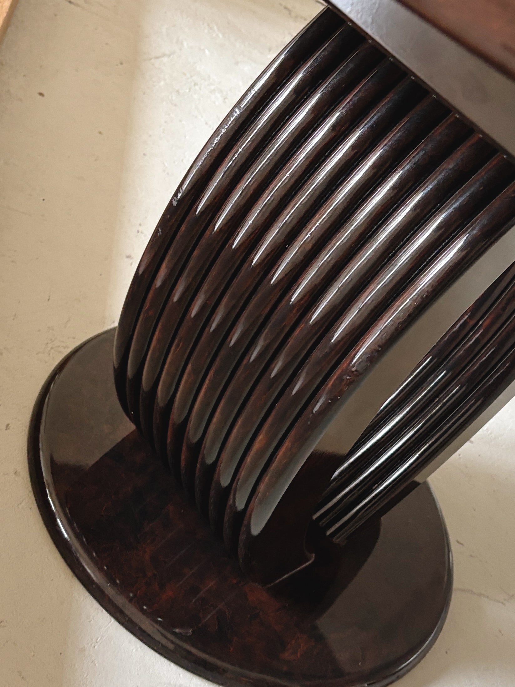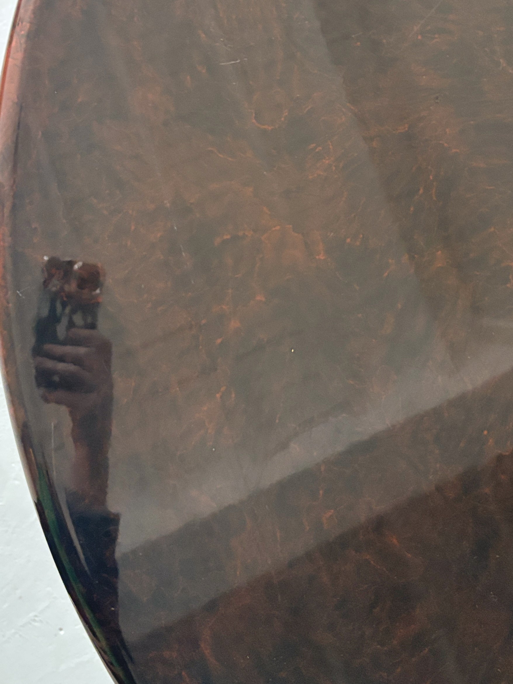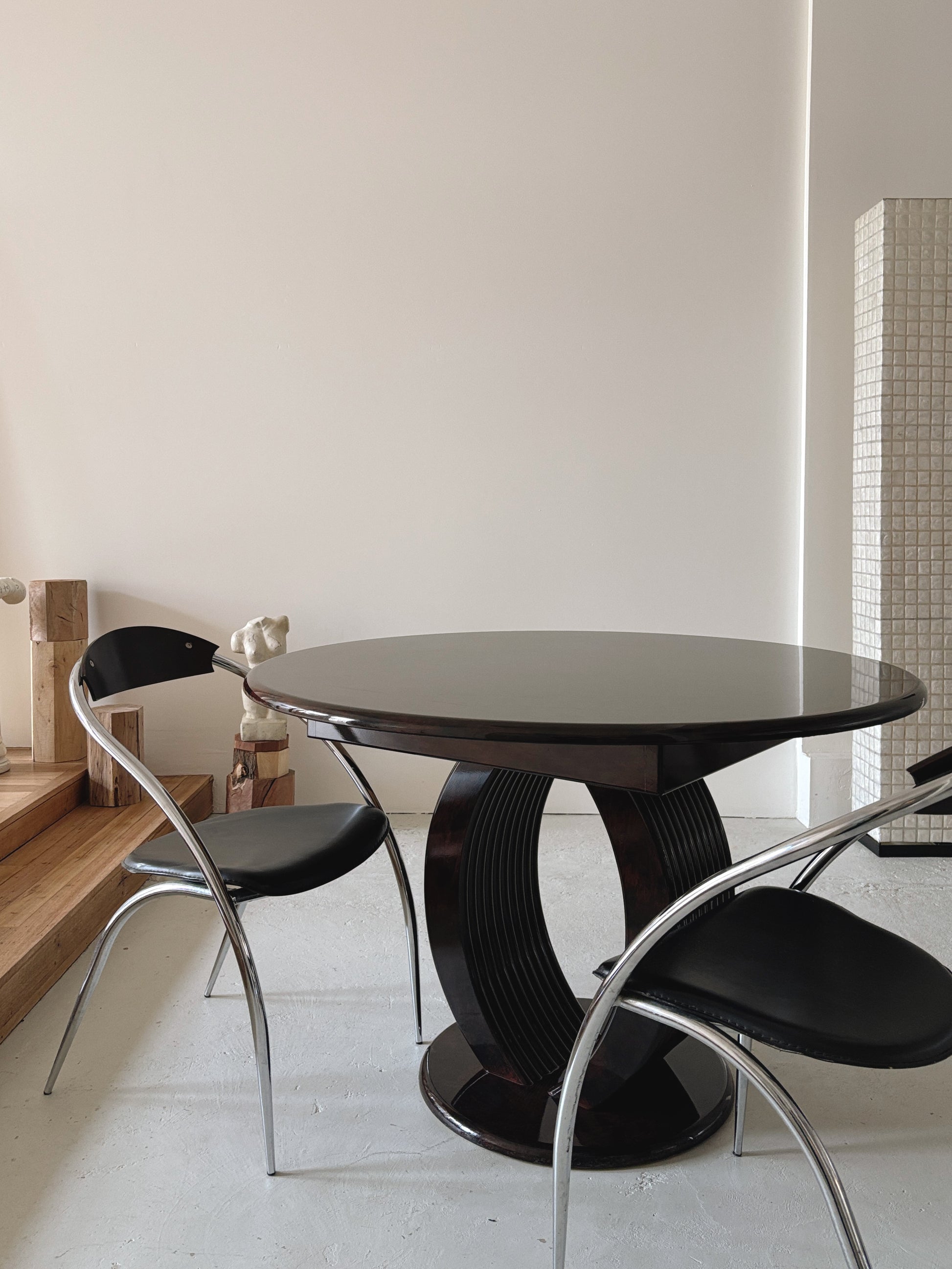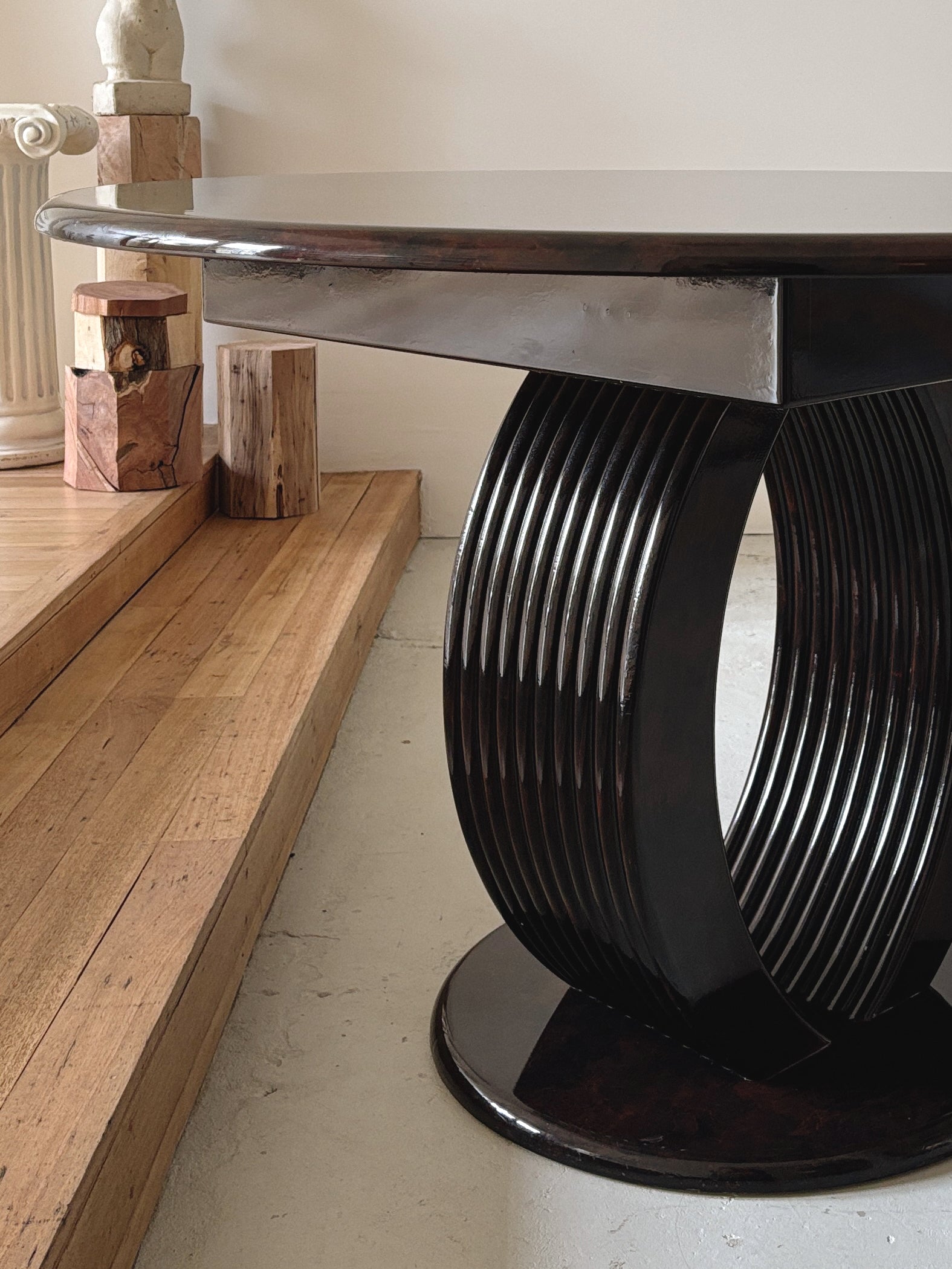Glossy 1980s burl pattern dining table in good vintage condition. Completely obsessed with this piece - so many of my Pinterest refs have similar proportions, particularly love the pedestal base with detailing, and of course the rich glossy burl pattern! A nice size at 120cm diameter, the top does separate from the base for easy transport.