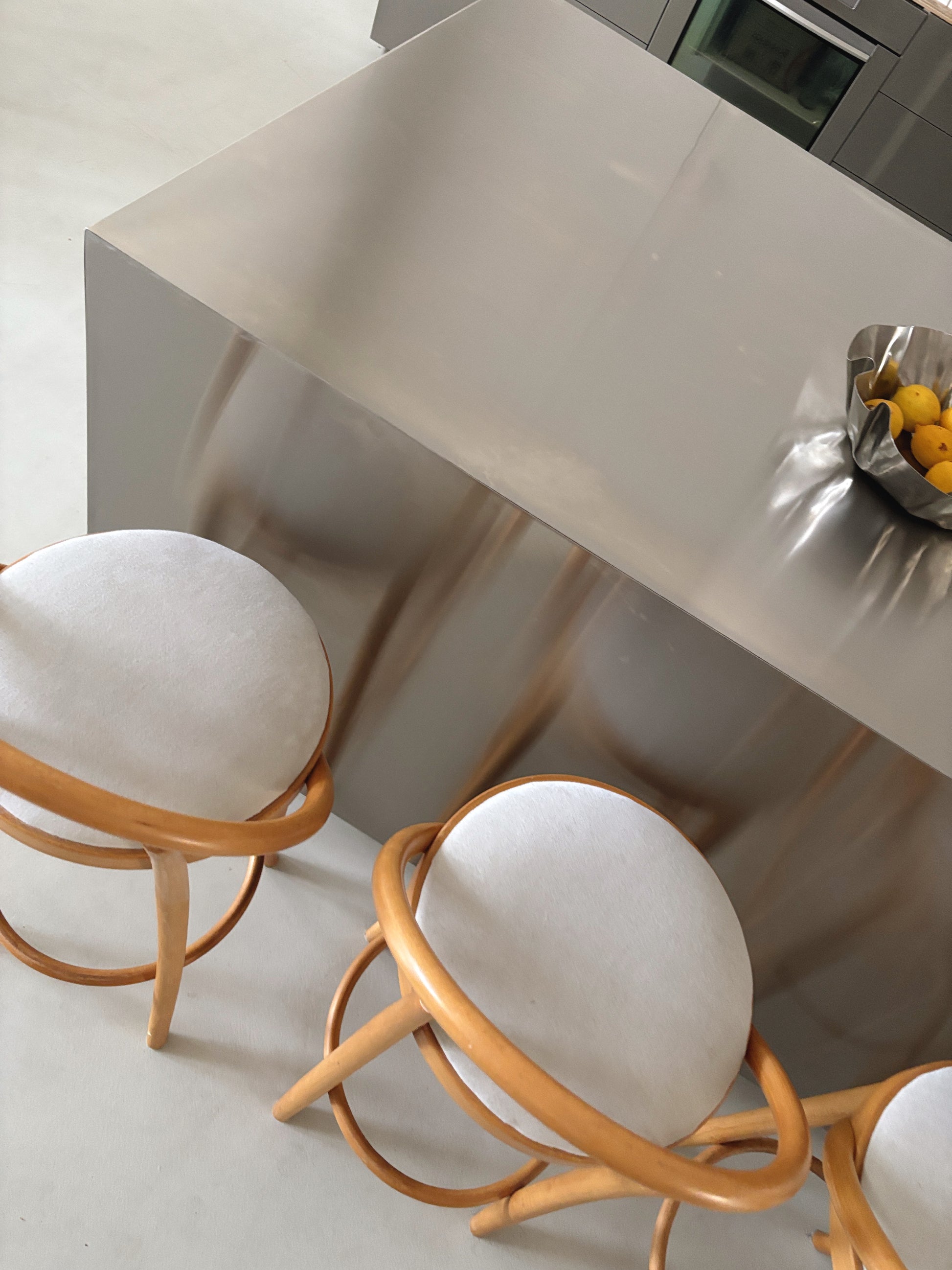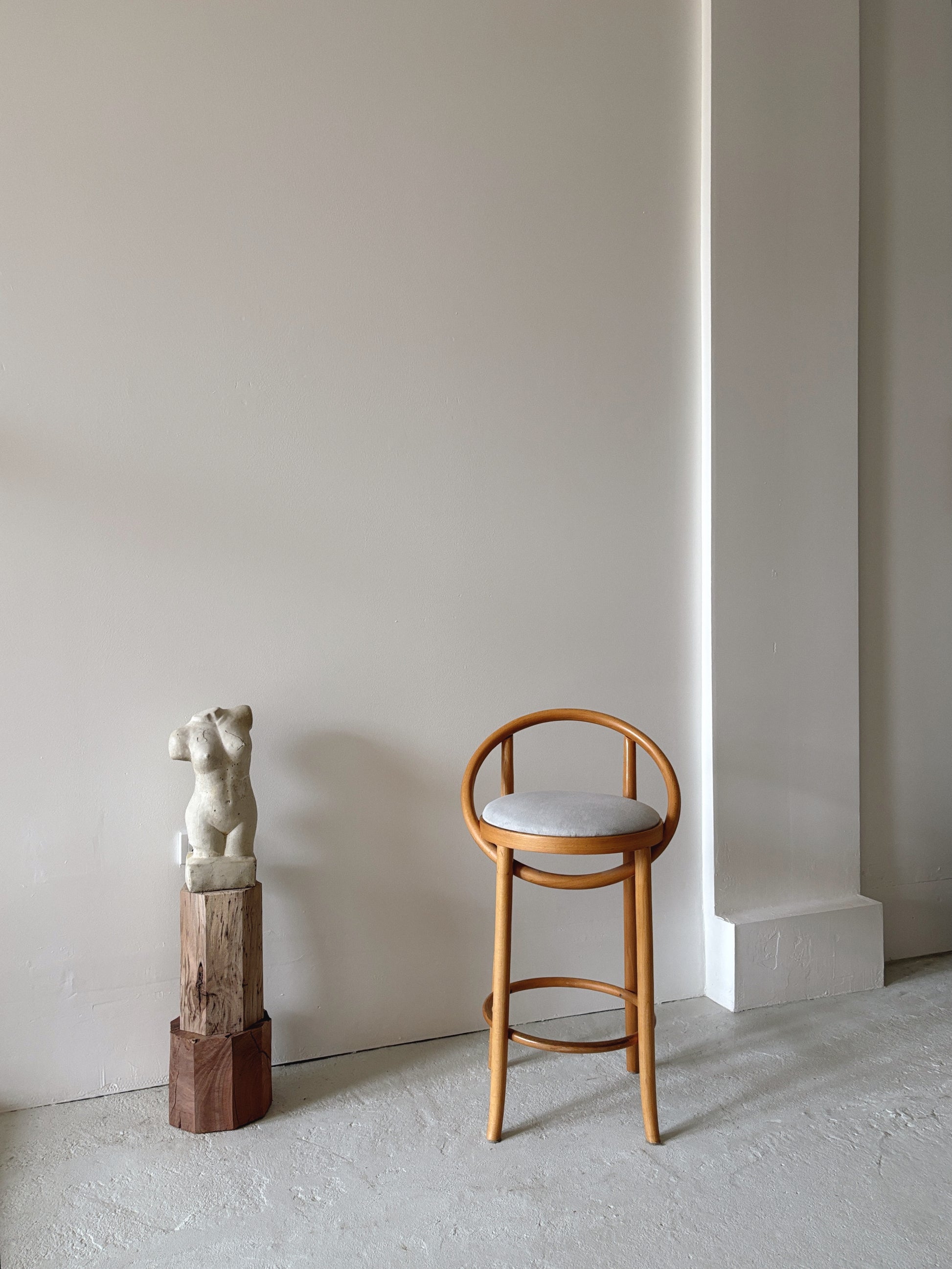 we have mocked up in images) Set x 3 unique 1990s bentwood counter stools in excellent vintage condition. Thonet inspired but with the coolest round circle detail backrest - these are just a stunning set. They have been upholstered in the past in a pale grey linen style fabric, you have the option to buy and enjoy as is, or choose custom upholstery from our list of Soft Focus House favourite fabrics (some of which . Lead time will be 2-3 weeks from purchase if you choosing custom upholstery. Please see details below on upholstery options, which will add an extra charge and then add to cart. Don't see a colour you're interested in? Let us know!