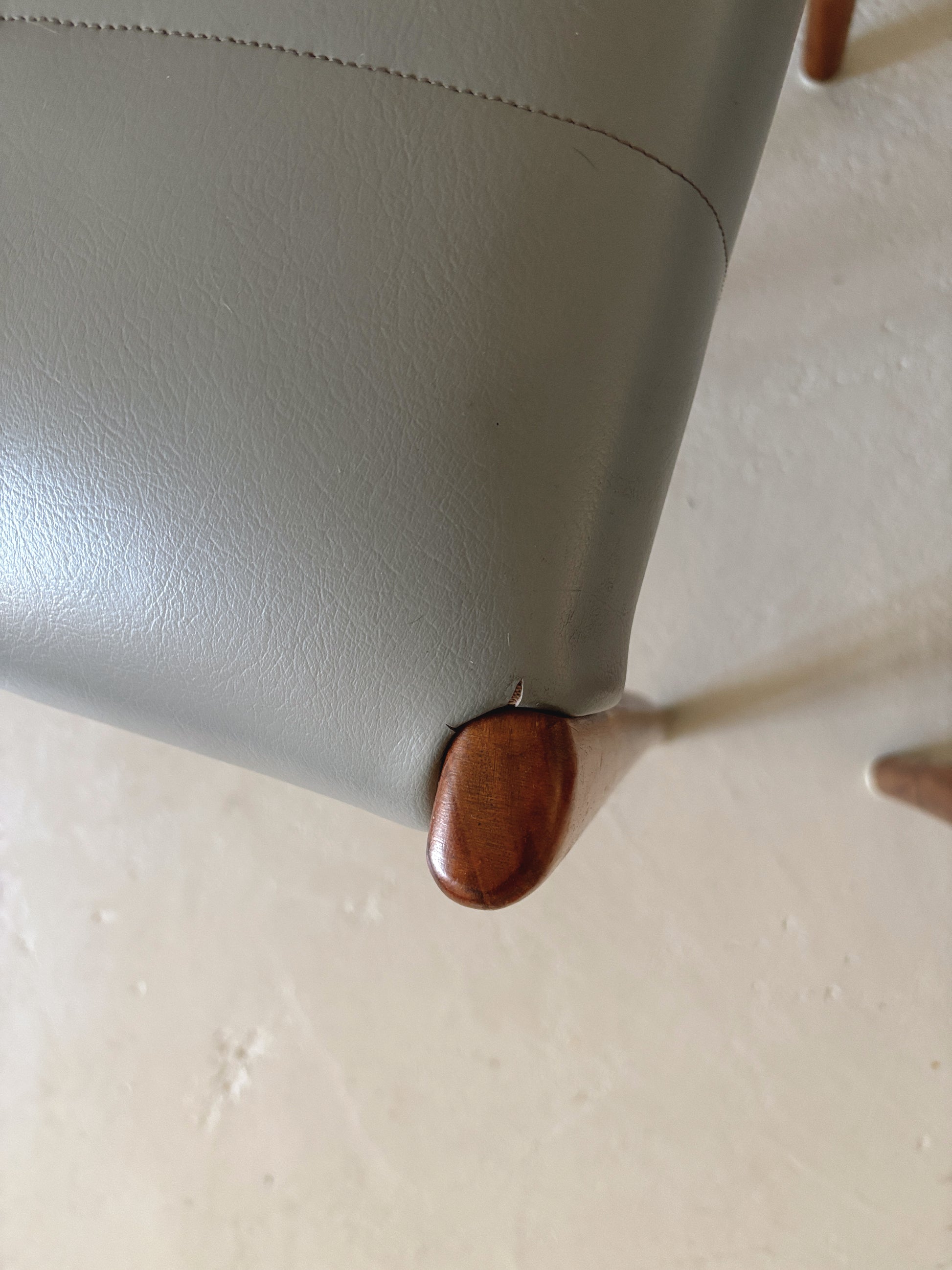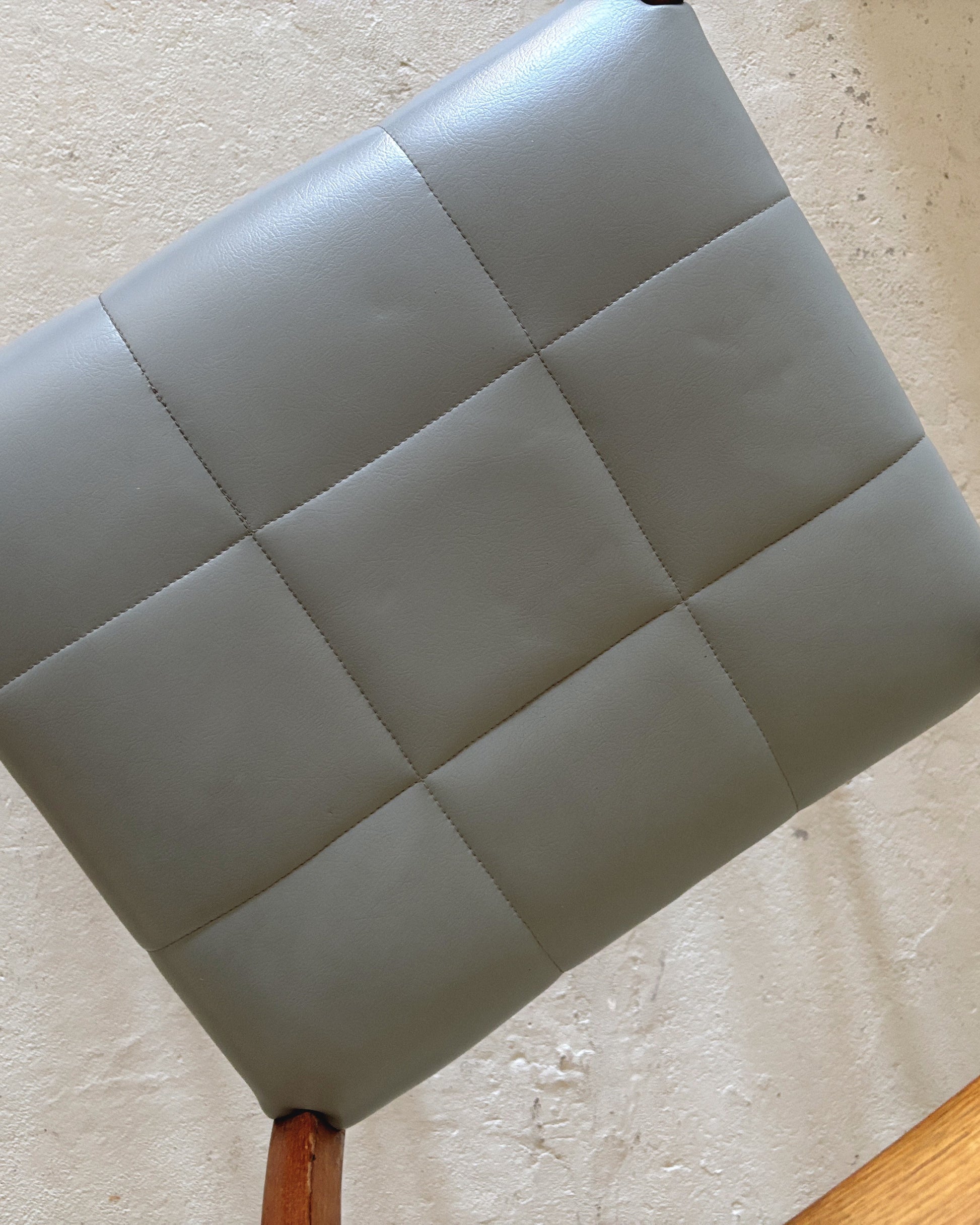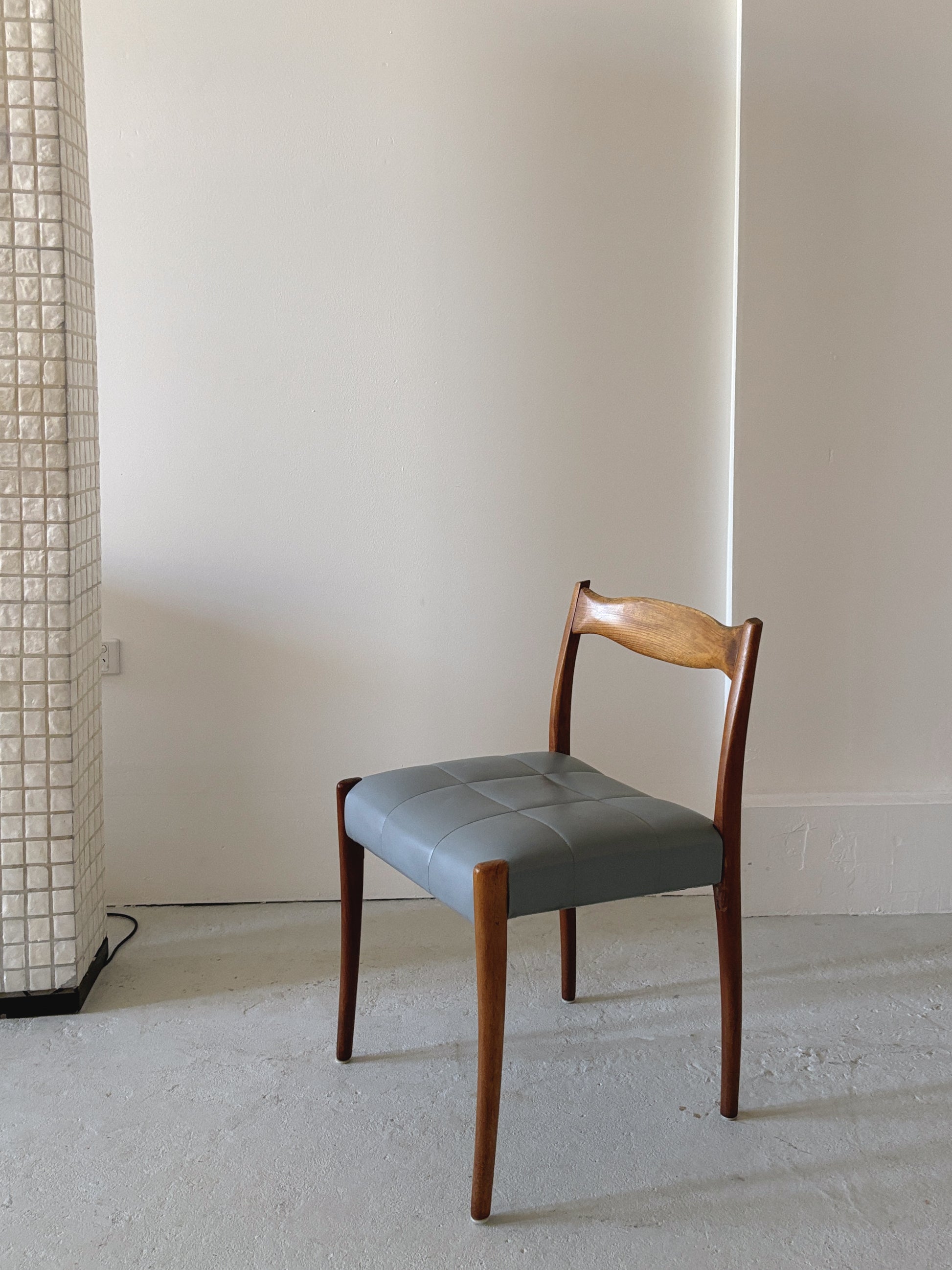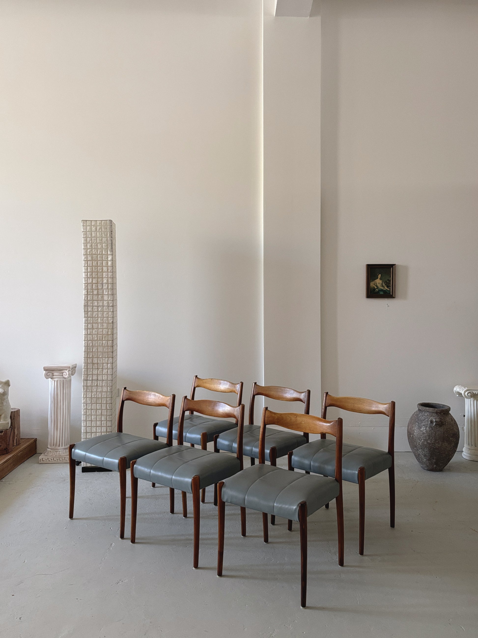 Set of 6 Fler 64 dining chairs circa 1964 in good original condition. Absolutely thrilled to have discovered these beauties, designed by Fred Lowen in the early 1960s, it's rare that we step over into the pure mid century space with our pieces but we are delighted nonetheless! They're in original condition, including the stunning original pale blue quilted vinyl seats and curved blackwood frames. They've been well loved, and are still a lovely set to use as is. There is some wear and tear consistent with age and use present, a couple of the chairs have some very small splits in the vinyl and one of the legs on one of the chairs has been repaired at some point - please see pics. The seat colour is slightly more blue in person - it is most accurately represented in the more zoomed out images, not the close details of the seats where it appears more grey.