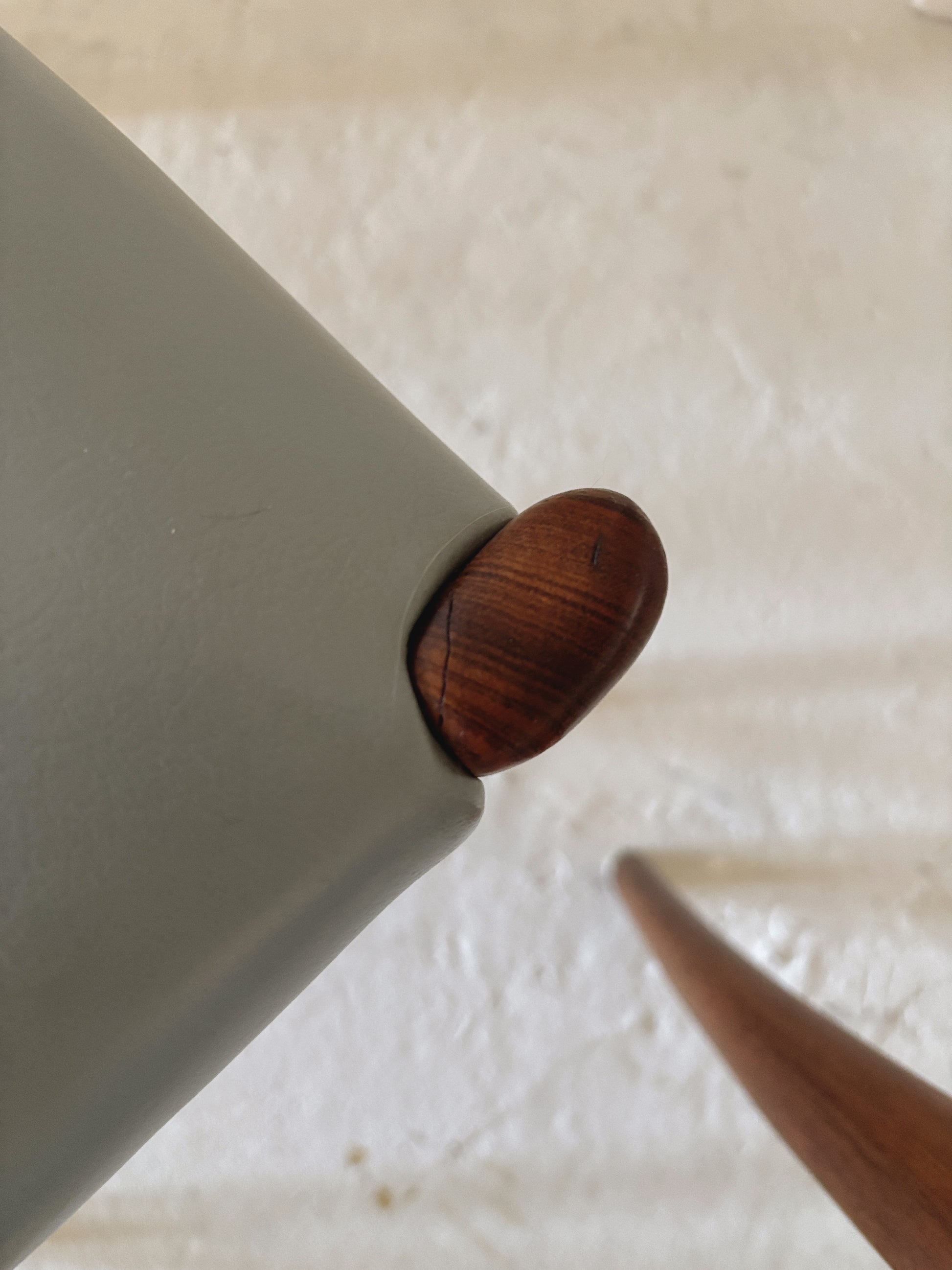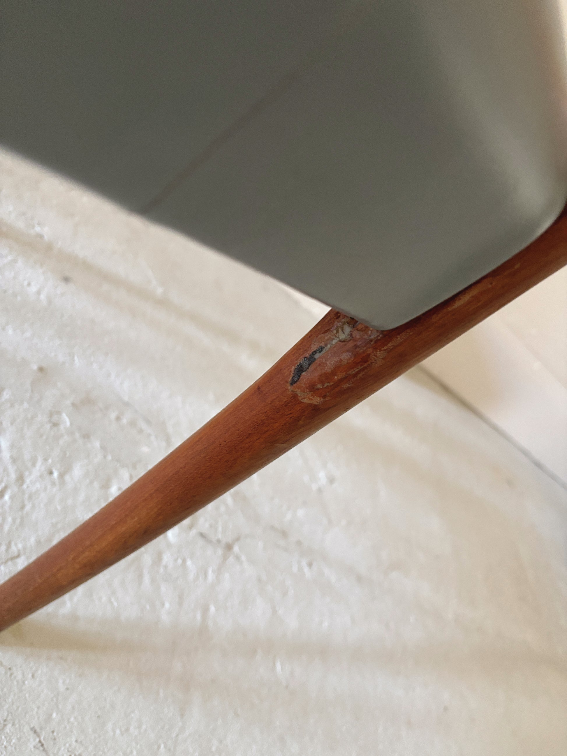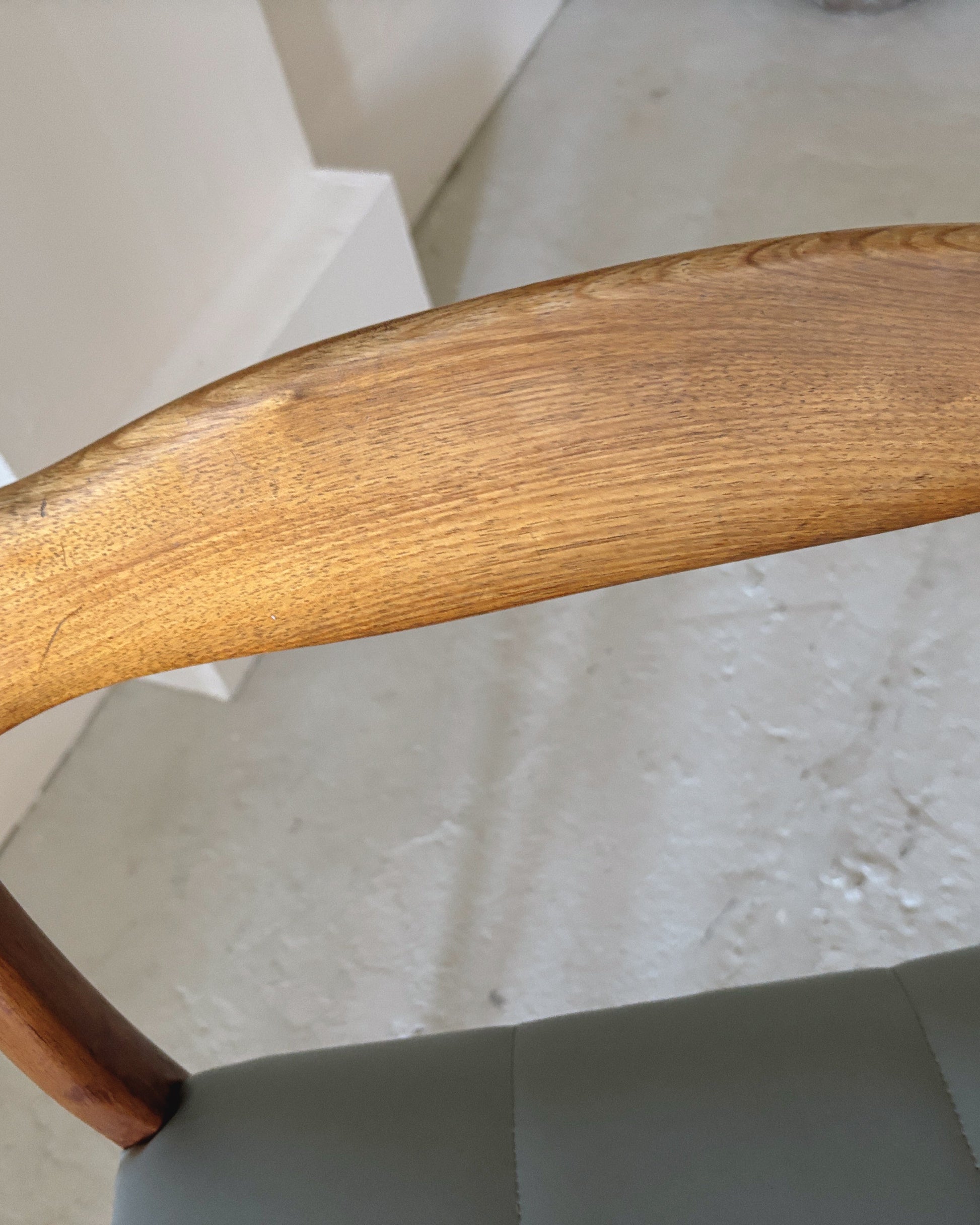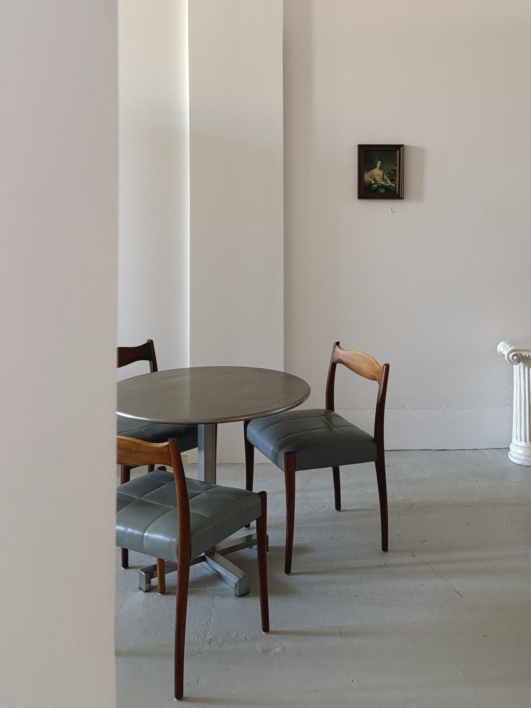 Set of 6 Fler 64 dining chairs circa 1964 in good original condition. Absolutely thrilled to have discovered these beauties, designed by Fred Lowen in the early 1960s, it's rare that we step over into the pure mid century space with our pieces but we are delighted nonetheless! They're in original condition, including the stunning original pale blue quilted vinyl seats and curved blackwood frames. They've been well loved, and are still a lovely set to use as is. There is some wear and tear consistent with age and use present, a couple of the chairs have some very small splits in the vinyl and one of the legs on one of the chairs has been repaired at some point - please see pics. The seat colour is slightly more blue in person - it is most accurately represented in the more zoomed out images, not the close details of the seats where it appears more grey.