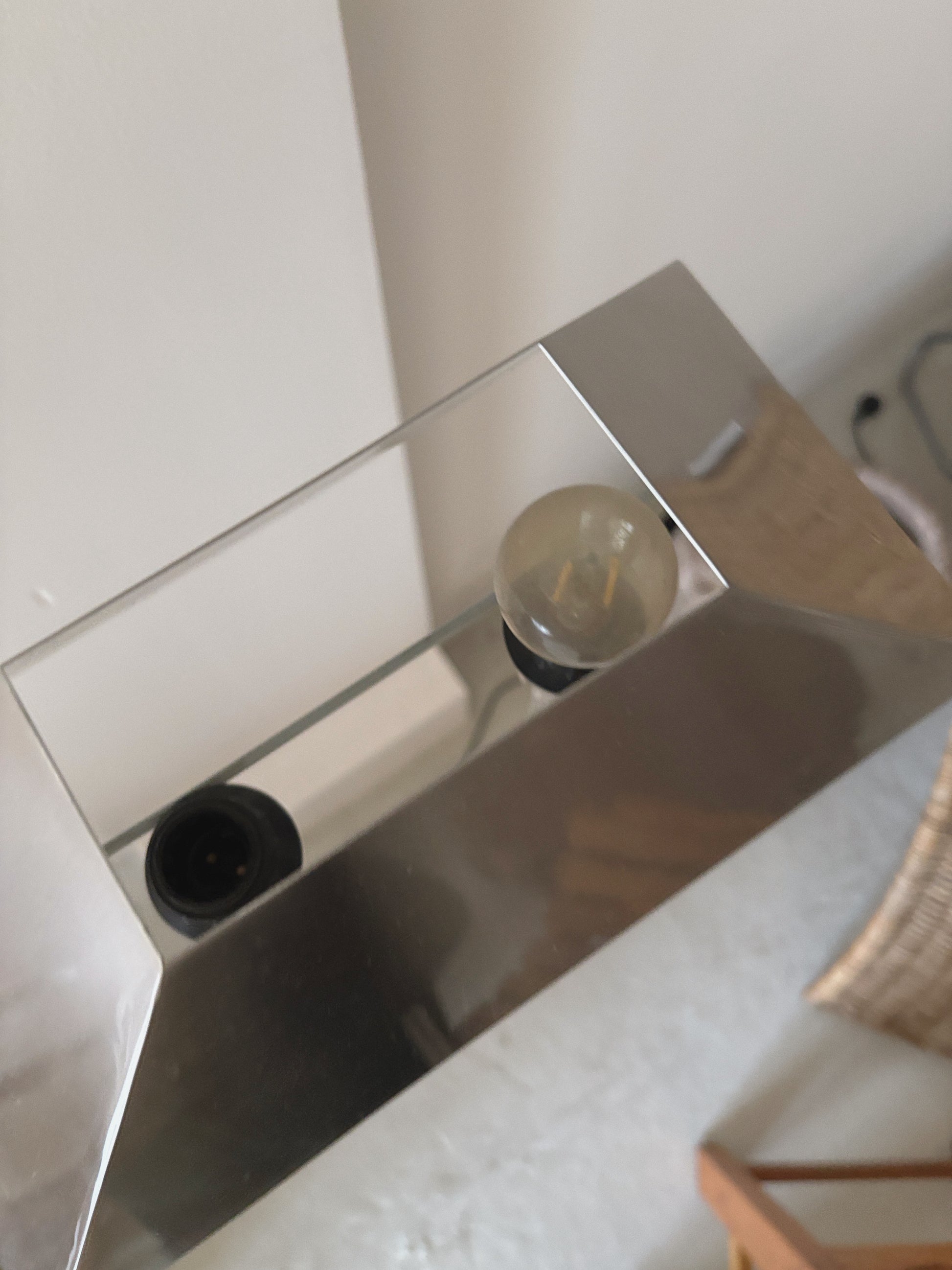 Incredible post modern stainless steel floor lamp in great preloved condition. My dream lamp - with a stainless steel shade to seal the deal! Can't believe I'm letting go of this one but it's too good not to share. A spot for 2 bulbs and a foot switch, some light wear visible on the base consistent with age and a few tiny marks on the shade.