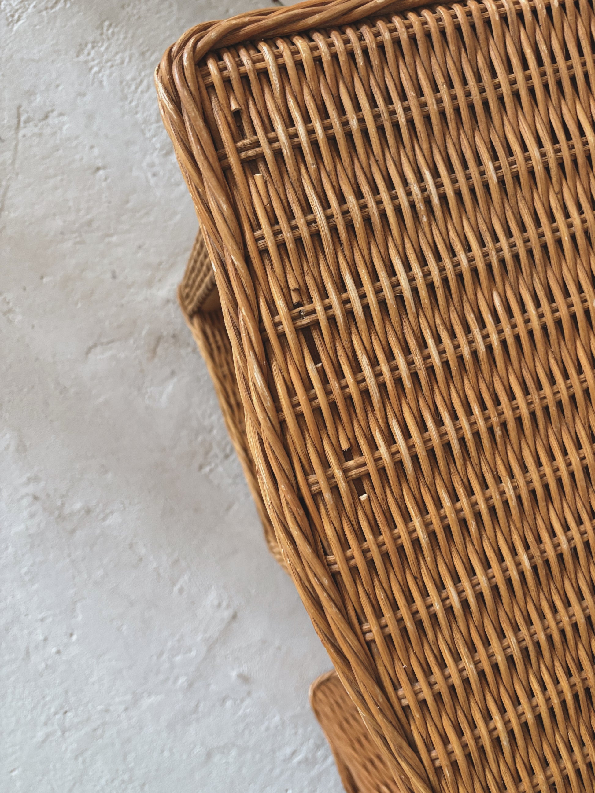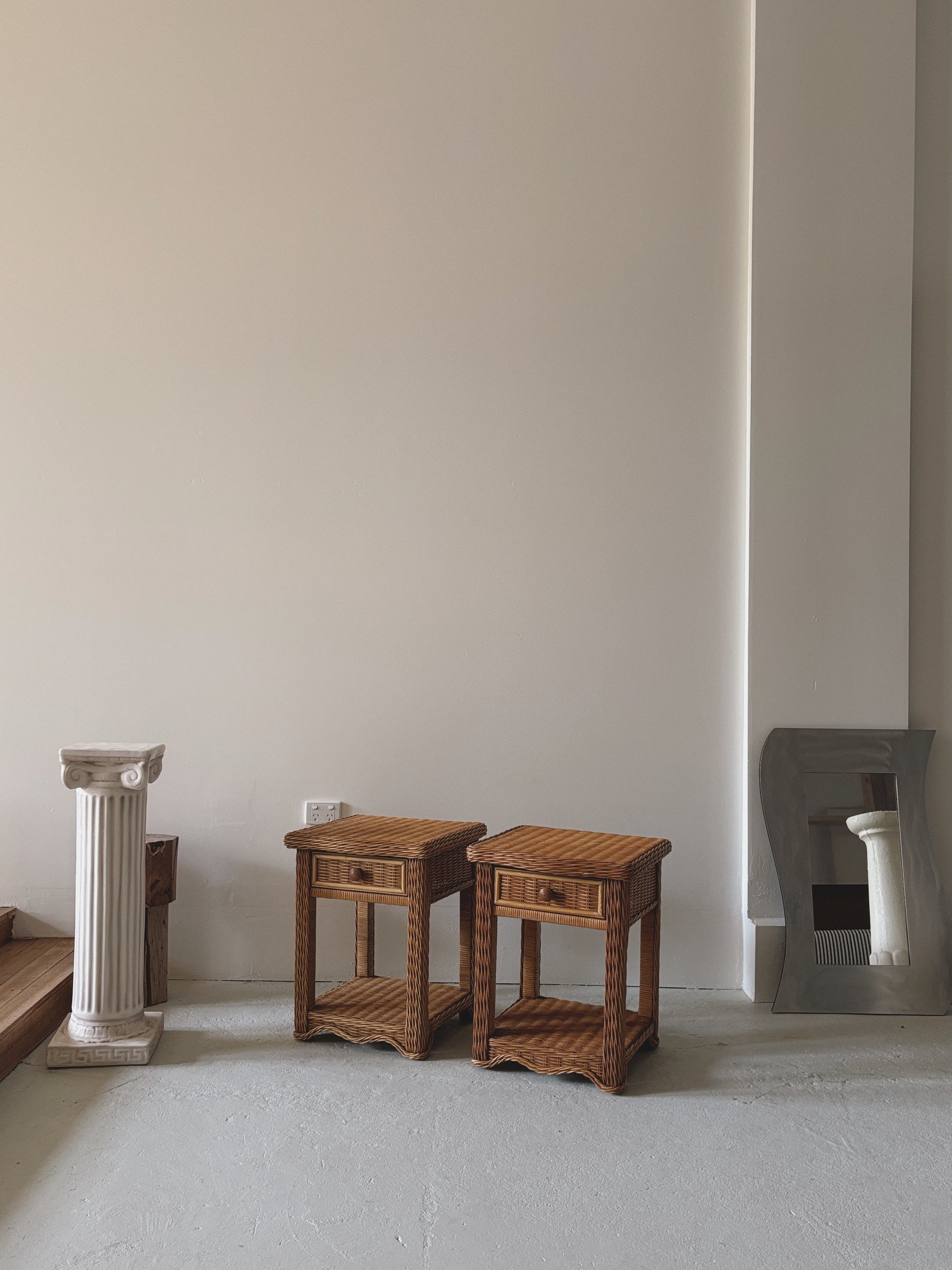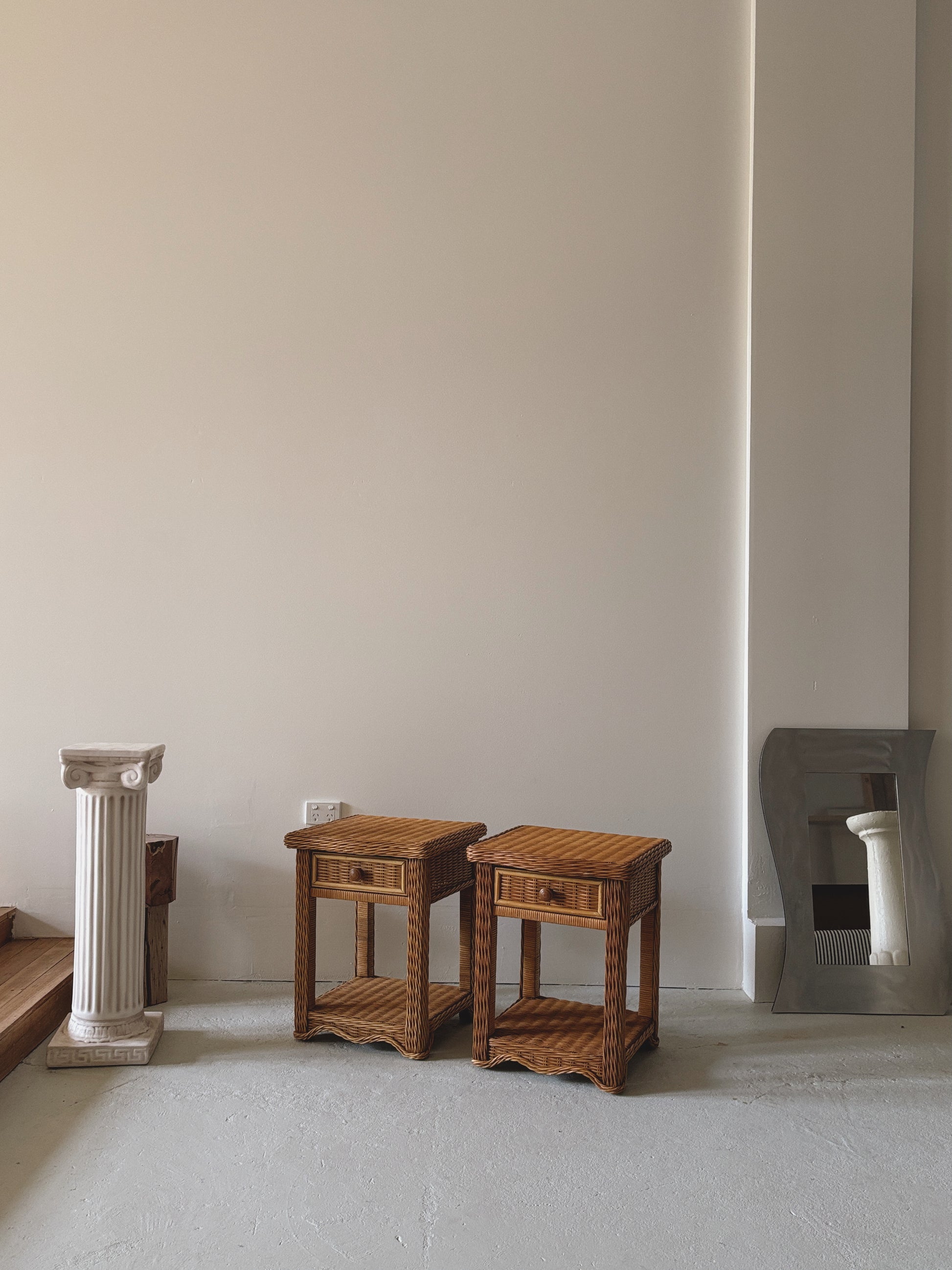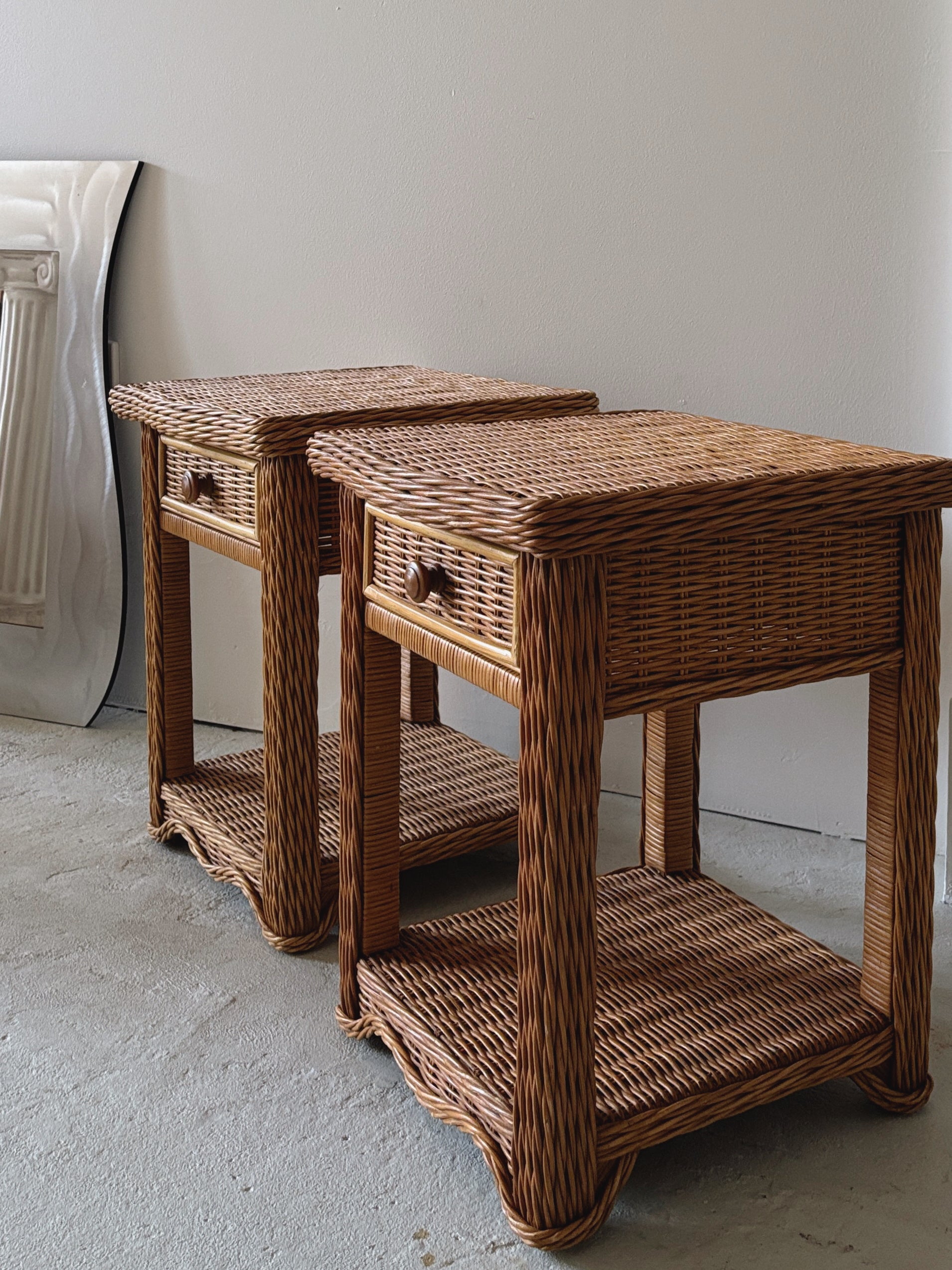 Vintage rattan bedside tables in very good vintage condition. No words for these - the wavy base - what a detail! These are roughly circa 1980s, drawers open and close well, some wear and tear consistent with age - namely a few small breaks in the rattan on one of the tops. A dreamy set!