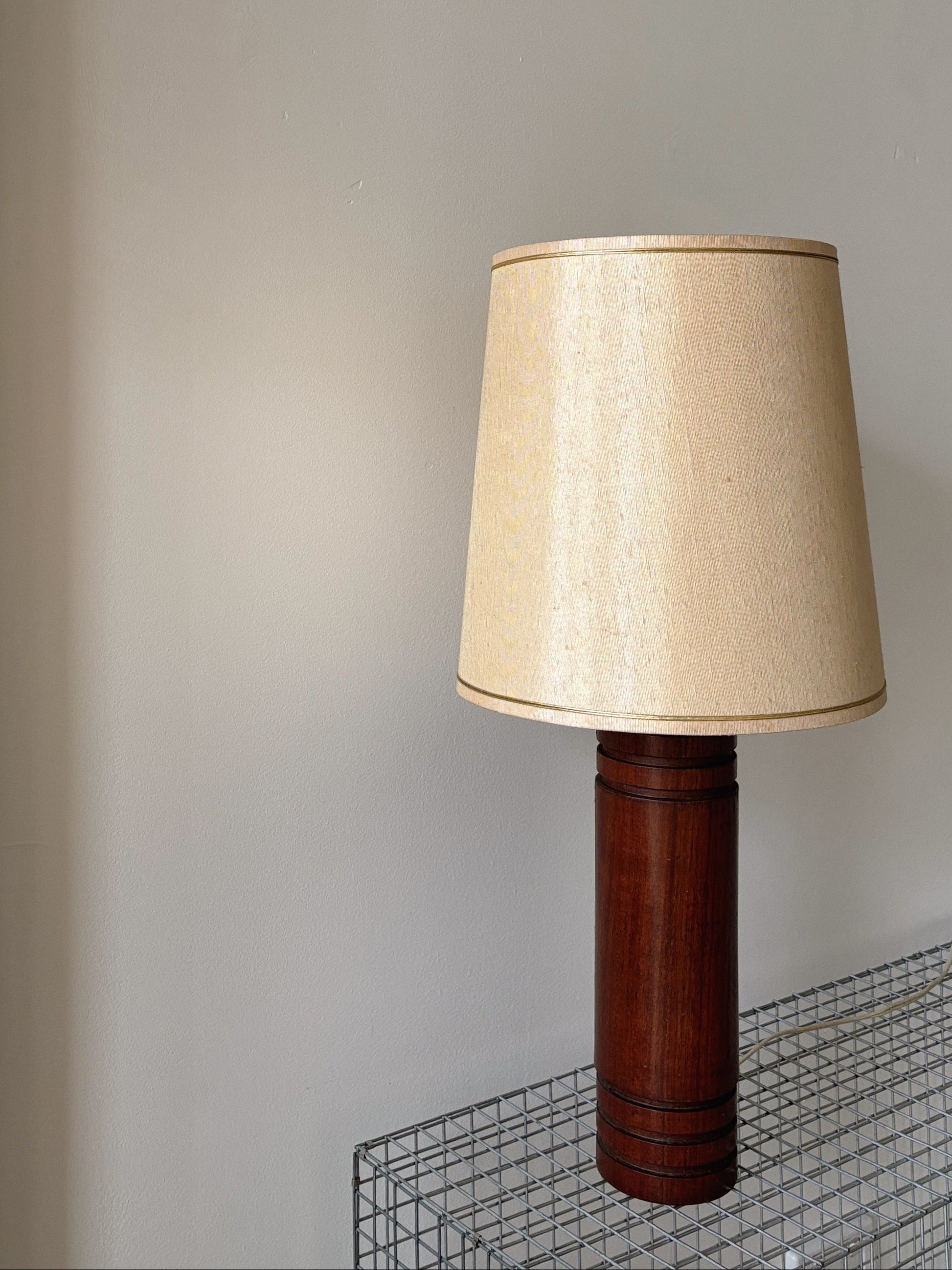 Vintage timber table lamp in great vintage condition. We've kept the original shade that has a slight sheen, it's the most gorgeous elongated tapered shape we couldn't not! Gorgeous carved detailing in the base, it's in good working order and a stunning piece. Please see pics for minor signs of use consistent with age.