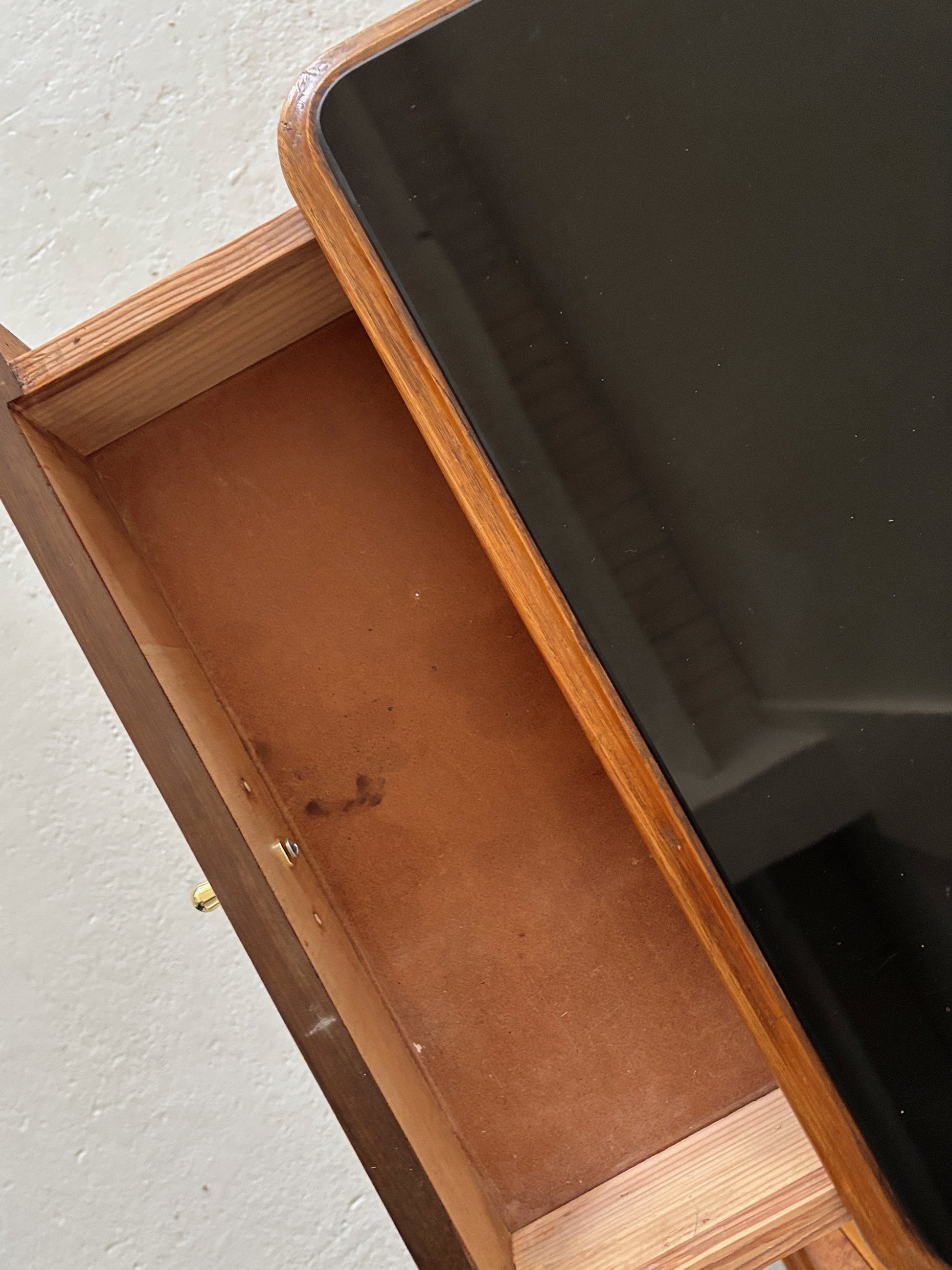 Incredible bespoke 1960s burl bedside tables in great vintage condition. The most intricate burl pattern on these beauties - we have gently removed the old finish on the fronts of the unit and the old broken hardware to let the original detailing shine through. Extremely sturdy, handmade by the previous owner's father in the early 1960s, these are a special pair! Each piece has one drawer and one cupboard with internal shelving (fixed). There are some signs of wear consistent with age still present, we have left the sides in the original finish and there is some areas of wear still visible, including on the interior, there are some signs of where the old handles used to exist, please see pics for details. Glossy black top is original and shows some light scratches.