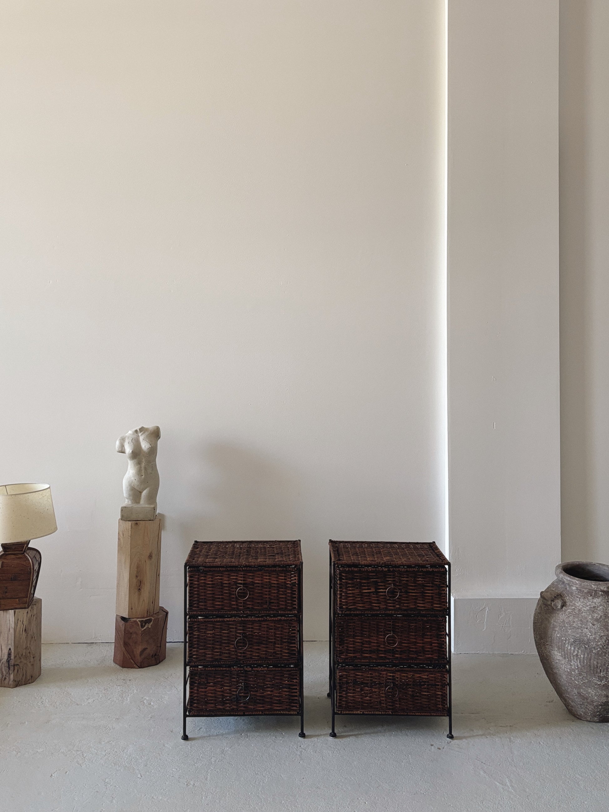 Dark rattan + wrought iron bedside tables in great vintage condition. Circa 1990s, these are soooo beautiful and perfect for slimmer bedside areas. The texture of this chocolatey coloured rattan in combination with the original handles make these a lovely variation on timber for bedside storage. Some small signs of wear consistent with age, please see pics. Price is for the set.